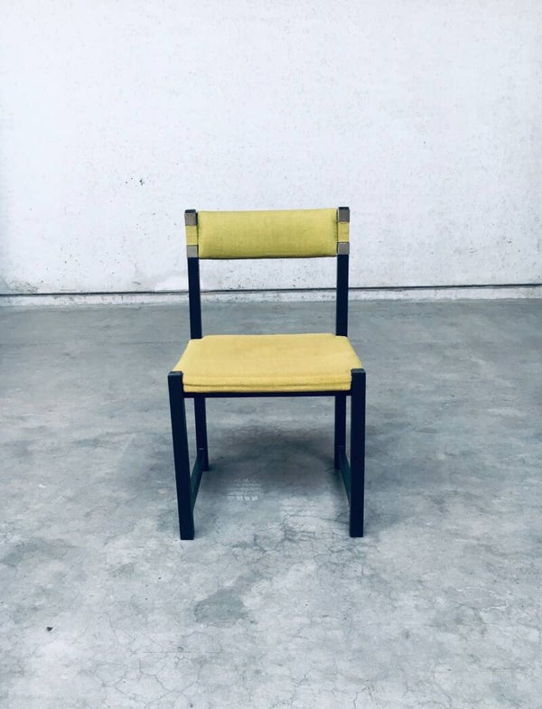 Vintage Midcentury Modern Belgian Design Dining Chair set of 6 designed by Jean Batenburg for MI. Made in Belgium, 1969. Black stained solid wood constructed frame with green fabric seat and back. Nice metal details on the back rest. All chairs are in good original condition. The fabric is all fine, the filling in the seats have deteriorated so they are a hard sit right now. New cushions underneath the fabric would be adviseable. Each chair measures 81,5cm x 48,5cm x 52cm.