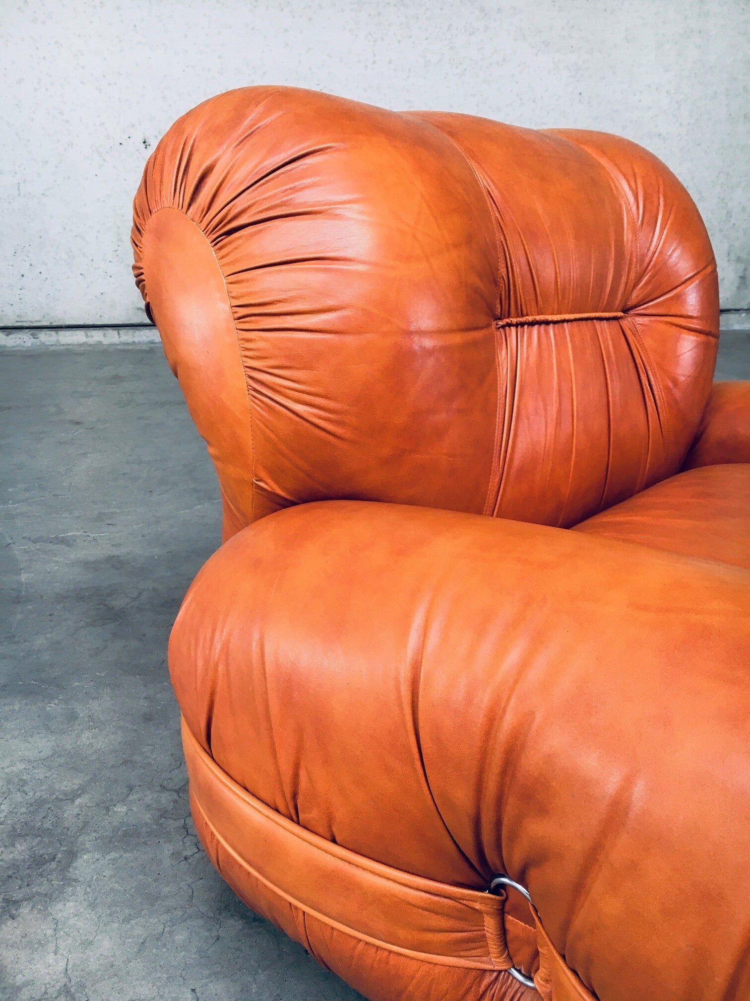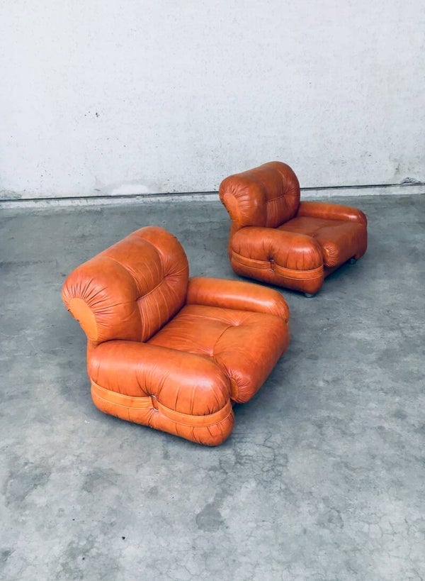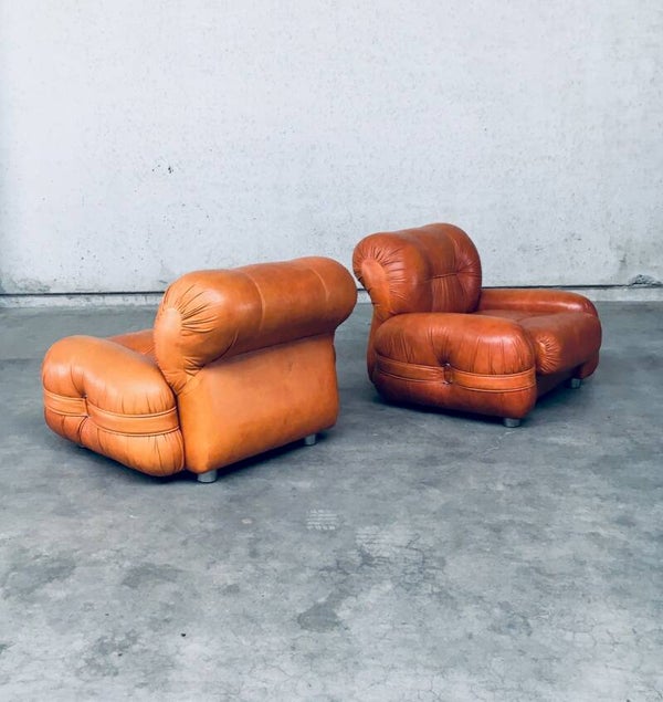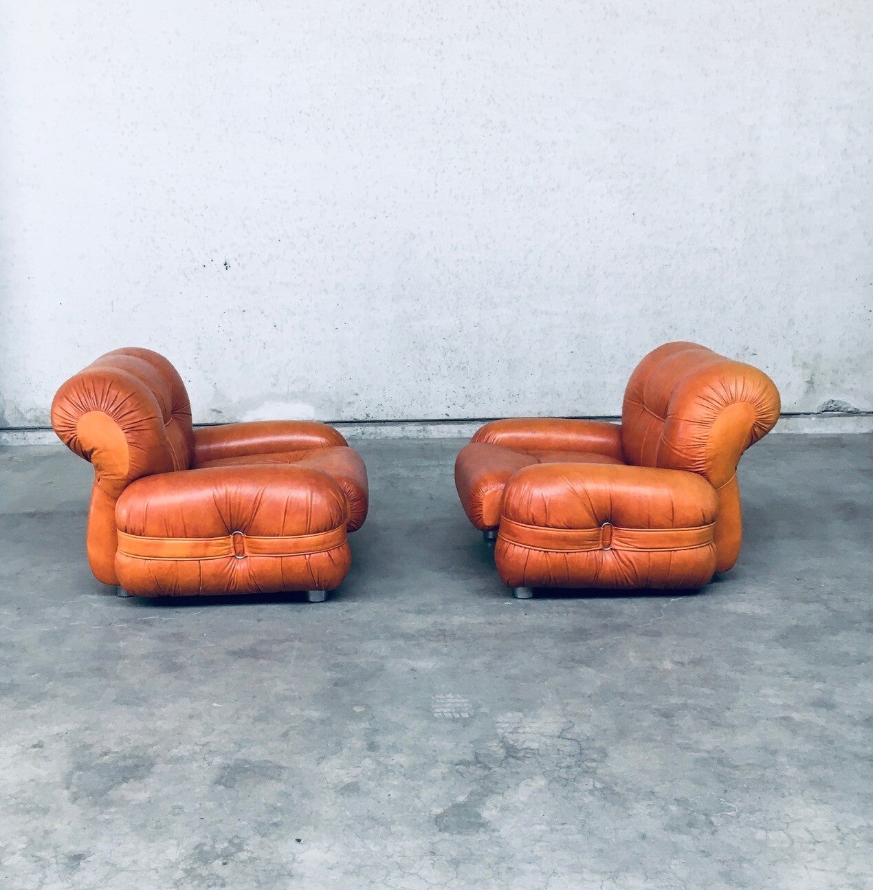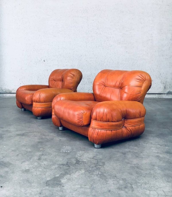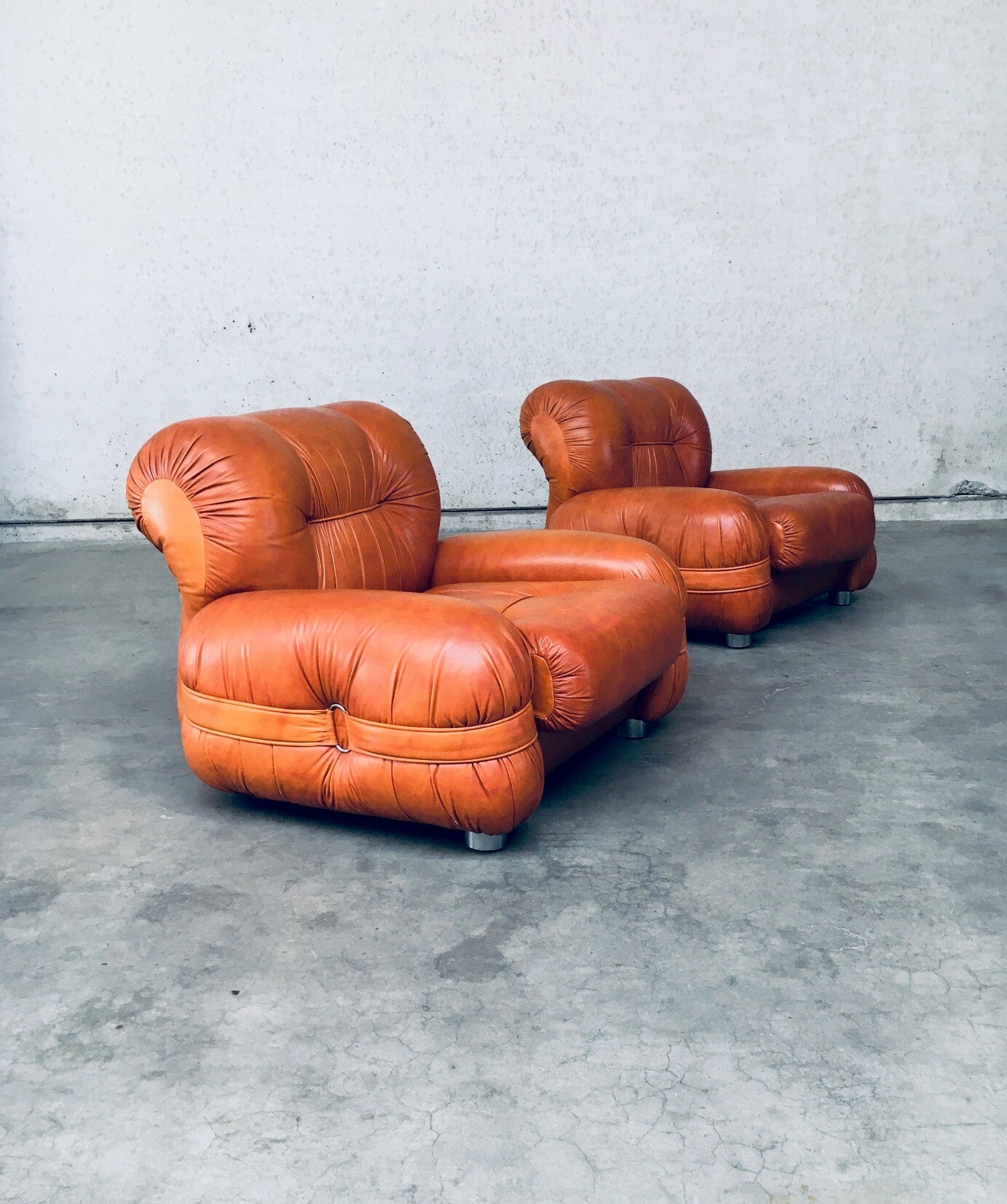 Vintage Midcentury Modern Italian Design Leather Lounge Chair set of 2 by Adriano Piazzesi. Made in Italy, 1960's / 70's period. Cognac leather arm chairs with straps and buckles on the side rests. Bulbous shapes on this very comfy and beautiful lounge chairs. These come in very good, all original condition, with minor signs of it's use and age. Each lounge chair measures 77cm x 106cm x 97cm.