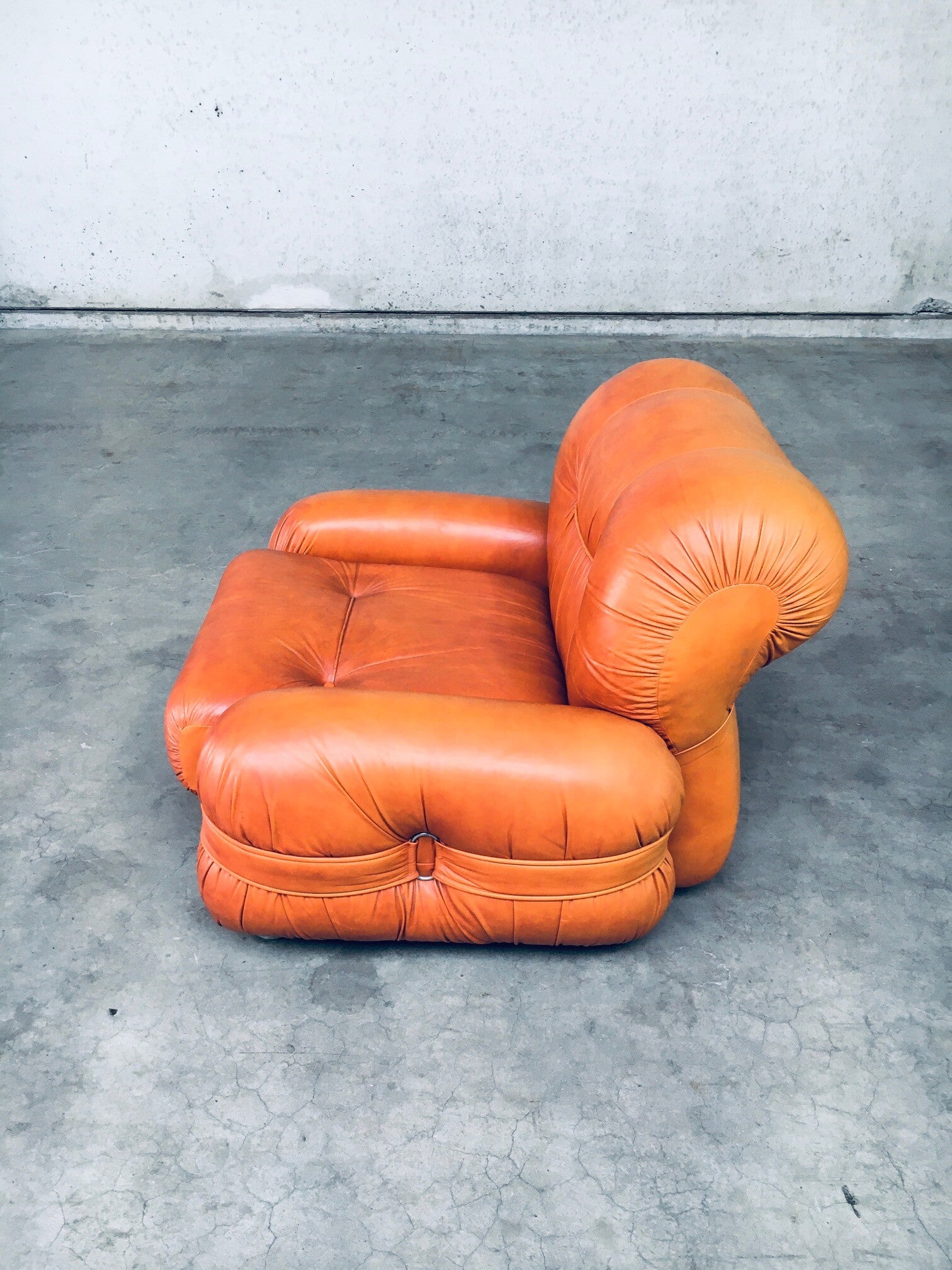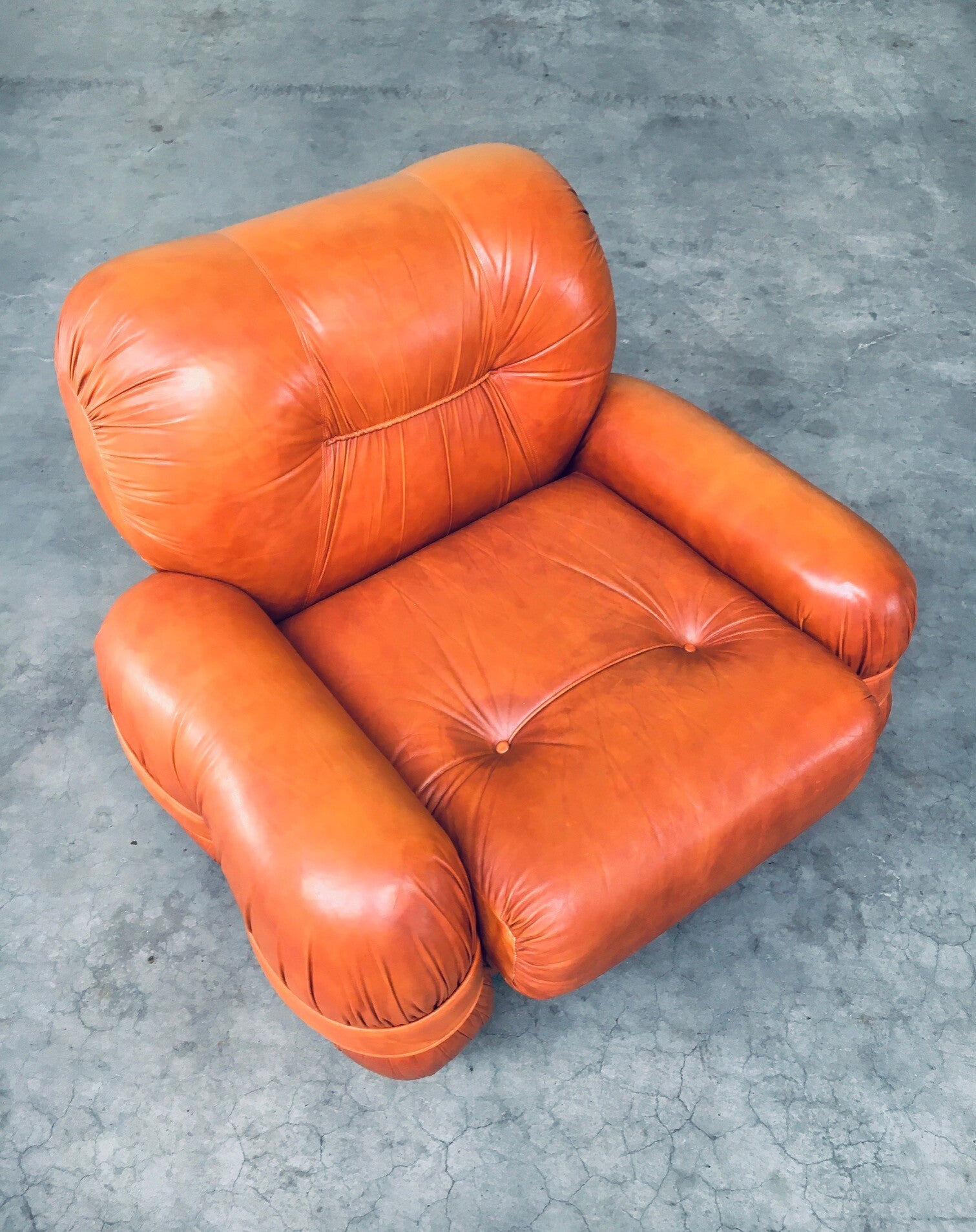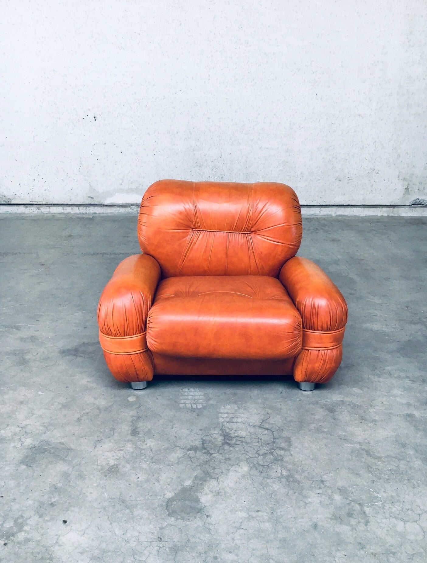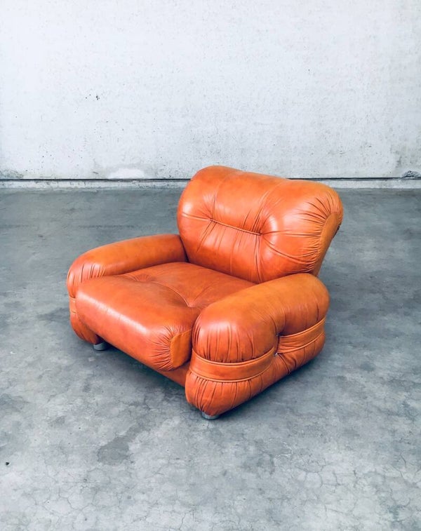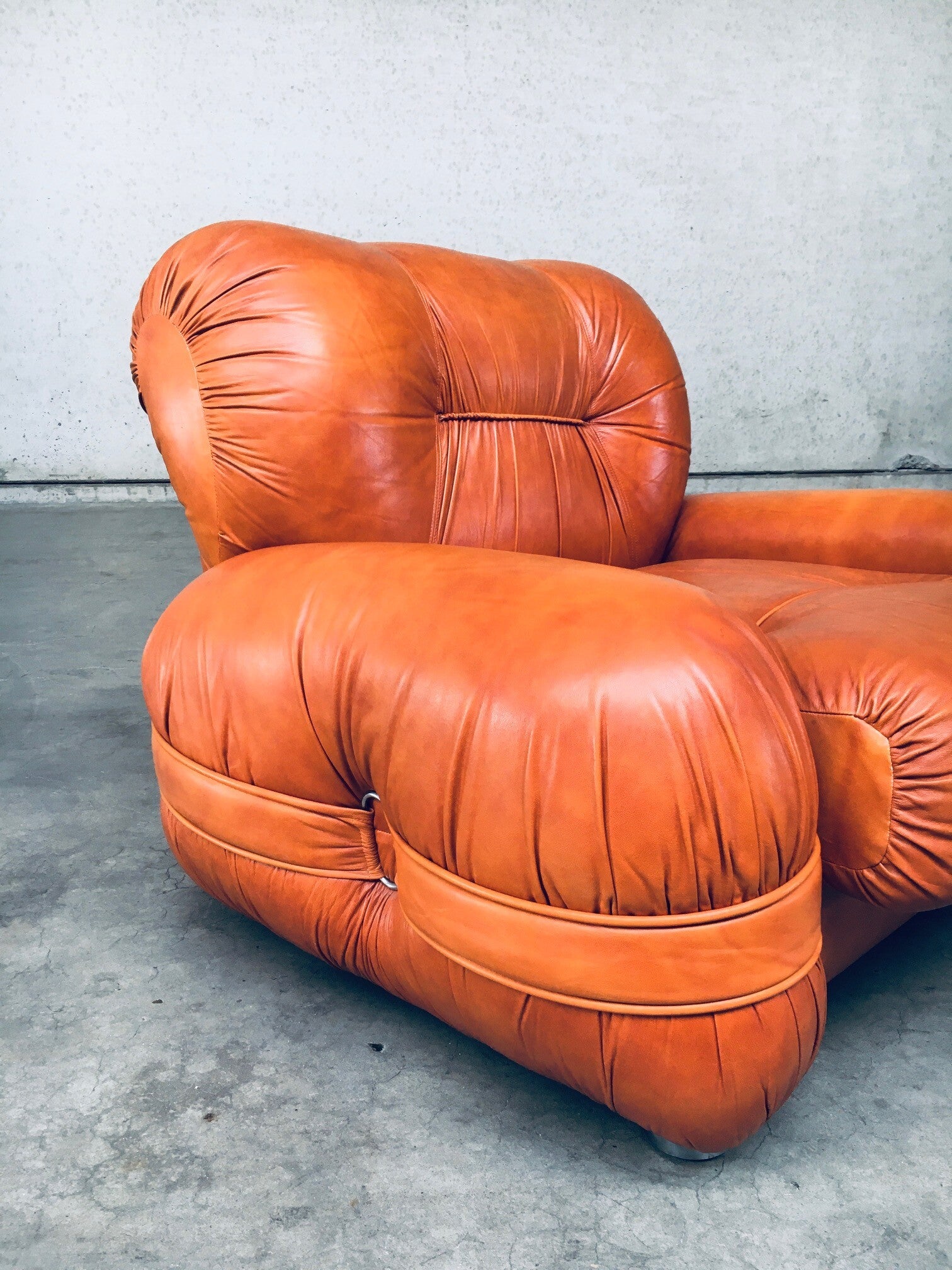 Vintage Midcentury Modern Italian Design Leather Lounge Chair set of 2 by Adriano Piazzesi. Made in Italy, 1960's / 70's period. Cognac leather arm chairs with straps and buckles on the side rests. Bulbous shapes on this very comfy and beautiful lounge chairs. These come in very good, all original condition, with minor signs of it's use and age. Each lounge chair measures 77cm x 106cm x 97cm.