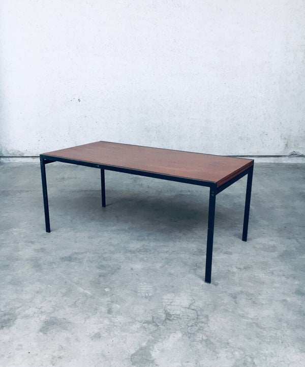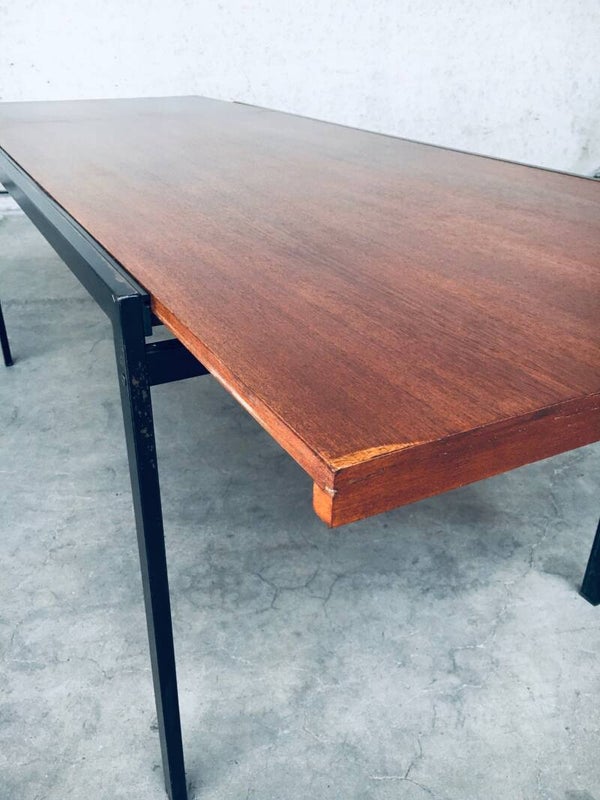 Vintage Midcentury Modern Dutch Design Extendable Table by Cees Braakman for Pastoe. Japan Series - model TT24. Made in the Netherlands, 1960's. Black metal frame with extendable teak veneer wood top. This has a slide under / up mechanism where the extension is underneath the table top. The table top has been restored, new staining and varnish. The black metal frame shows it's age. Paint flakes, minor rust. A nice aged patina. This comes in good condition. Measures 70,5cm x 156cm (215cm extended) x 80cm.