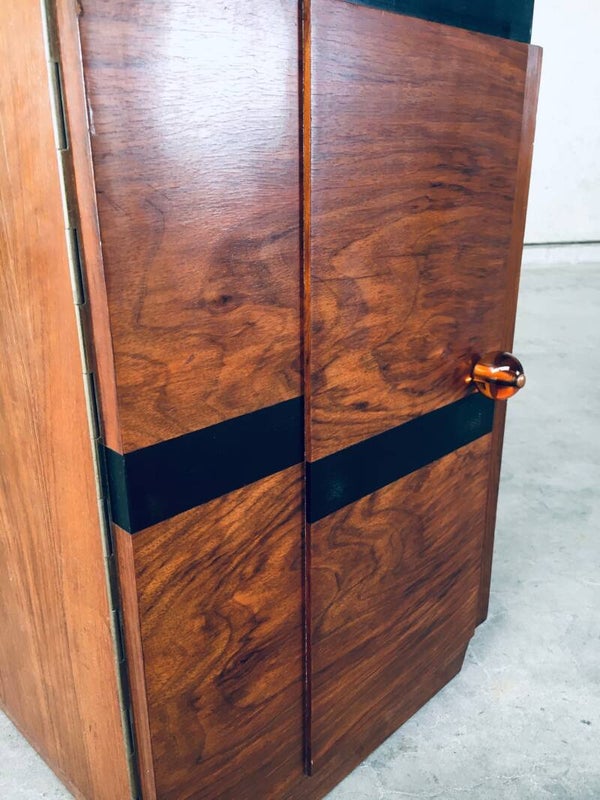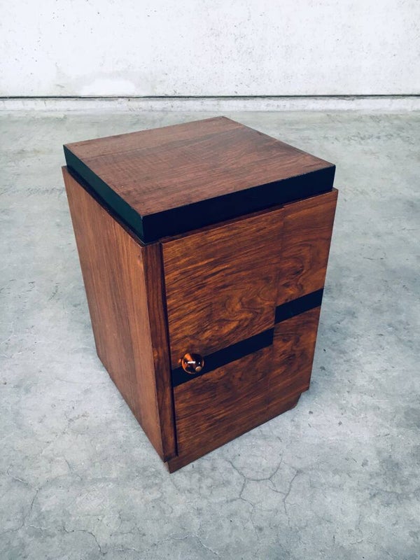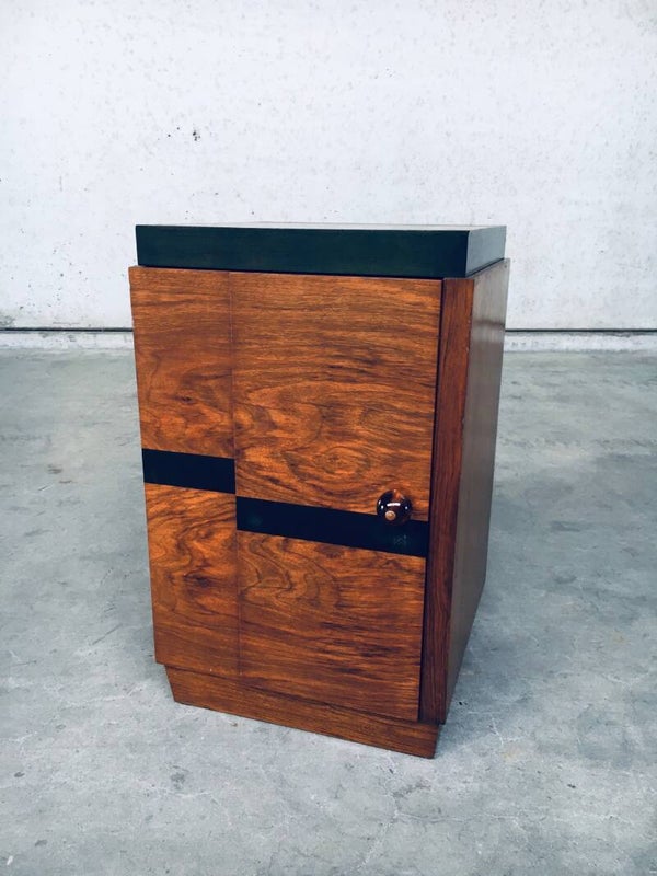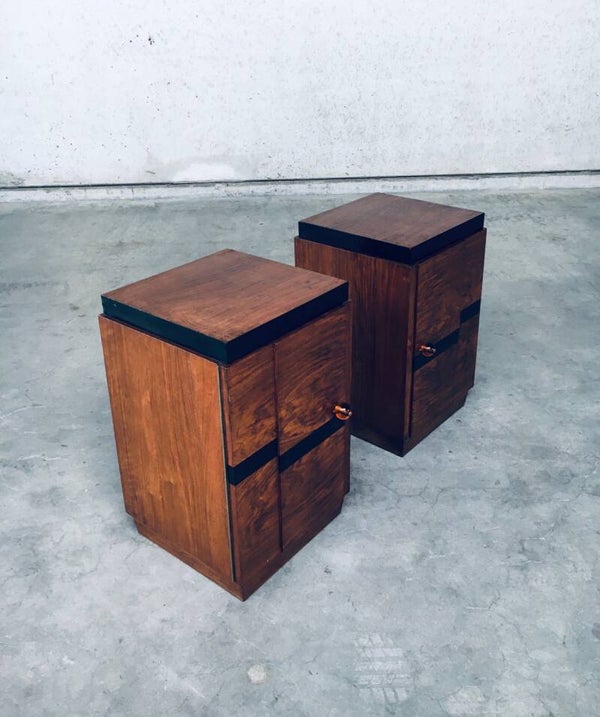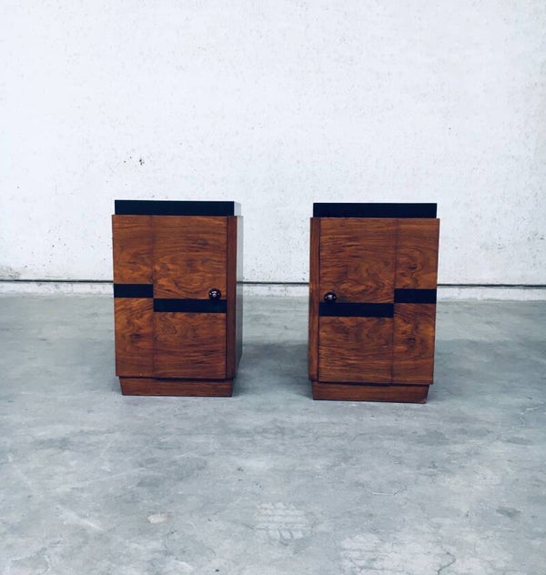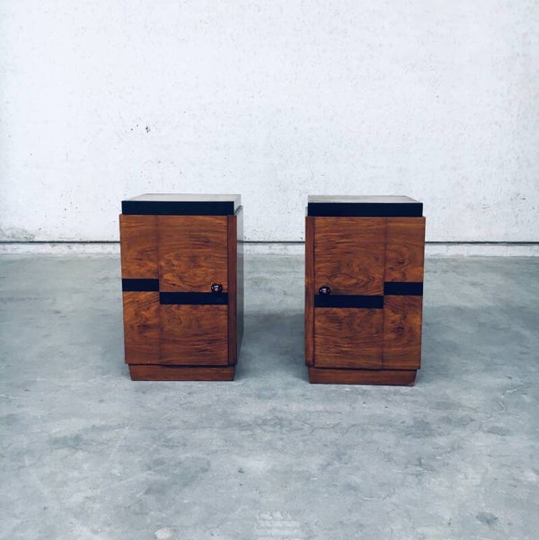 Vintage Art Deco Design Bedside Cabinet set of 2. Made in France, 1930's. Veneered on oak frame with black border design and original pink glass door handles. Both are in very good original condition. Minor wear. Some veneer chips. Each measures 65cm x 40cm x 43cm.