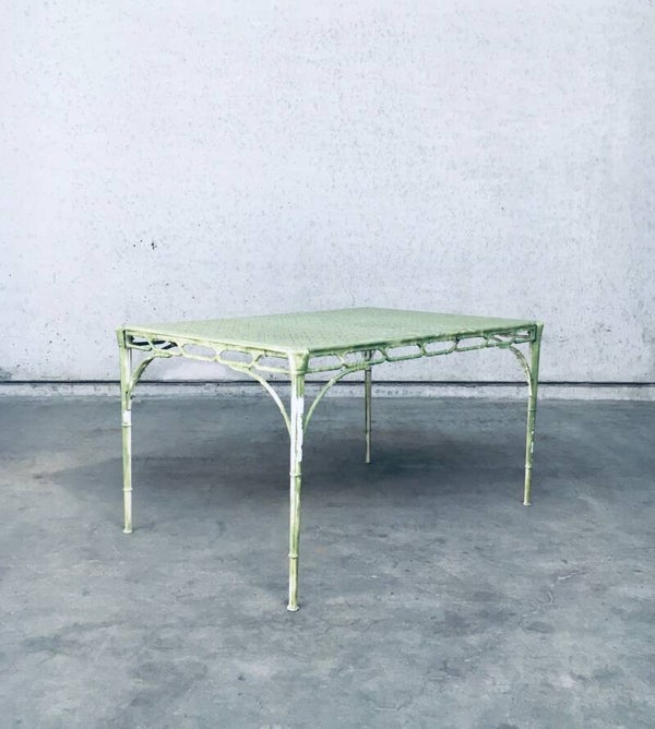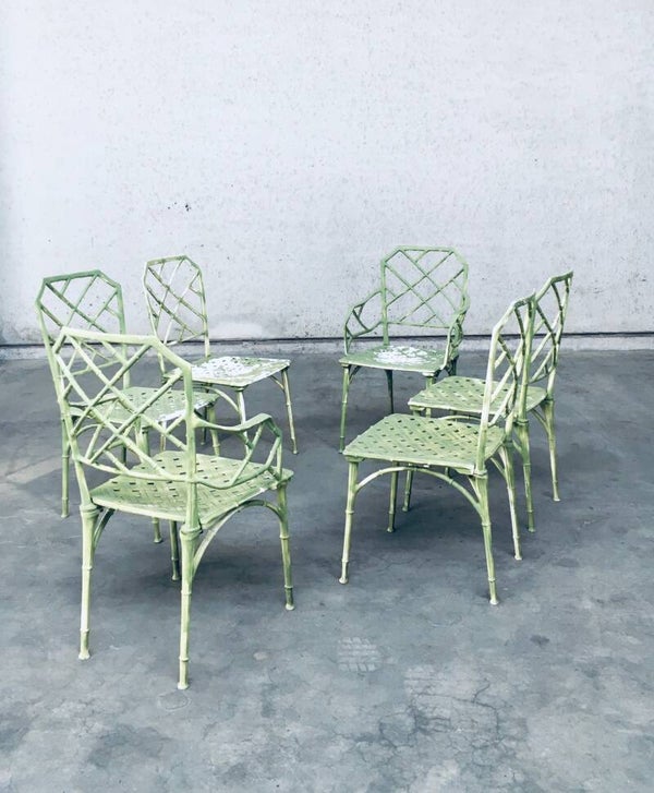 Vintage Midcentury Design "CALCUTTA" Faux Bamboo Outdoor Dining Set designed by Hall Bradley for Brown Jordan. Made in the USA, 1960's. Cast Aluminum made set. This set comprises of 1 table, 4 regular chairs and 2 armchairs. In the chinese chippendale style design. They have been repainted at some point in time by the previous owner in a minty herbal green. The set comes in good condition. All chairs are all sturdy. Paint loss on all chairs and table. The table has had some minor repairs; new welded screw placements and new central screw support bar. As is, the set has a very nice patina and would fit any garden. The table measures 72cm x 132cm x 90cm. The regular chairs measure 85cm x 44cm x 50cm. The armchairs measure 85,5cm x 51cm x 50cm.