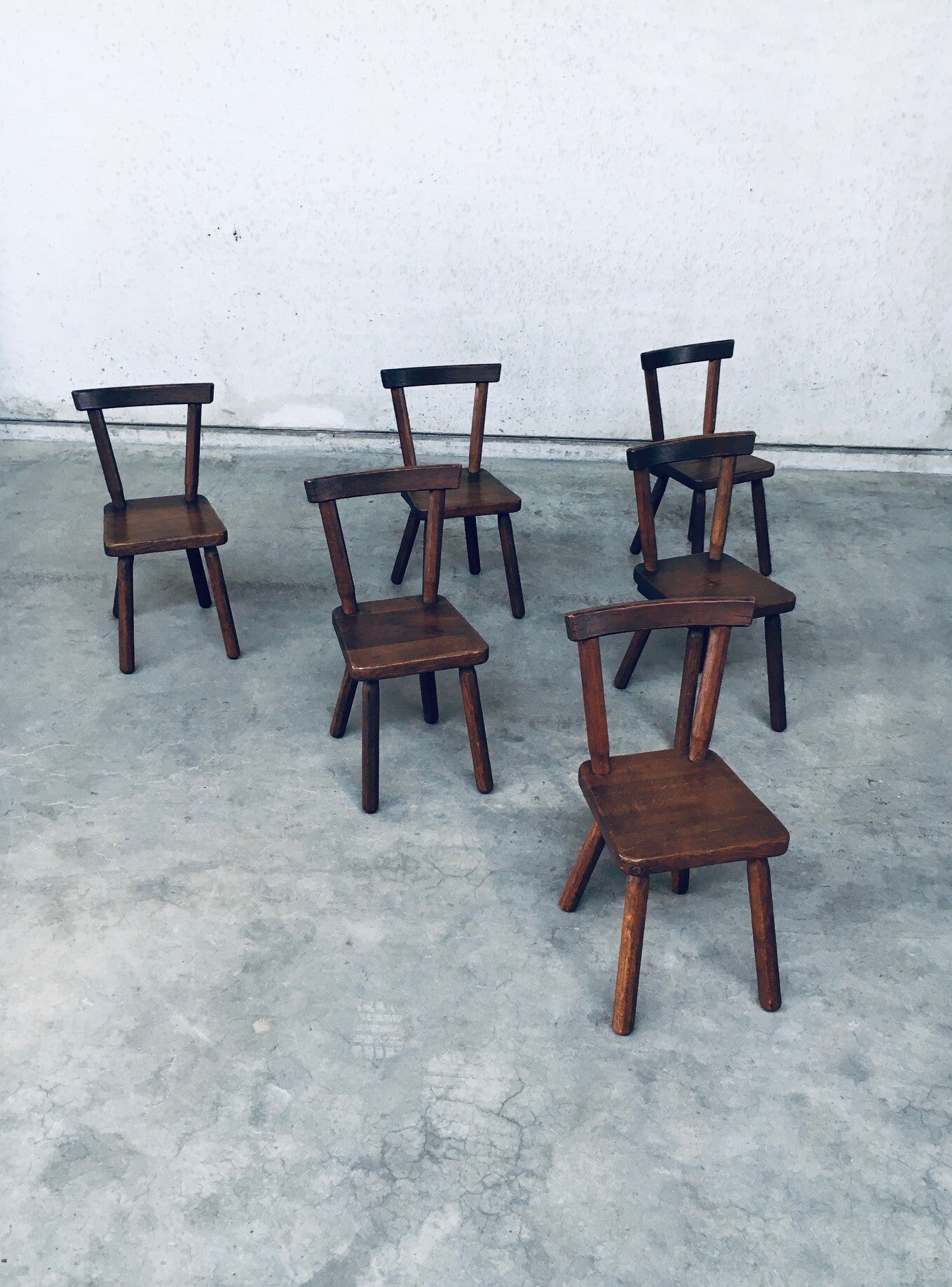 Vintage Midcentury Period Brutalist Design Solid Oak Dining Chair set of 6. Made in Belgium, 1950's / 60's period. Probably by Kunstmeubelen De Puydt. Unmarked. Solid oak constructed chairs with carvings for relief in the wood and wooden joints. Minimal in design. All chairs are in very good, original condition for their age and use. Each chair measures 82cm x 44cm x 41cm.