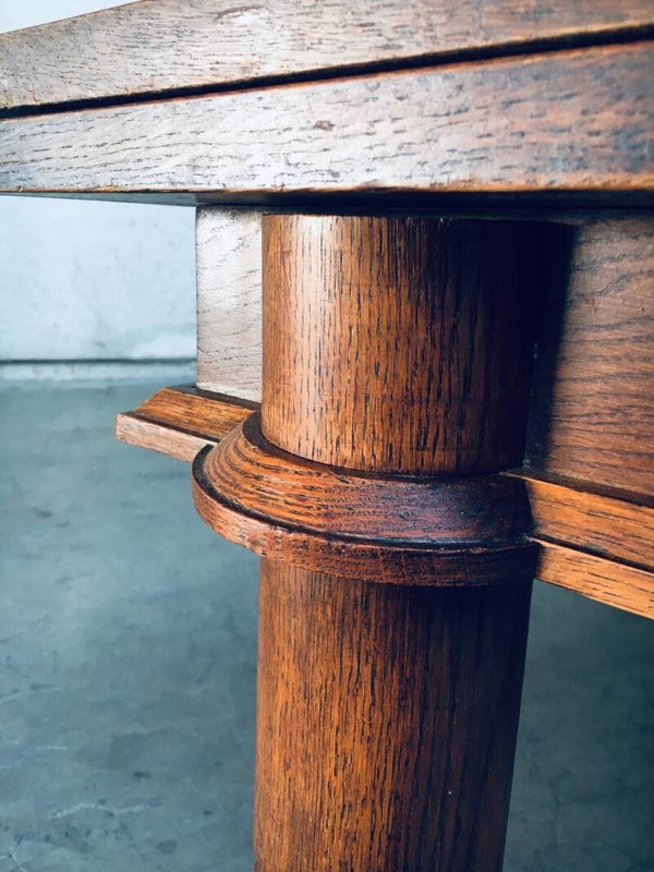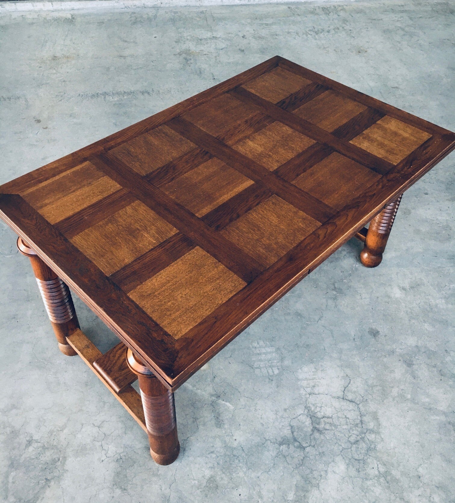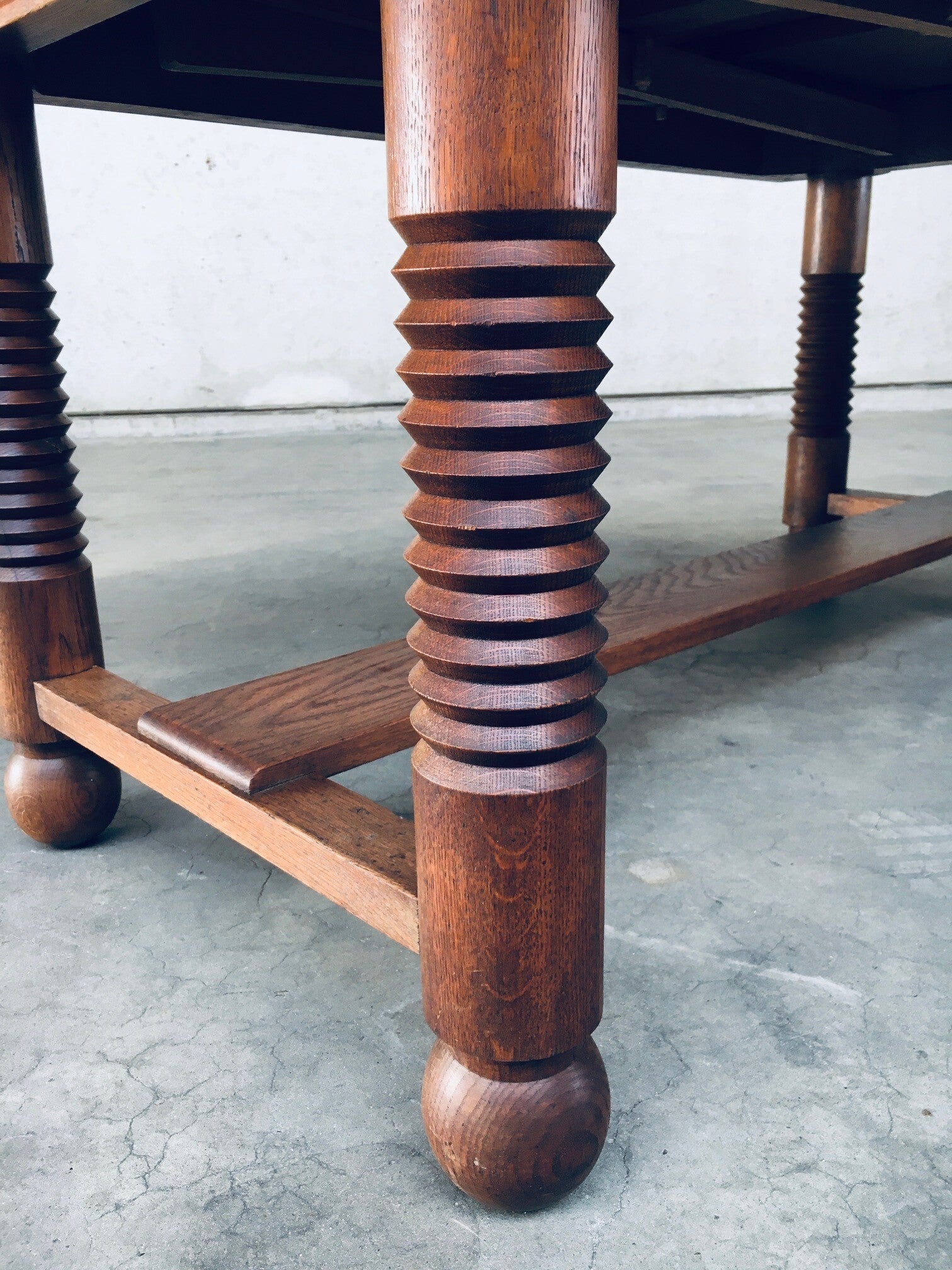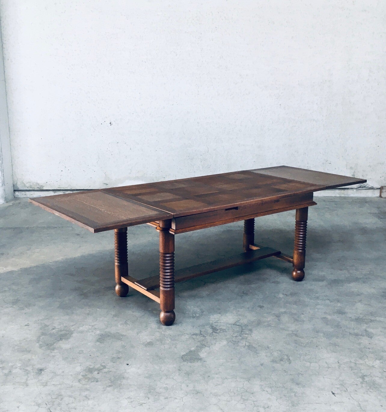 Vintage French Late Art Deco Design Period Extendable Dining Table by Charles Dudouyt. Made in France, 1940's. Solid oak constructed dining table with architecturaly formed turned legs. Marquetry table top and 2 extensions all in oak with nice grain and patina for it's age and use. Very good overall condition. The table measures 76,5cm x 138cm (238cm with extensions) x 87,5cm.