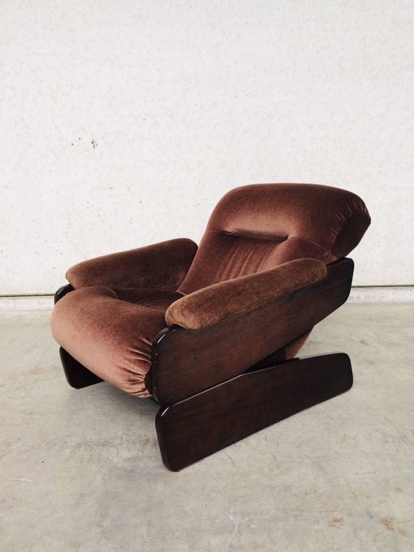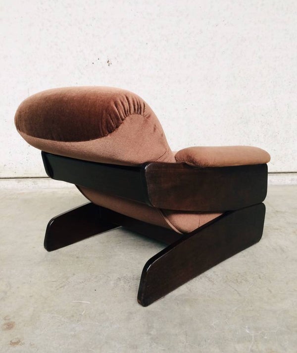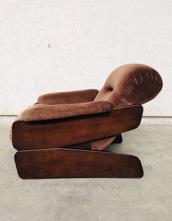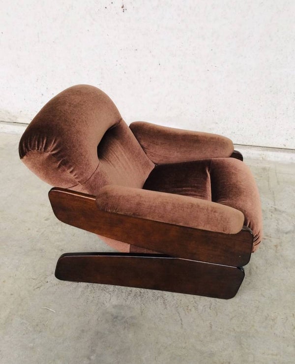 A vintage midcentury 1970's Scandinavian Design Super Soft brown velvet & dark wood Lounge Chair. Sofa is in perfect condition. I think it has never been used. An awesome lounger to relax in. No brand markings.
