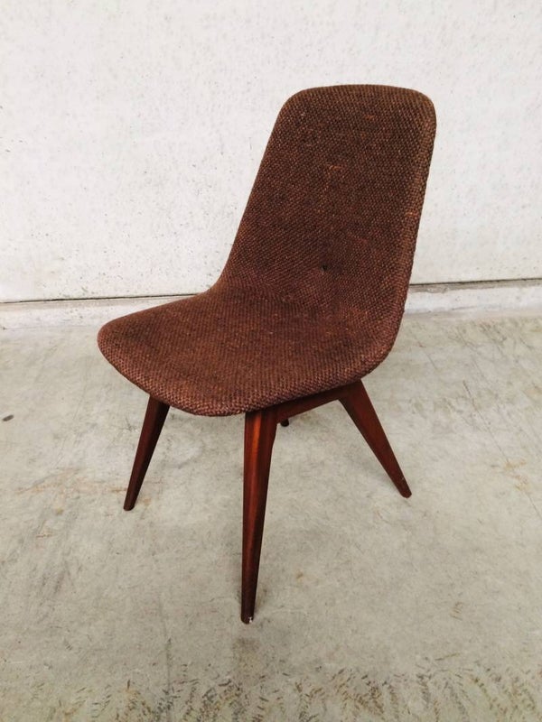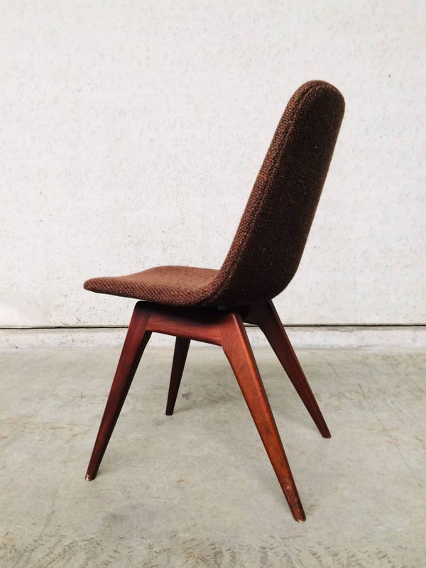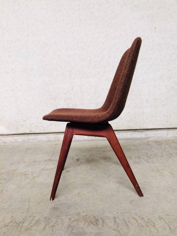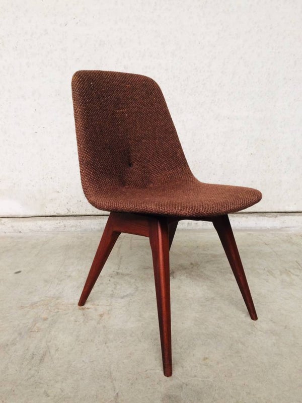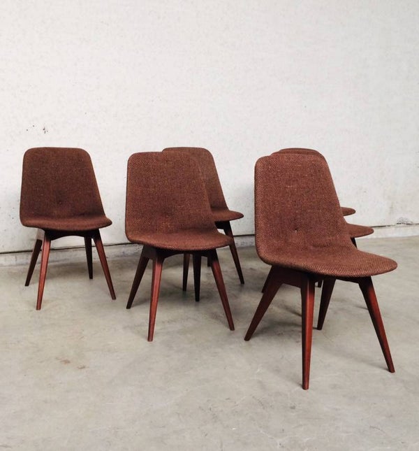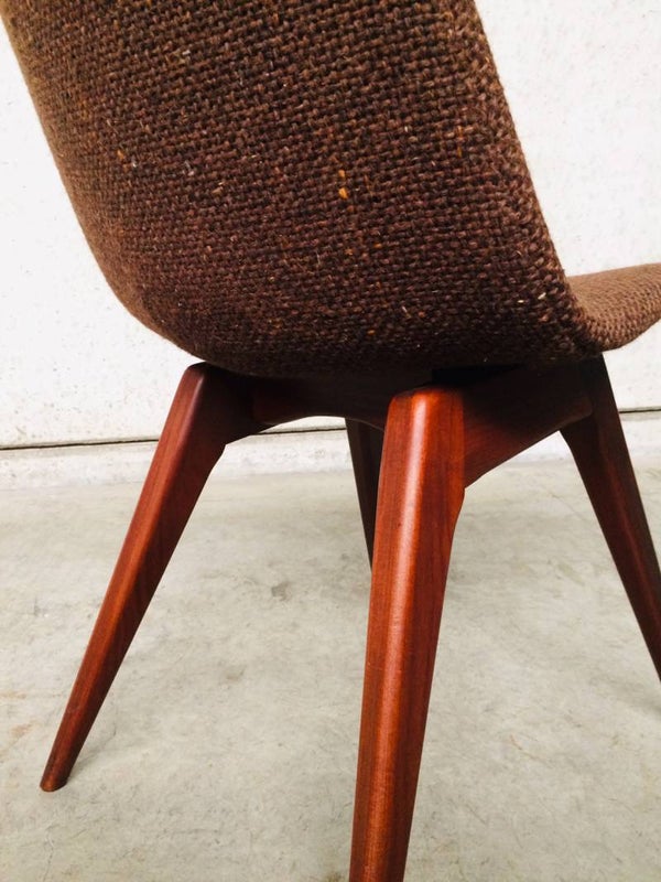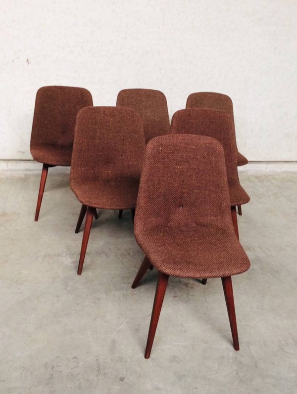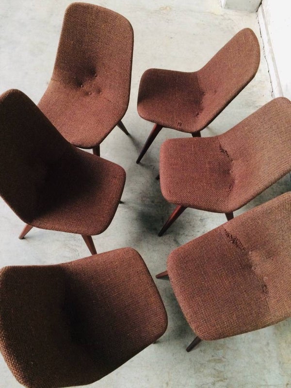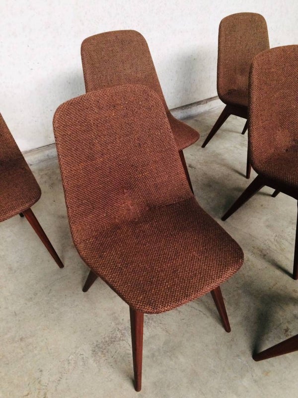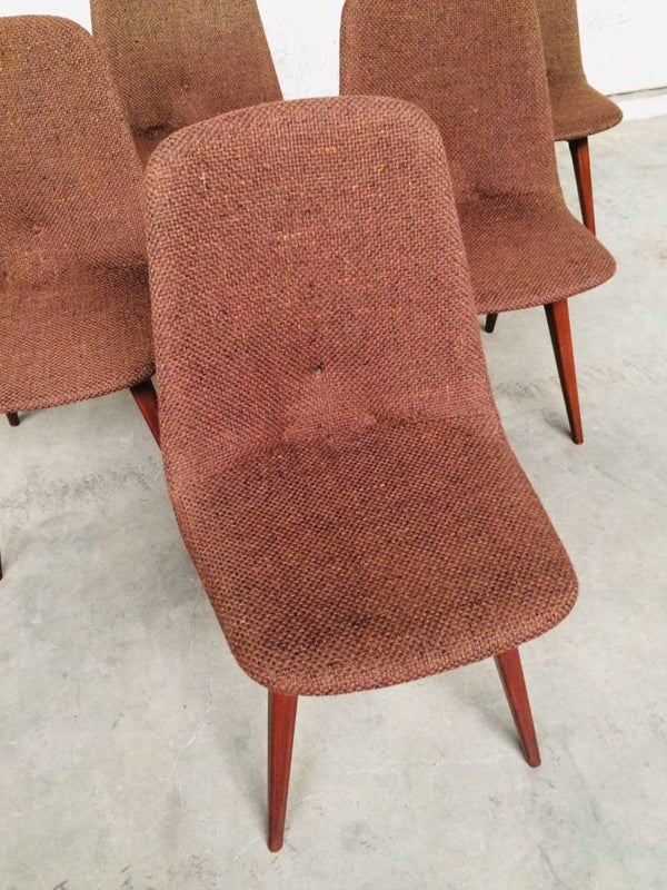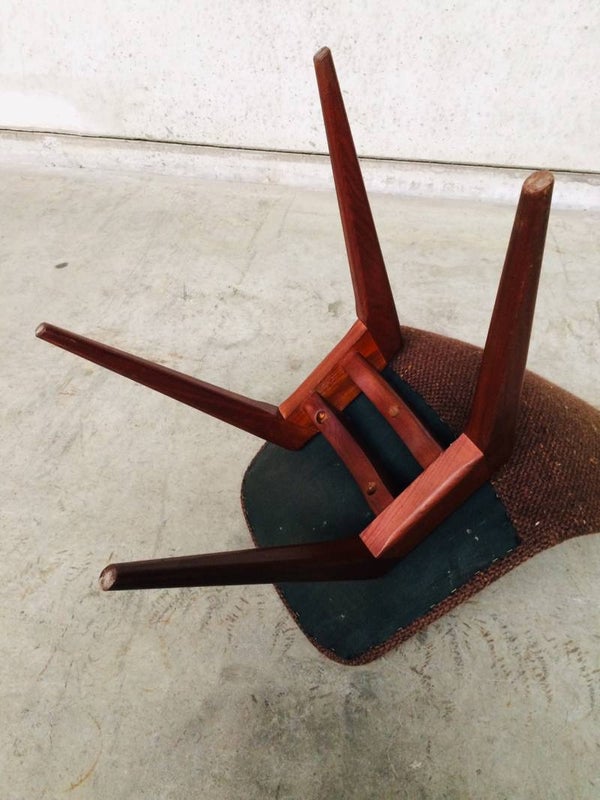 A vintage Midcentury Modern 1960's Scandinavian Design set of 6 Rosewood & woven wool seat chair dining chairs. The Rosewood is in very good and solid condition. Woven wool torn on some chairs. Some button covers are missing. 5 chairs have good padding foam in seat, one has it's foam disintegrated, needs replacing. Beautifull style & design. They all sit very comfortable with a slight bounce in the back.