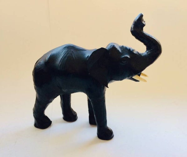 A vintage 1950's leather Elephant model sculpture with bone tusks. No markings or manufacturer marks. The hand-crafted figure features beautifully aged black leather with glass eyes, and bone tusks. In good condition. 30cm x 28cm x 12cm.