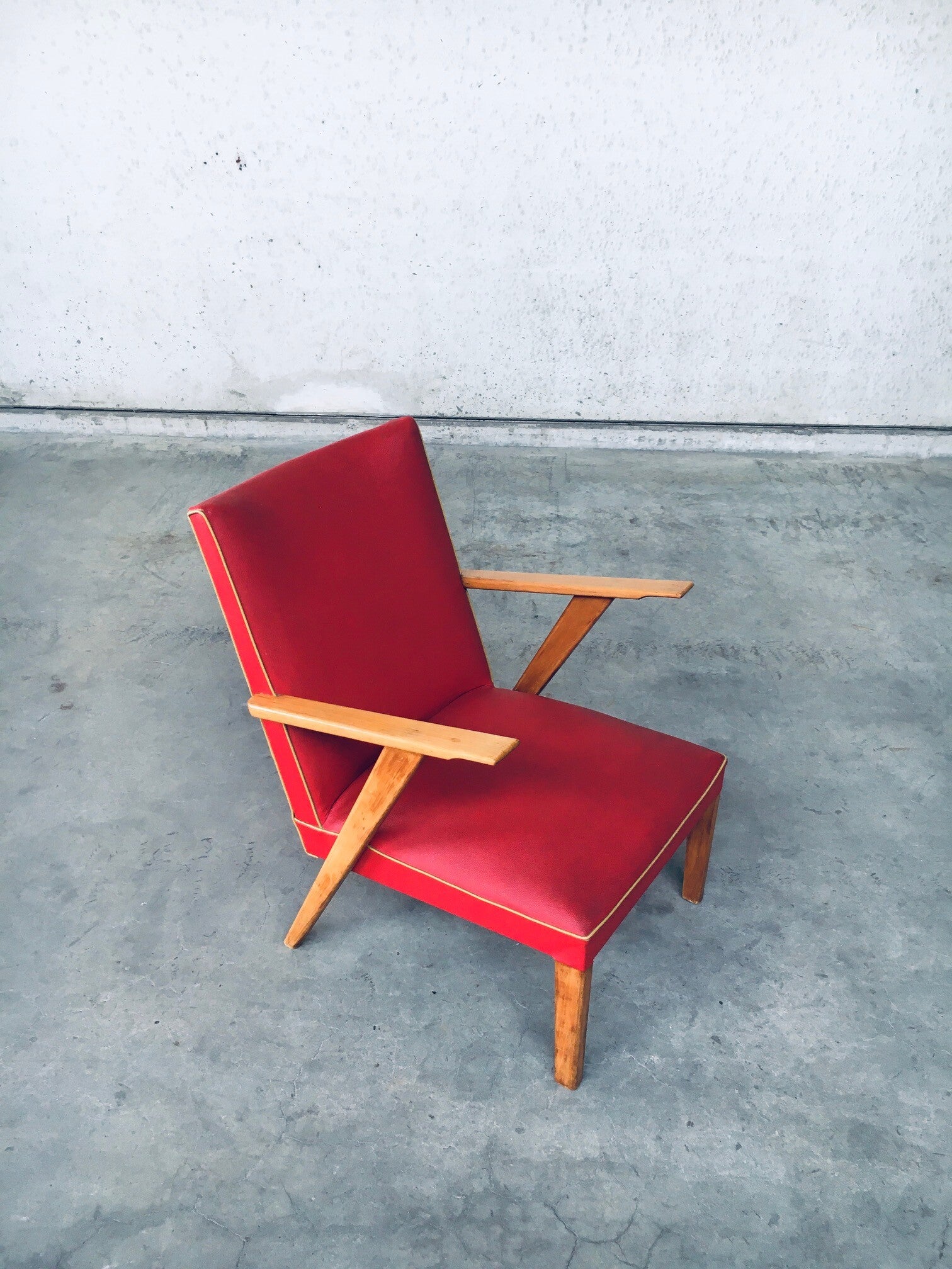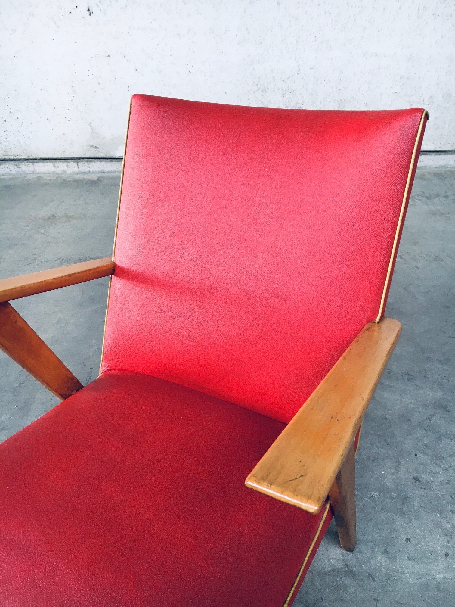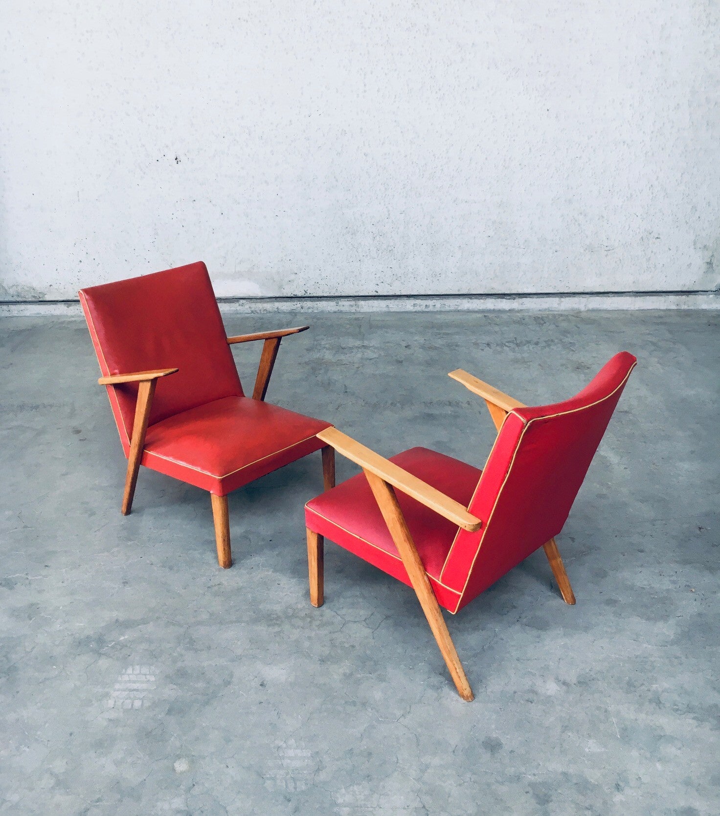 Vintage Midcentury Modern Dutch Design Lounge Chair set. Made in the Netherlands, 1950's. Faux leather, two different colors red skai with beech armrests and legs. The armchairs are similar, but differ slightly. The red skai fabric is different on both. Well shaped lounge chairs. Both are in very good, all original condition. Each chair measures 79cm x 62,5cm x 72cm.