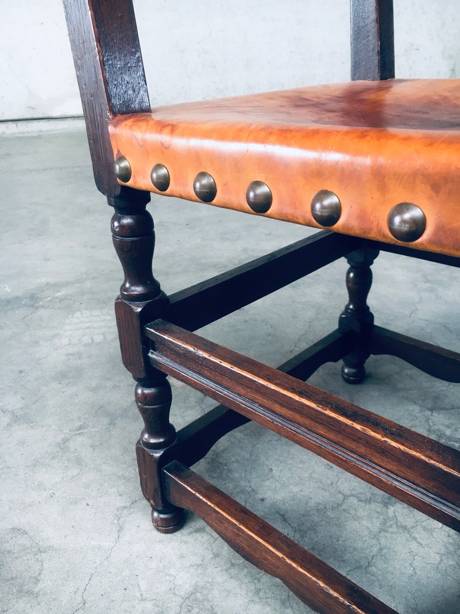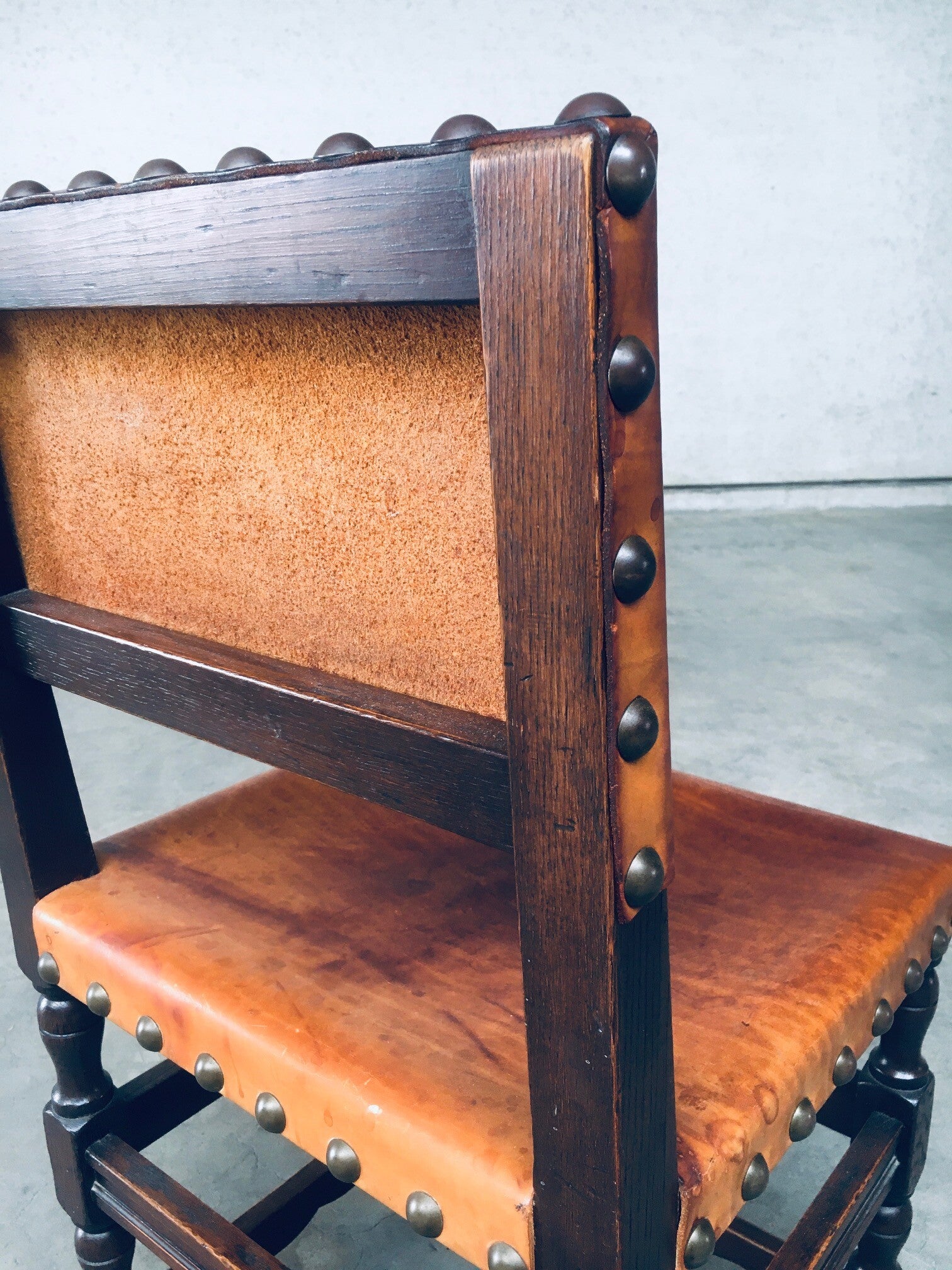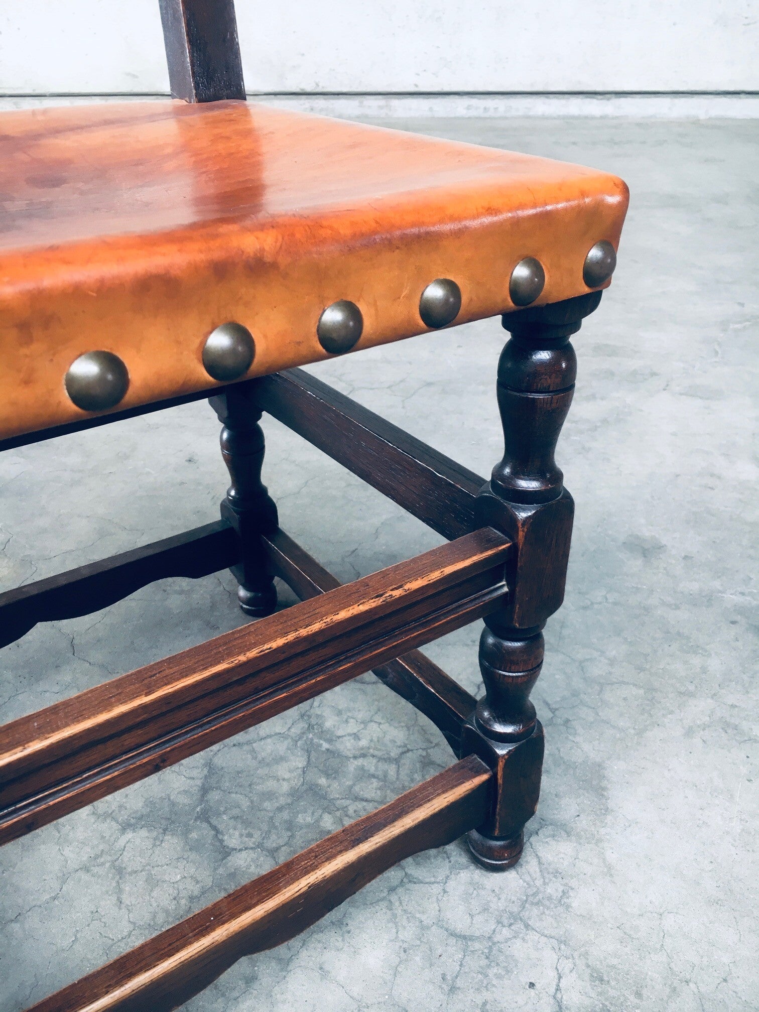 Vintage Tudor Style Cromwelian Design Leather Dining Chair set of 8. Made in England, 1940's. Oak dark stained frame with thick cognac natural leather seat and back, finished with brass studs. All chairs are nicely patinated on the leather from their age and use. All chairs are in very good, original condition. Each chair measures 87cm x 47cm x 44cm.
