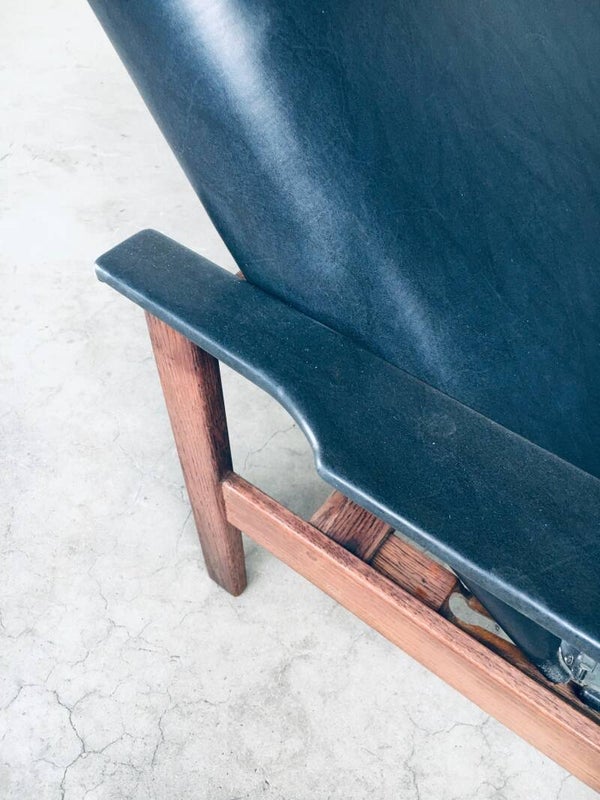 Vintage Midcentury Modern Belgian Design Lounge Relax Chair by Georges Van Rijck for Beaufort. Made in Belgium, 1960's. Recliner arm chair with it's original head rest cushion.. Wenge wood frame with faux leather covered seat and armrests. The armchair can be set in 2 positions. Very nice and sleek design. Comes in very good, original condition. Missing one captionated button in the back. Measures 96cm x 69,5cm x 84cm.