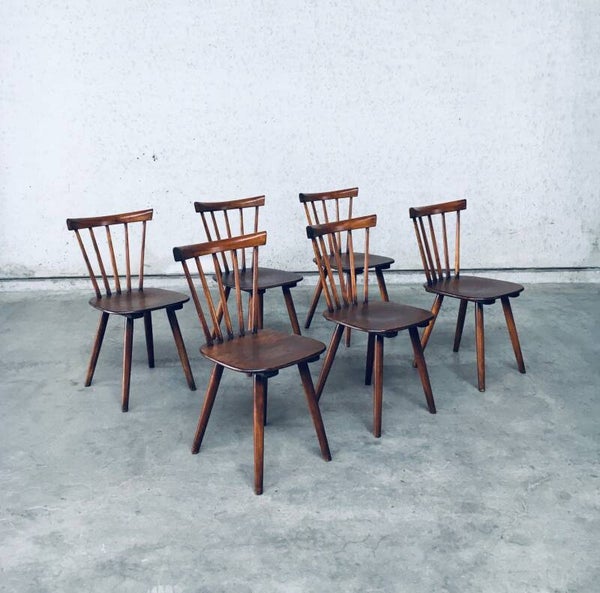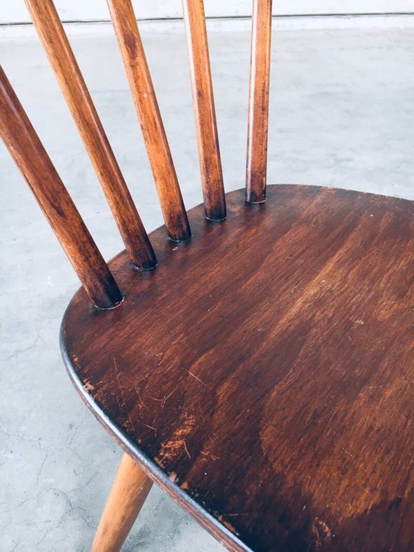 Vintage Midcentury Dutch Design Spindle Back Café Chairs by Vervoort Tilburg. Made in the Netherlands, 1950's / 60's. Set of 6 chairs. Elm or Beech constructed chairs with stamp of their maker on the bottom (faded on most chairs). All chairs are in well used condition, but all remain very sturdy and a good seat. Each chair measures 84cm x 41cm x 48cm.