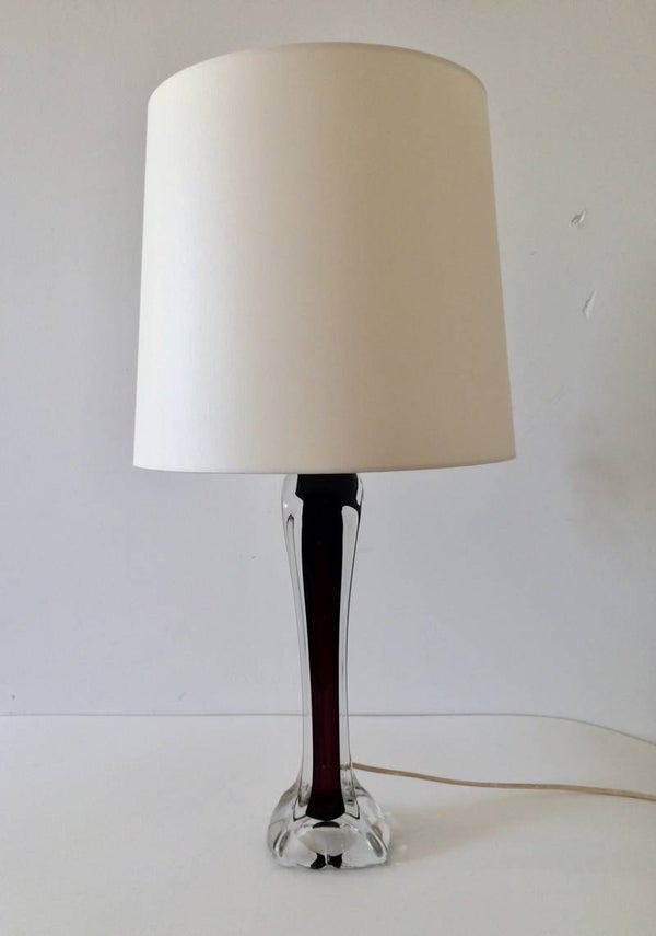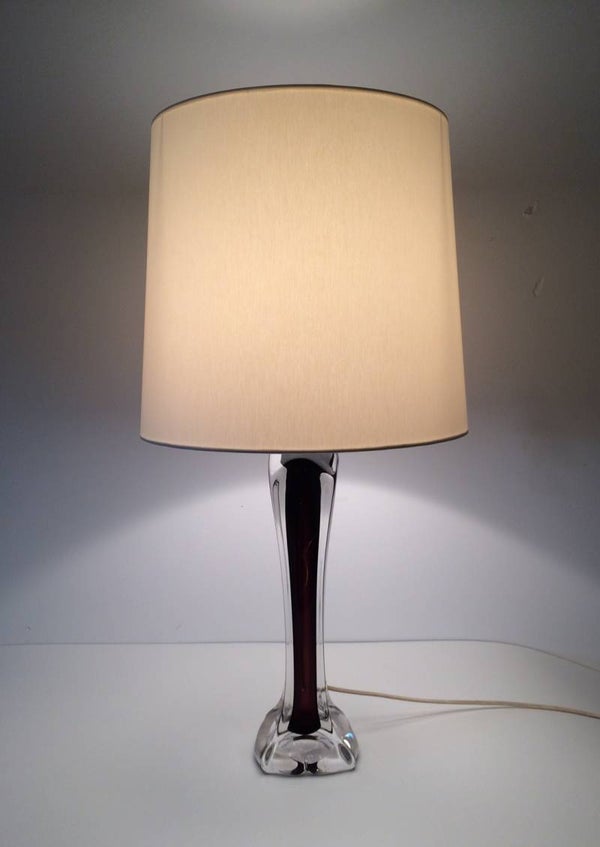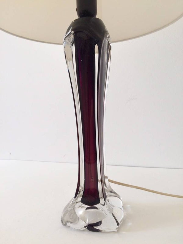 Vintage Midcentury Modern 1950's Design Val St Lambert Crystal Glass Table lamp with new shade. Nice hand shaped clear crystal glass with purple inner color. In perfect condition. Made by Val Saint Lambert in Belgium in the 1950's. Lamp with shade measures: 68cm x 35cm x 35cm.