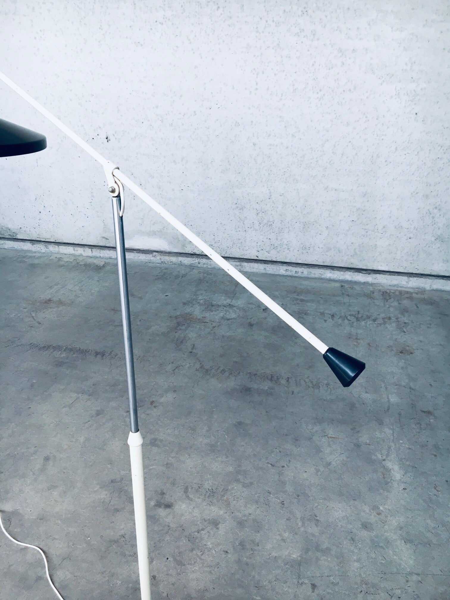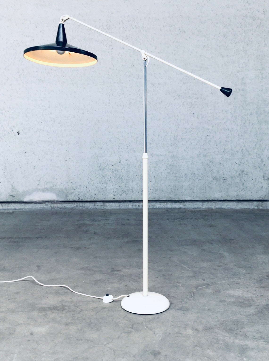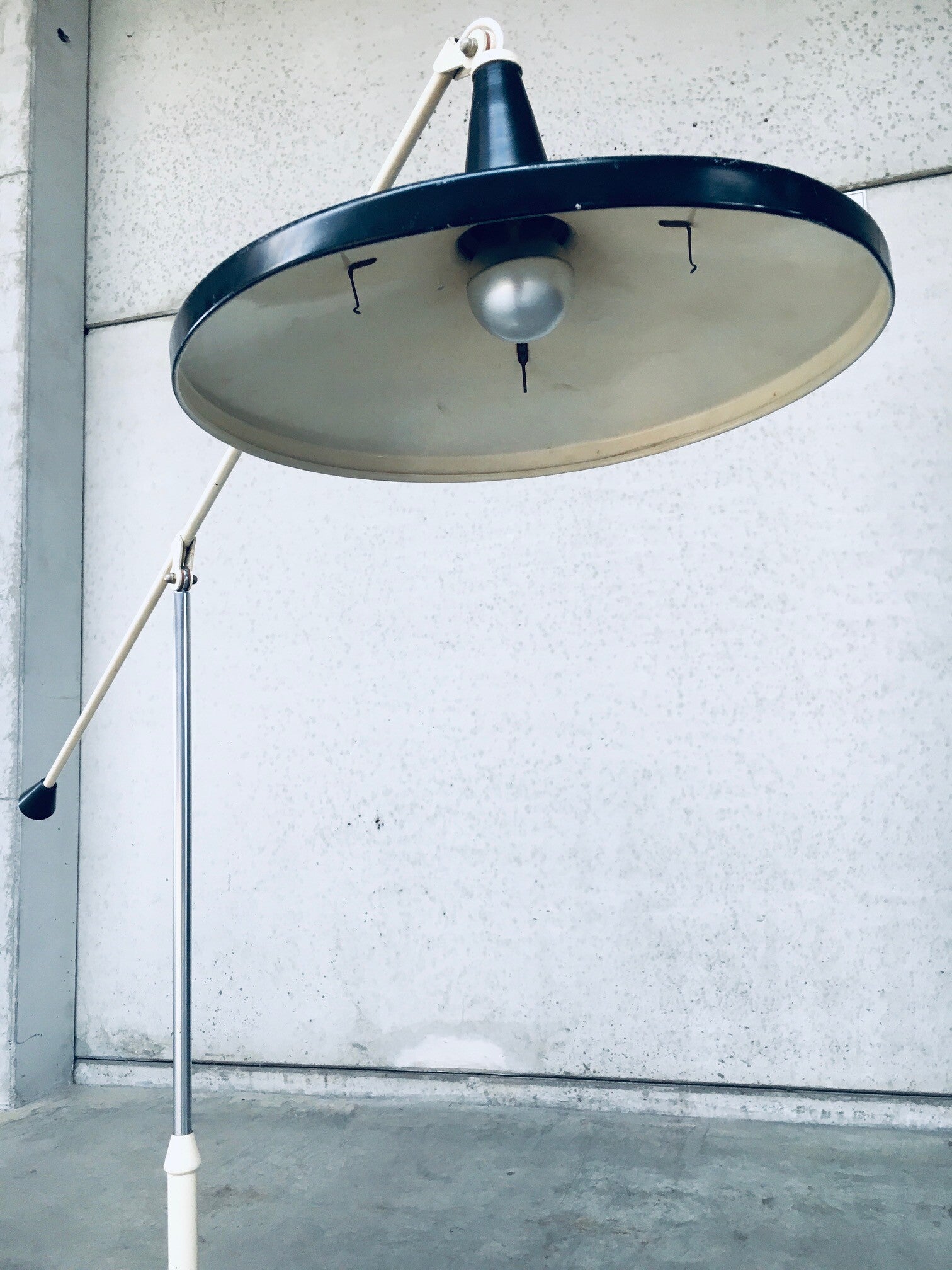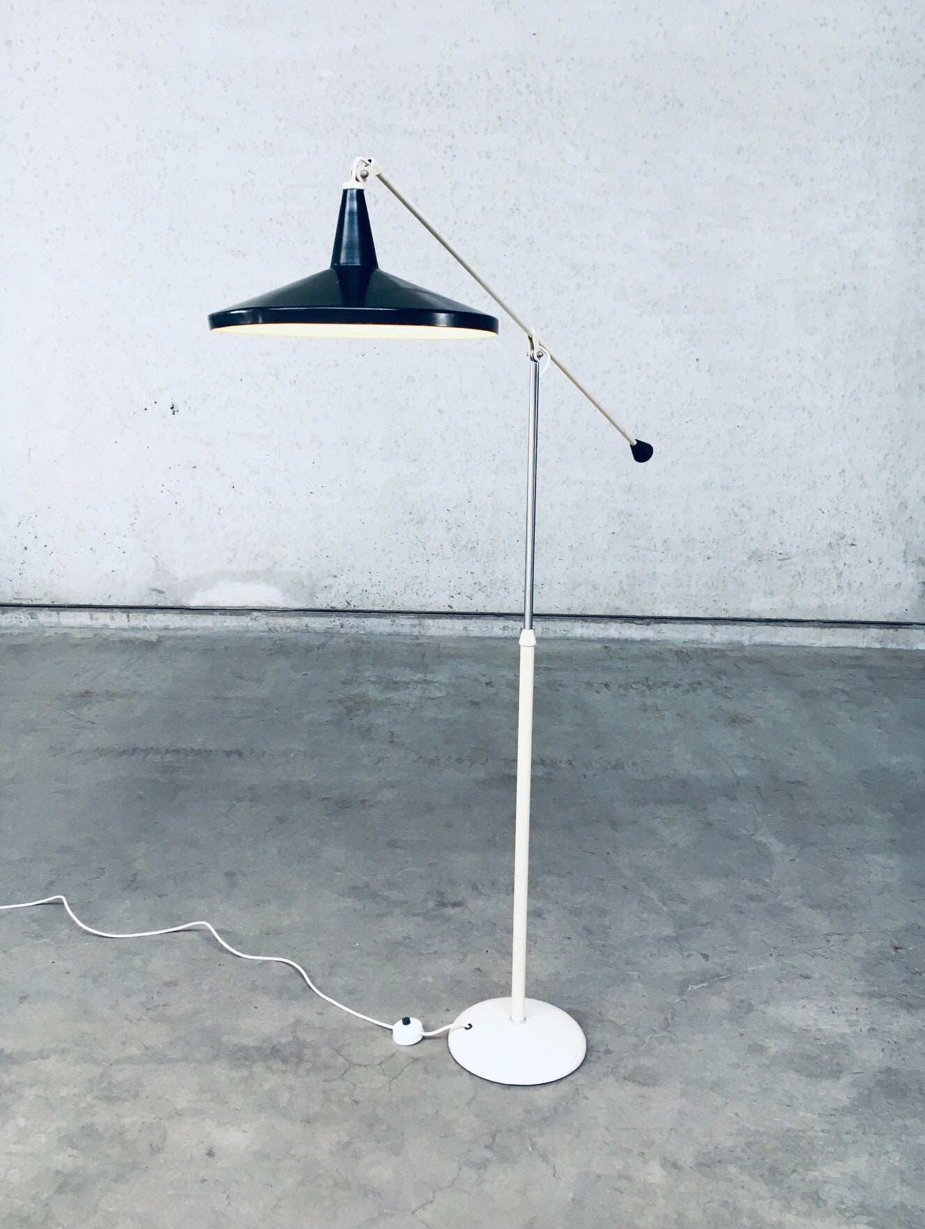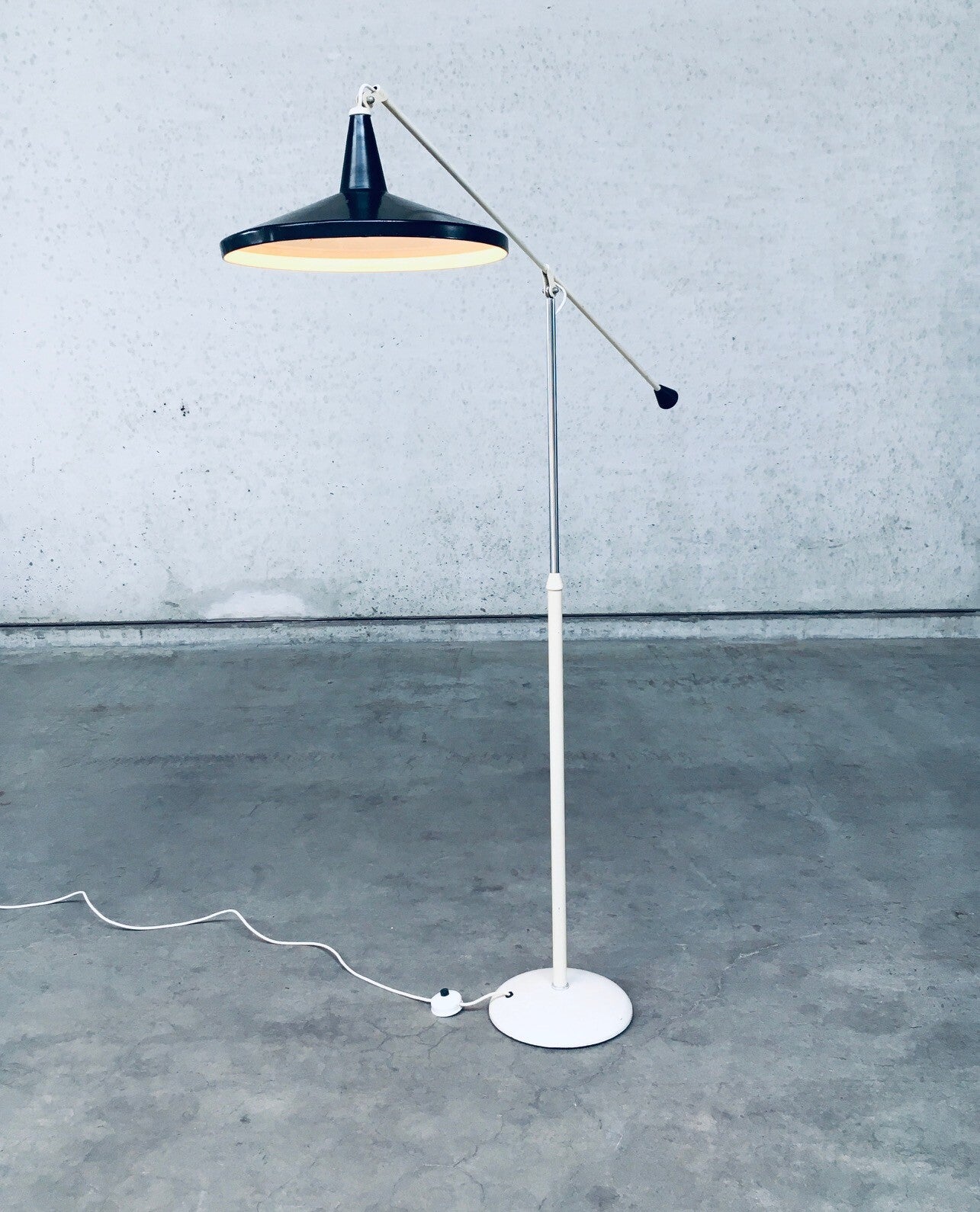 Vintage Midcentury Modern Dutch Design "PANAMA" Model 6350 Floor Lamp in black designed by Wim Rietveld for Gispen. Made in the Netherlands, 1957. Cream white coated base and adjusting rod with black shade. The lamp can be adjusted in height by tilting the rod with original rubber handle. This lamp is all original, but it is missing it's plastic difuser. Fitted with a mirror bulb, this gives the same warm glow as with the difuser. Comes in very good condition. Measures (in normal position, pic. 1) 165cm x 120cm x 40cm.