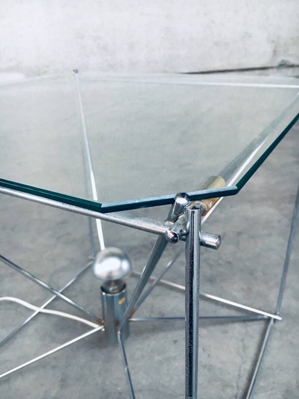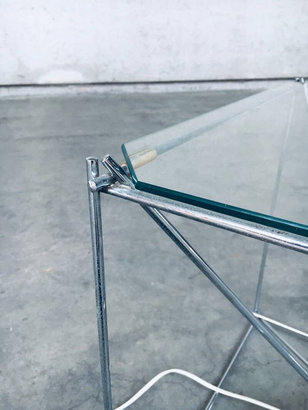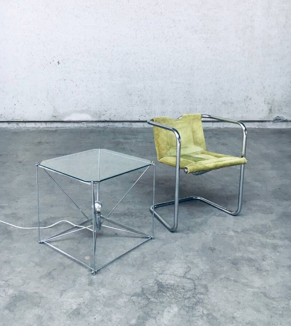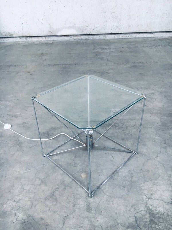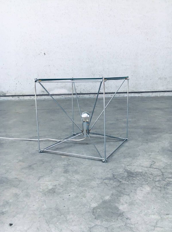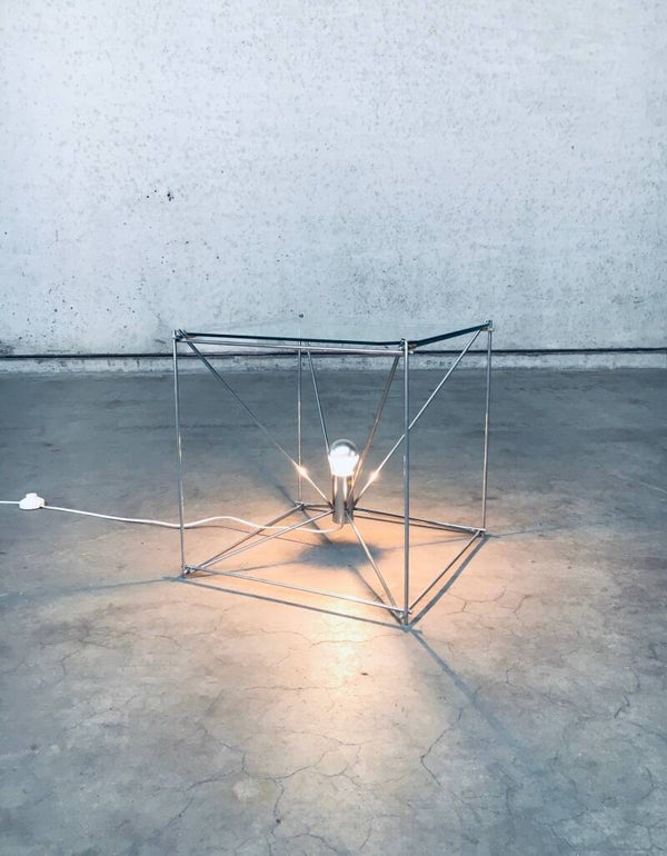 Vintage Midcentury Modern French Design Cubist Floor Lamp / Coffee Table or Side Table by Max Sauze. Made in France, 1960's. Marked; 'Made in France'. Chrome metal frame with cut glass top. All original and very good condition. Gives a beautiful warm glow with the fitted mirror light bulb. Measures 50cm x 50cm x 50cm.