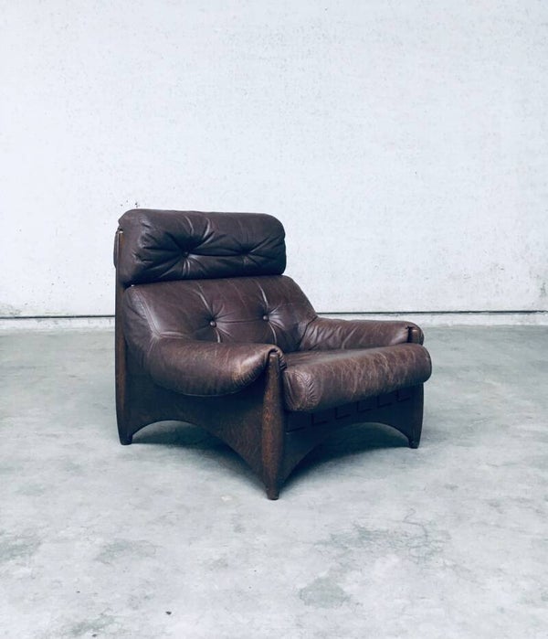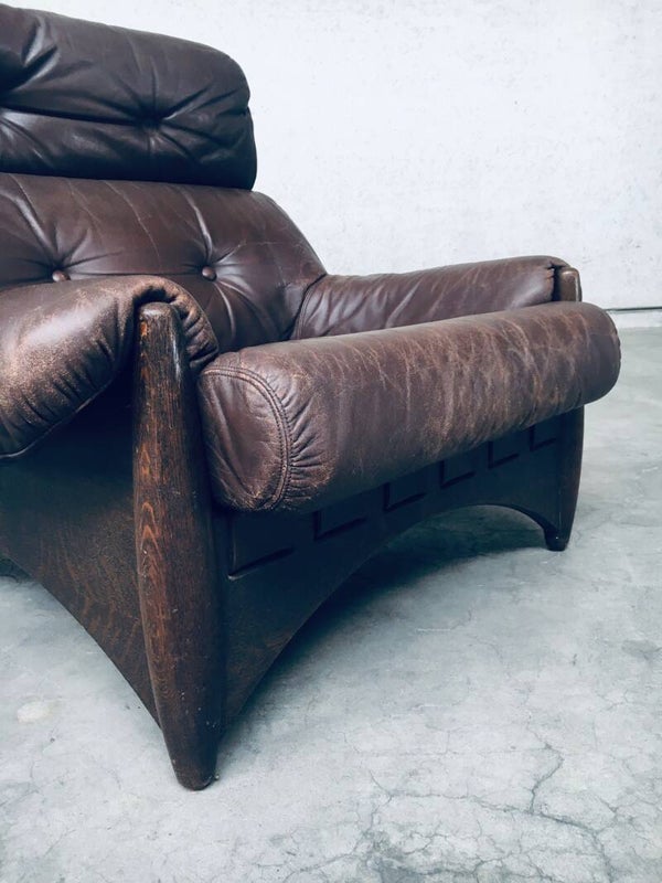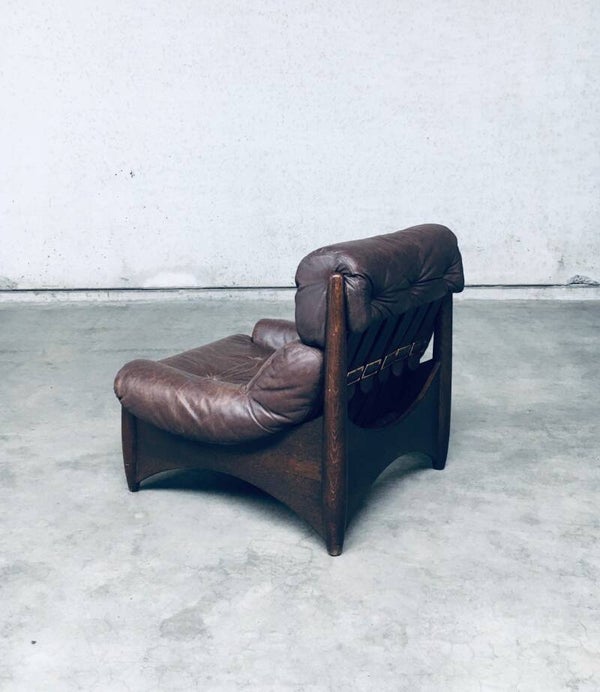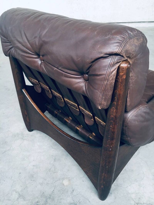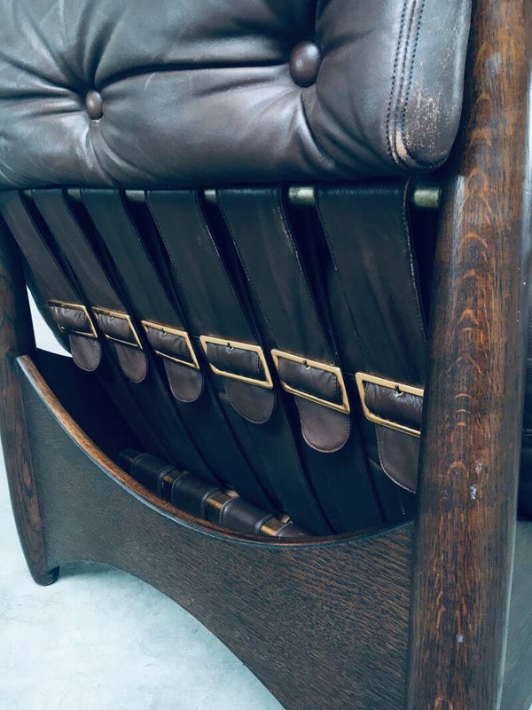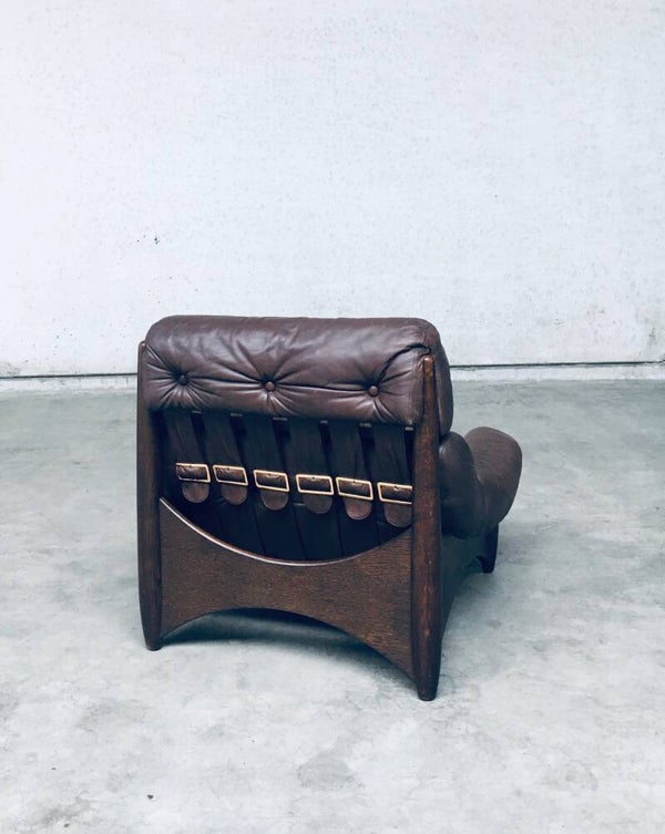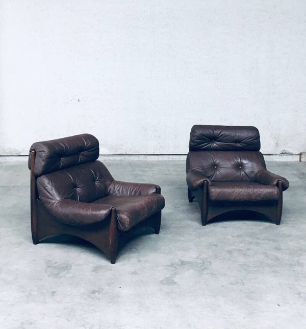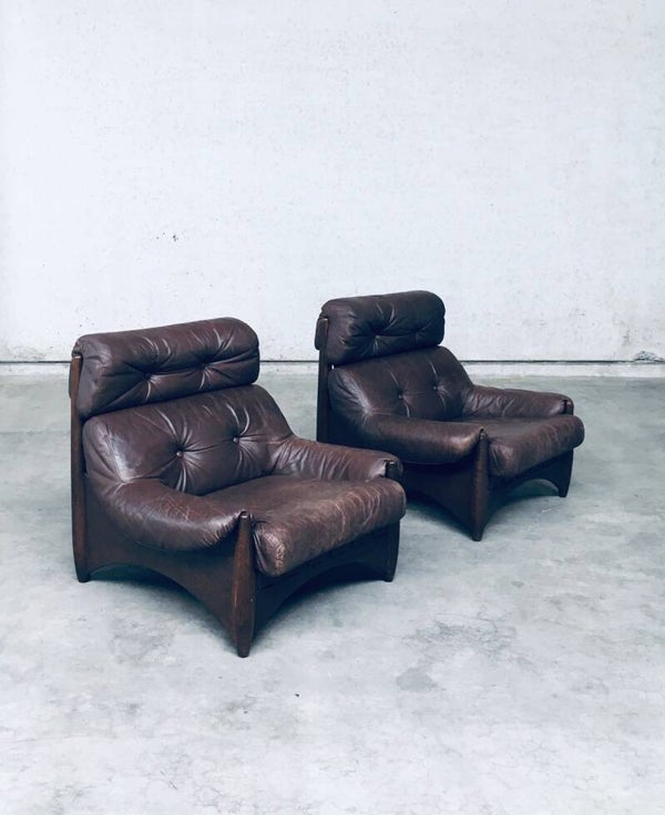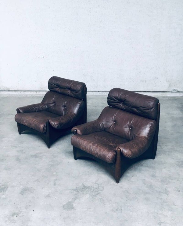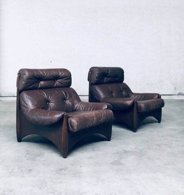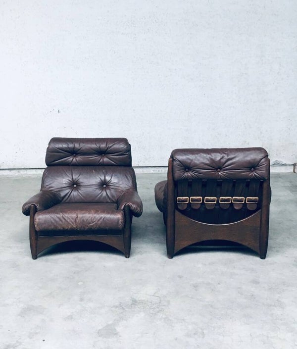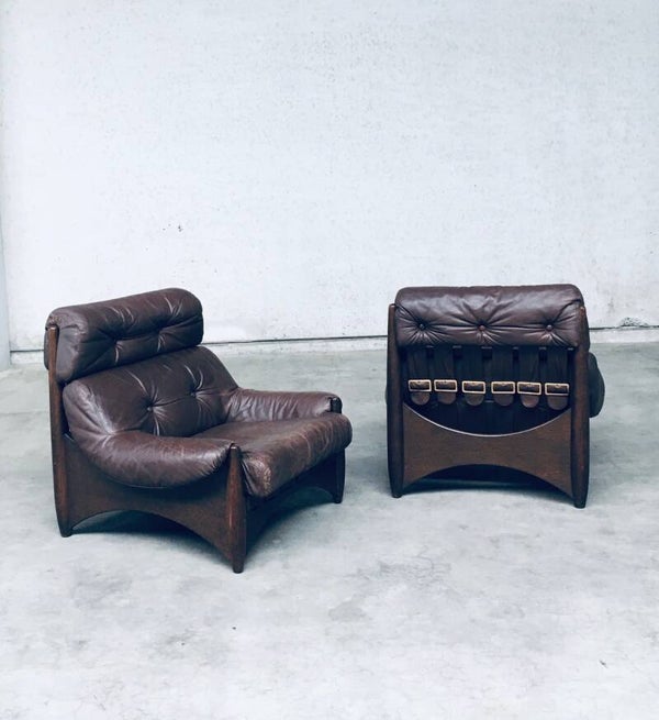 Vintage Midcentury Modern Brazilain Style Design Leather Lounge Chair set of 2. Made in the 1970's. Probably Belgium. No maker or manufacturer markings. Voluptious wide arm chairs with well formed wooden base and brown leather seats. At the back they have wide leather bands with large brass imitation buckles. They come in good, used condition. And show their age and use. Leather has wear markings, missing a couple leather captionated buttons and 1 brass imitation buckle has come partially loose. Overall, they are very cool and have a great comfortable sit. Each lounge chair measures 87cm x 97cm x 97cm.