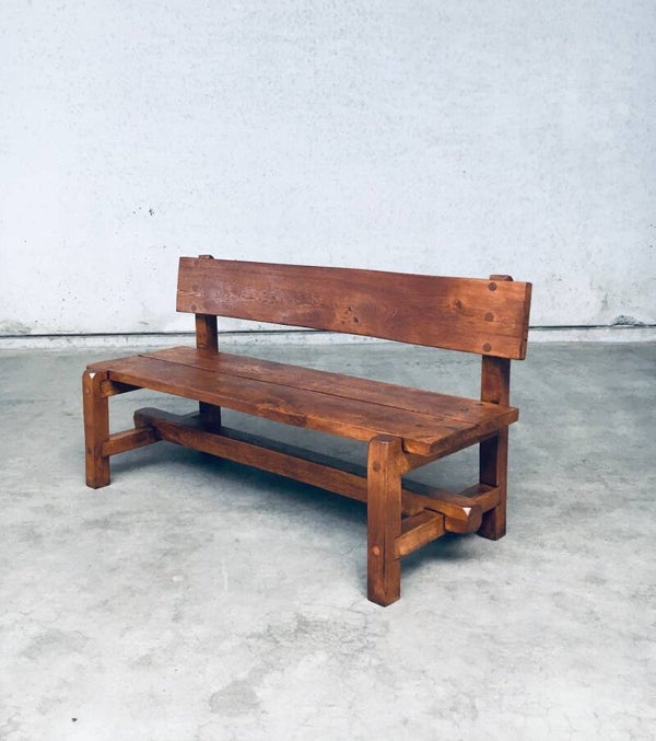 Vintage Midcentury period Brutalist Design Hand Crafted solid oak heavy Bench. Made in Belgium, 1960's / 70's period. Solid oak constrcuted heavy bench with thick beams and solid slabs of oak wood for seat and backrest. Nice constructivist in design. Hand made and well designed majestic bench. This has been refinished. Sanded, stained and varnished. Very good condition. Measures 87cm x 163,5cm x 64cm.