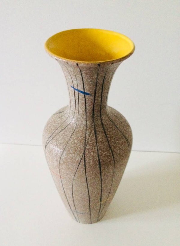 Vintage Midcentury Modern Design large ceramic vase with structure glaze, painted stripes and nice yellow glazed inside. 50cm model. Made in West Germany, 1960's. Has a small puncture, see picture.