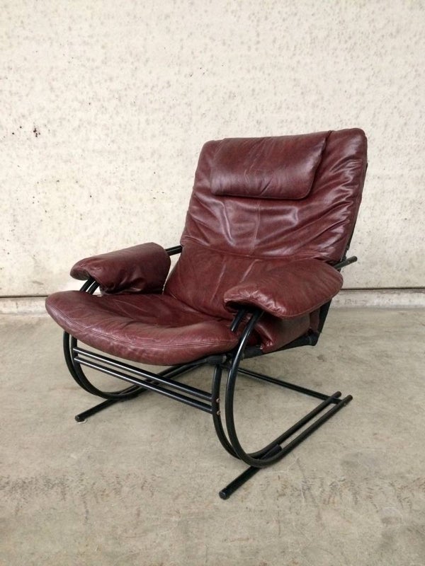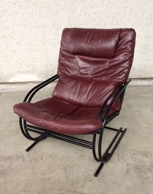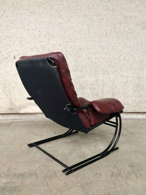 Vintage 1970's Midcentury Modern Design leather relax arm chair with metal frame and fabric cover. Ultra light metal tube frame with fabric cover and bordeaux leather seat that can be taken out. Adjustable. In good condition. High quality leather.