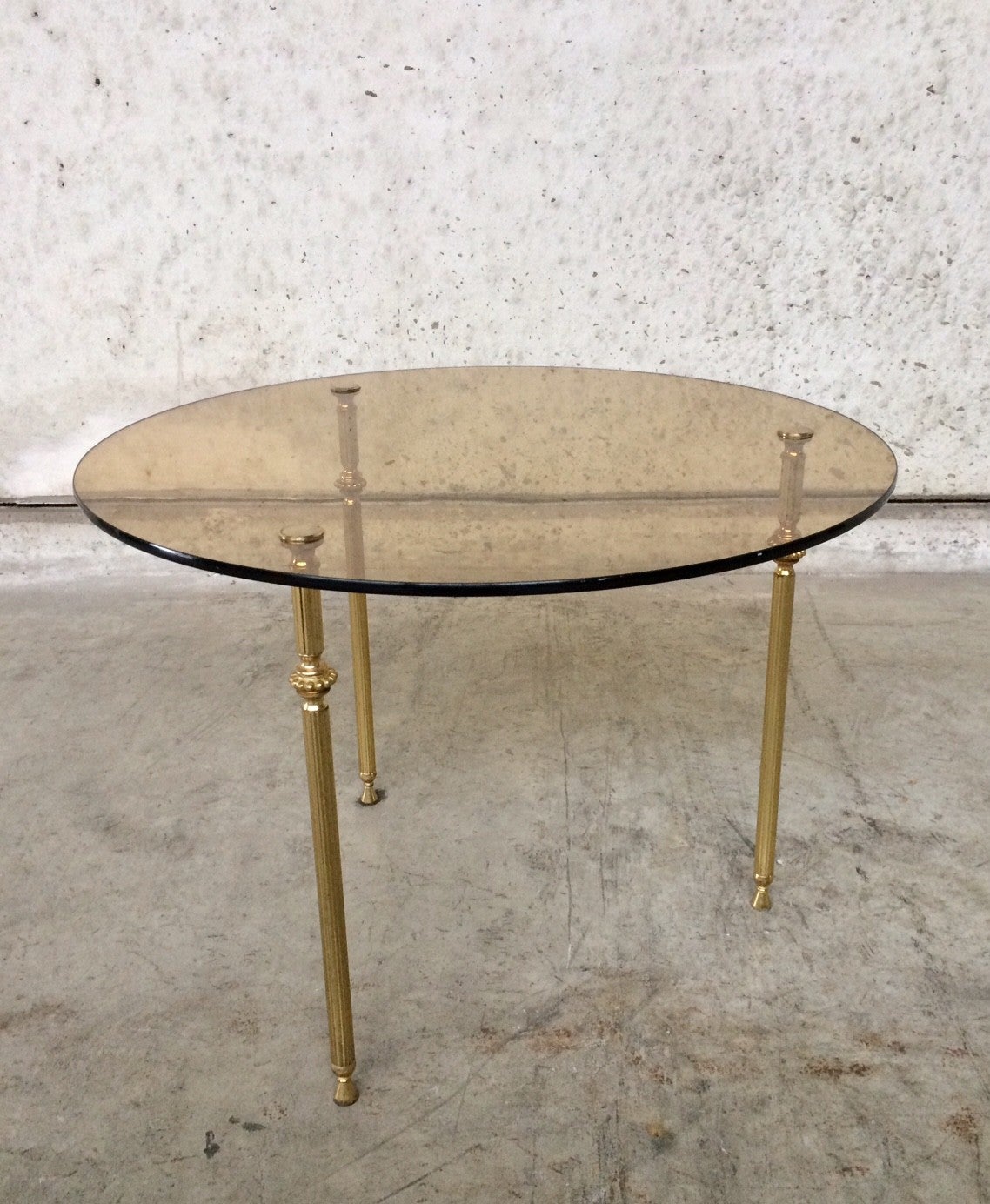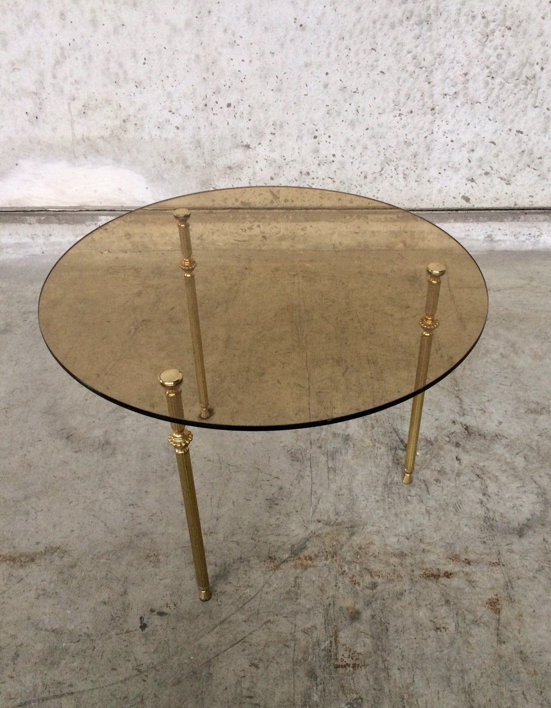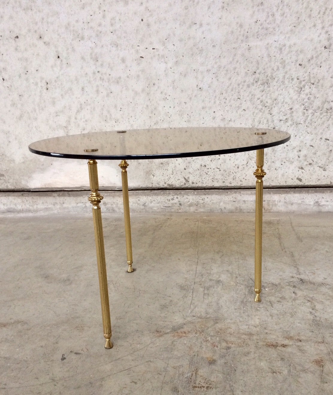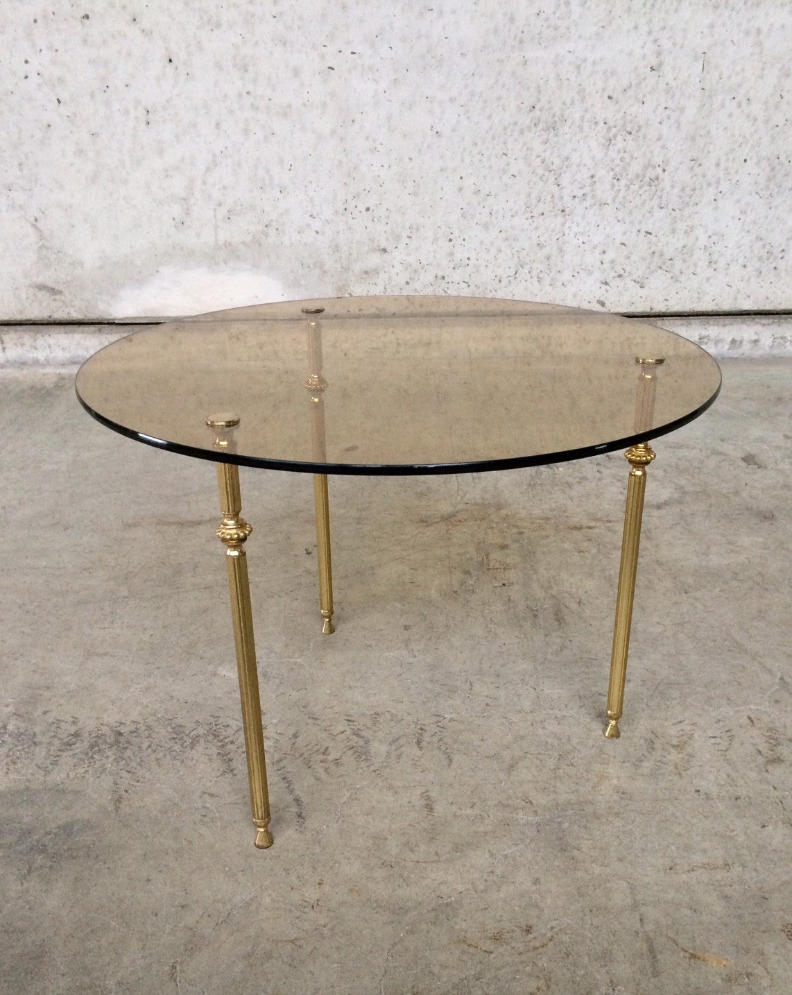 Vintage Midcentury Modern Hollywood regency 1960's Design round smoke glass side table with brass tripod legs. In perfect condition. 55cm x 55cm x 40cm.