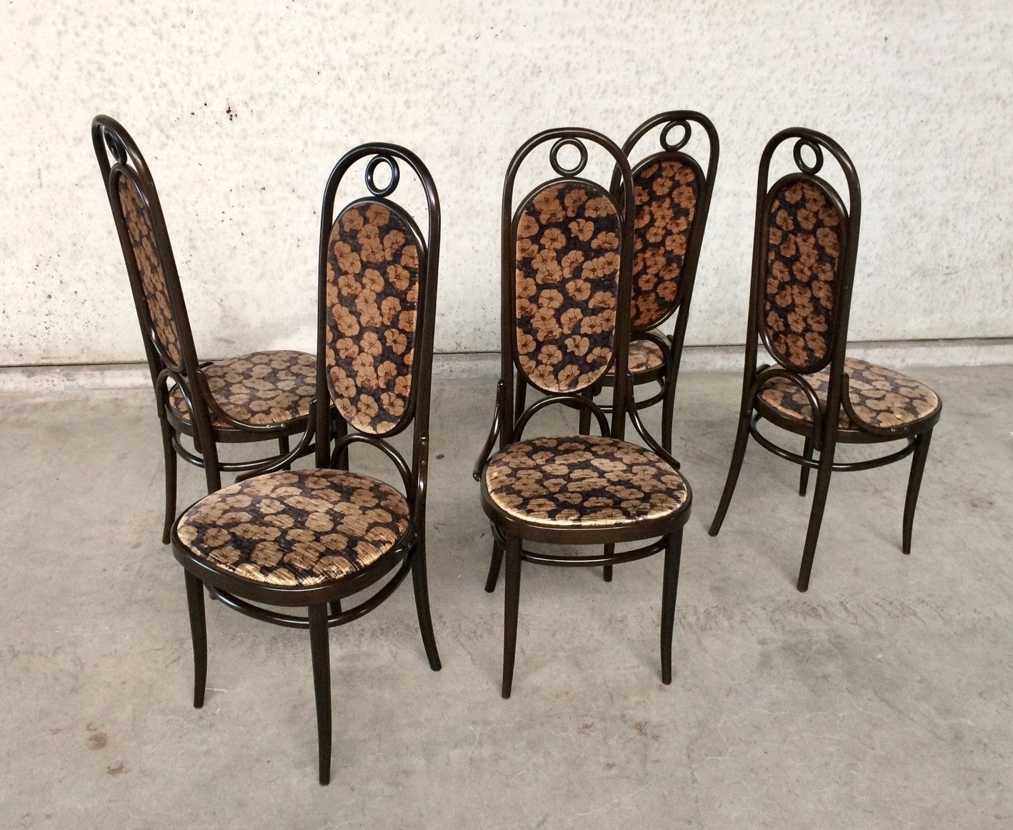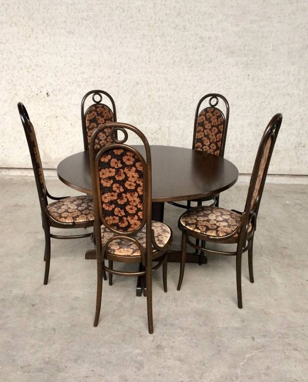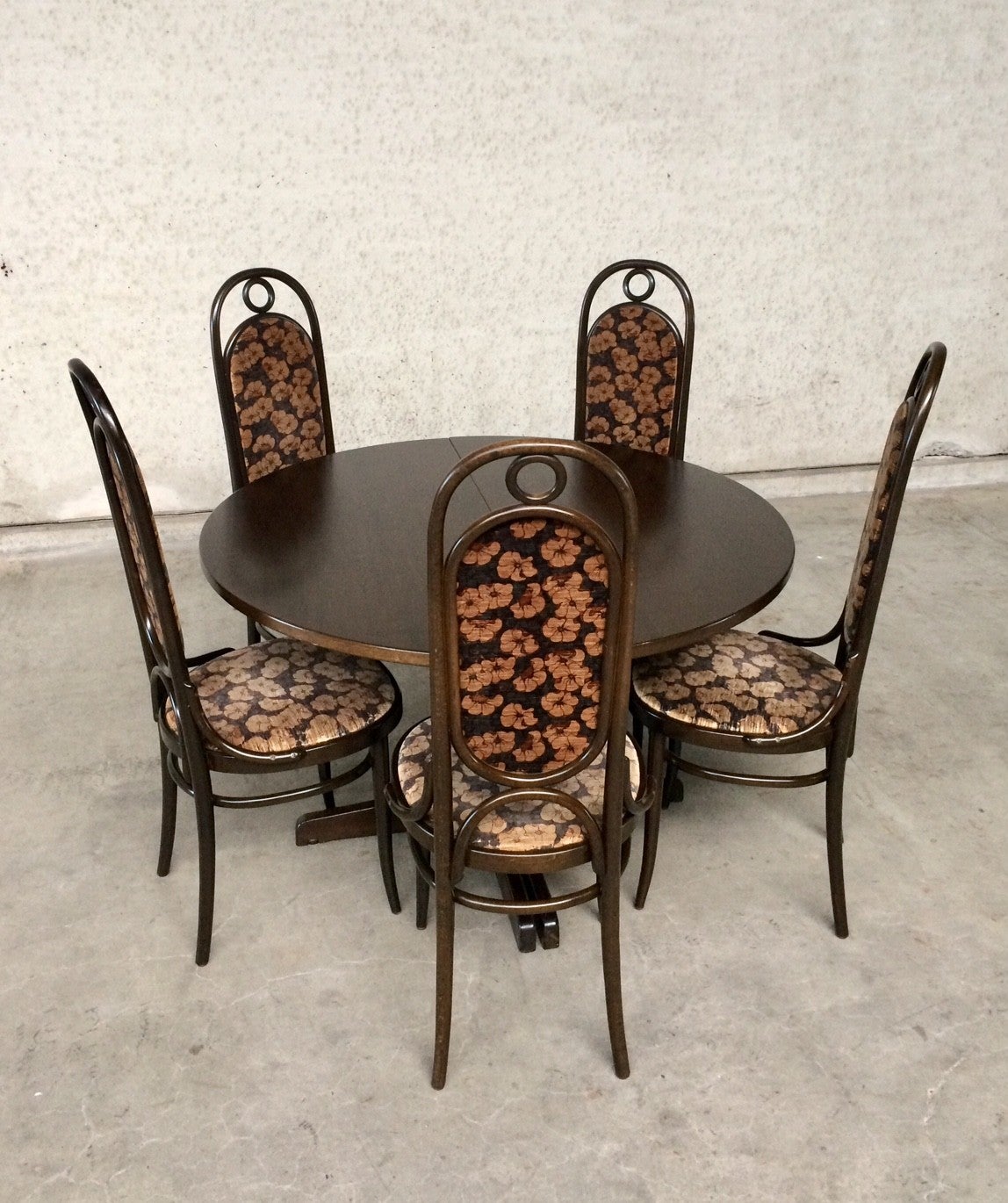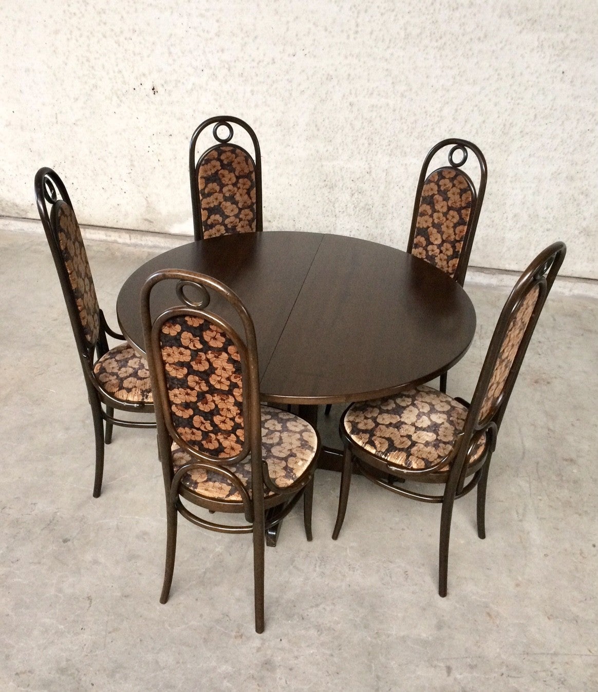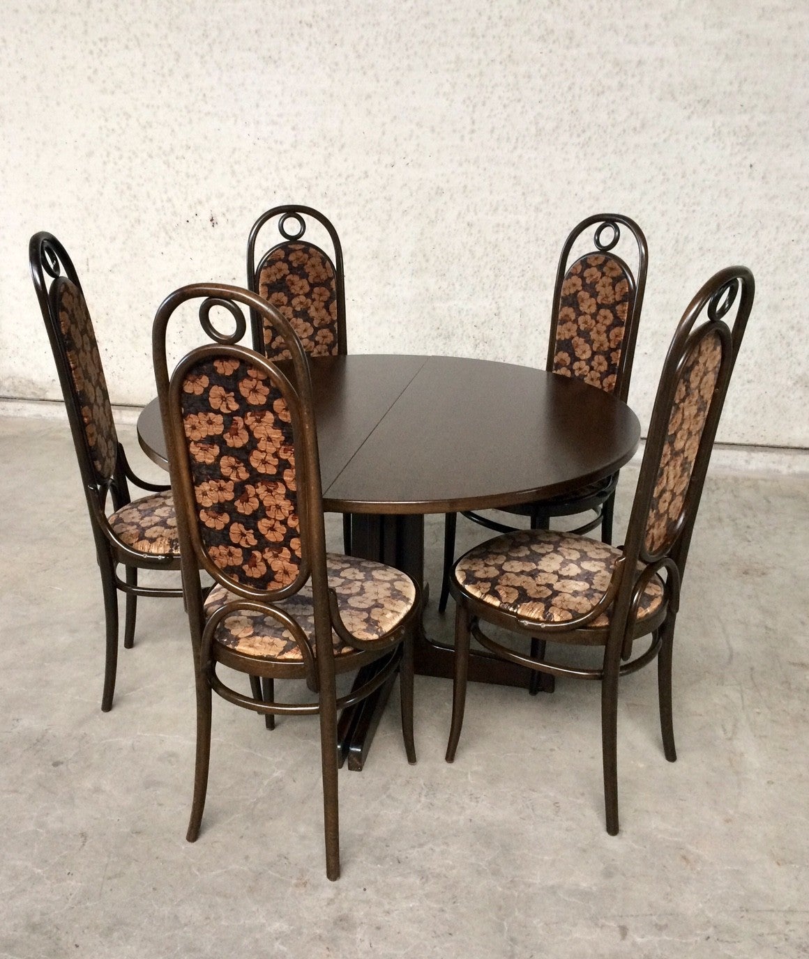 Vintage Midcentury Modern Design Dining Set. Set of 5 Model 207 R 'Long John' chair chairs & Extendable Table by Thonet. Marked Thonet79. 1979 issues. Table can be extended from a round table to a large 10 person table. Chairs come with original limited edition flower fabric covered seats and backs. All original. In good condition. A rare set.