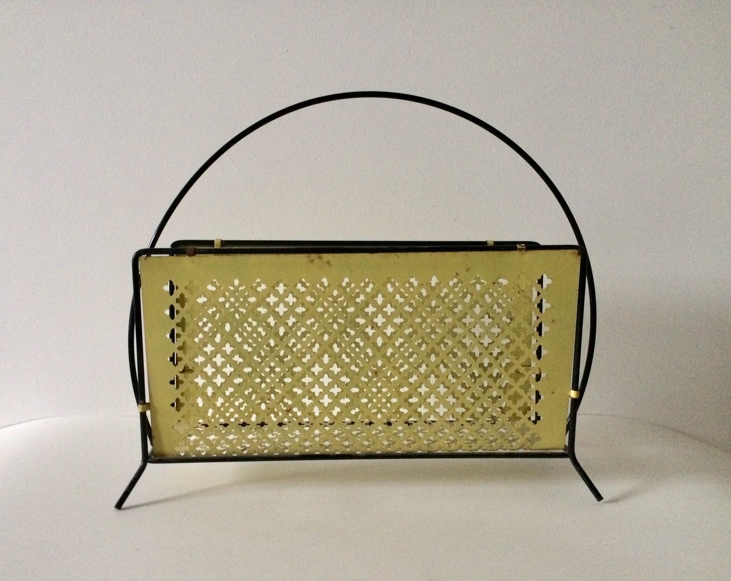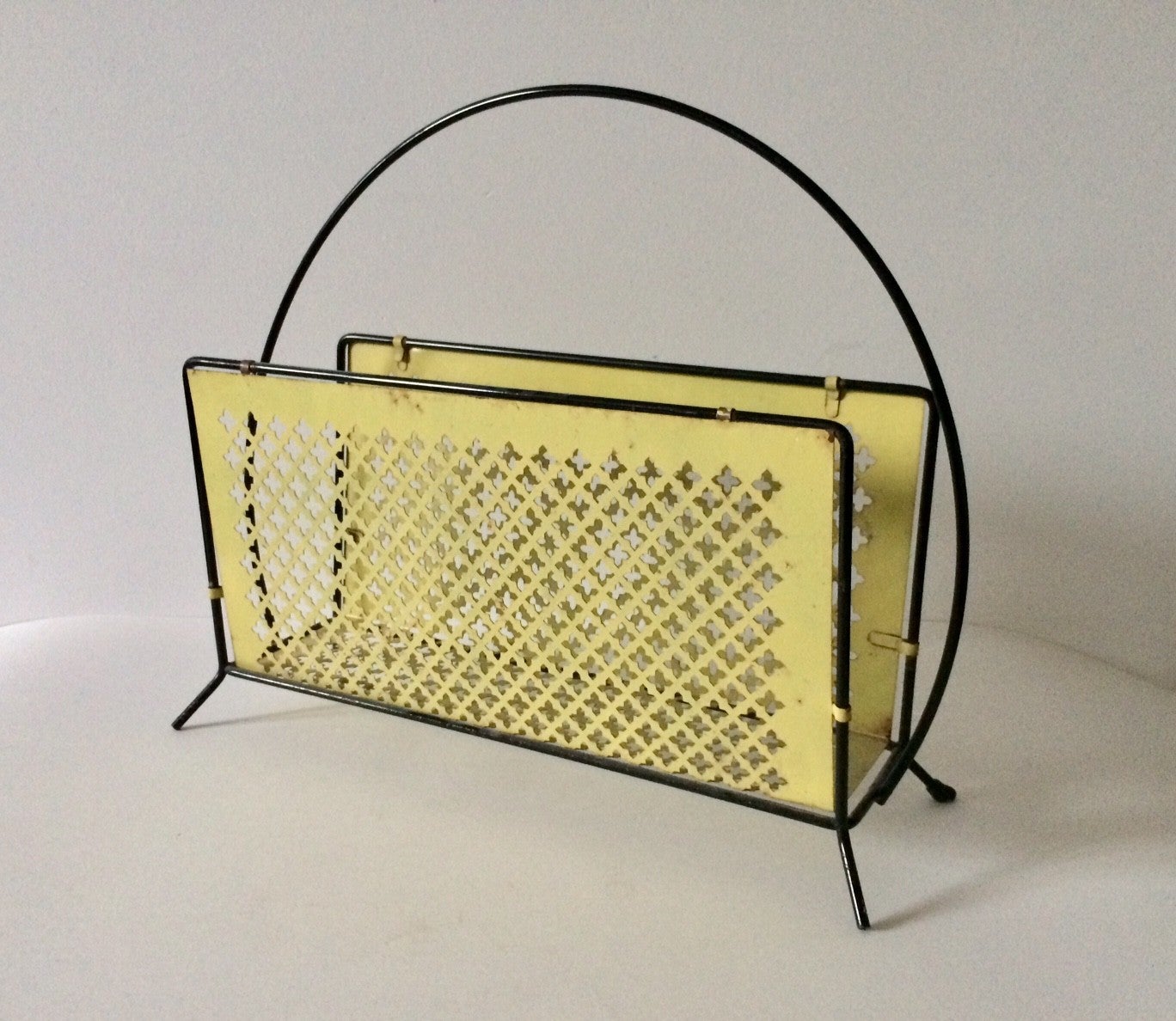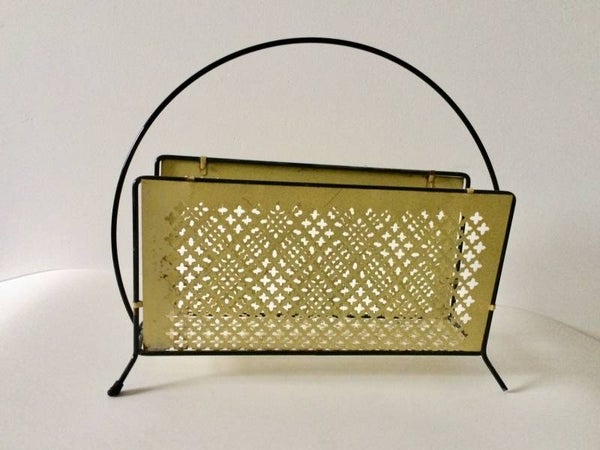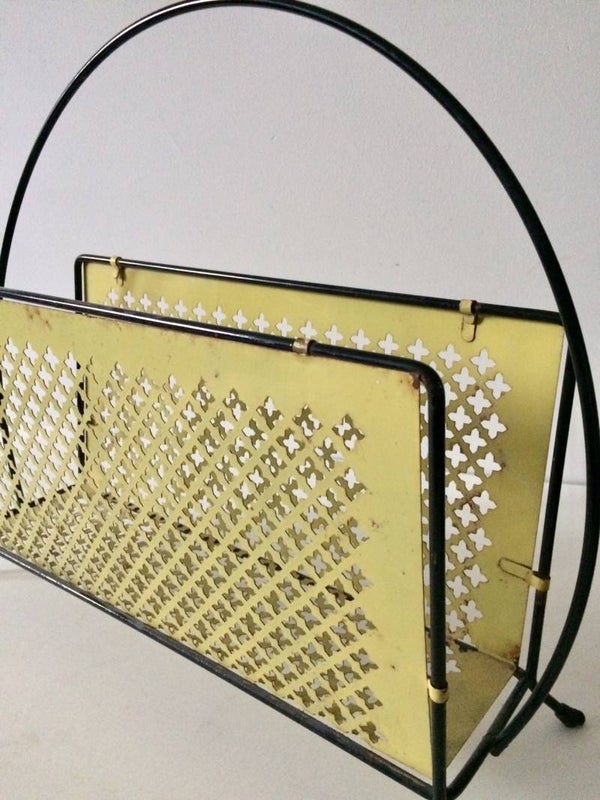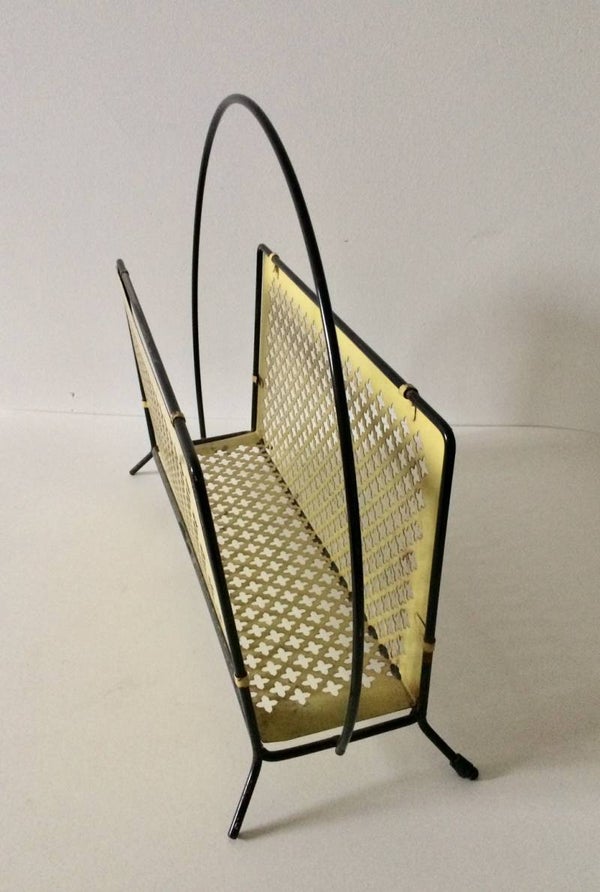 Vintage 1950's Midcentury Modern Design Perforated metal newspaper magazine holder. Black & yellow. In good condition. Made in France.