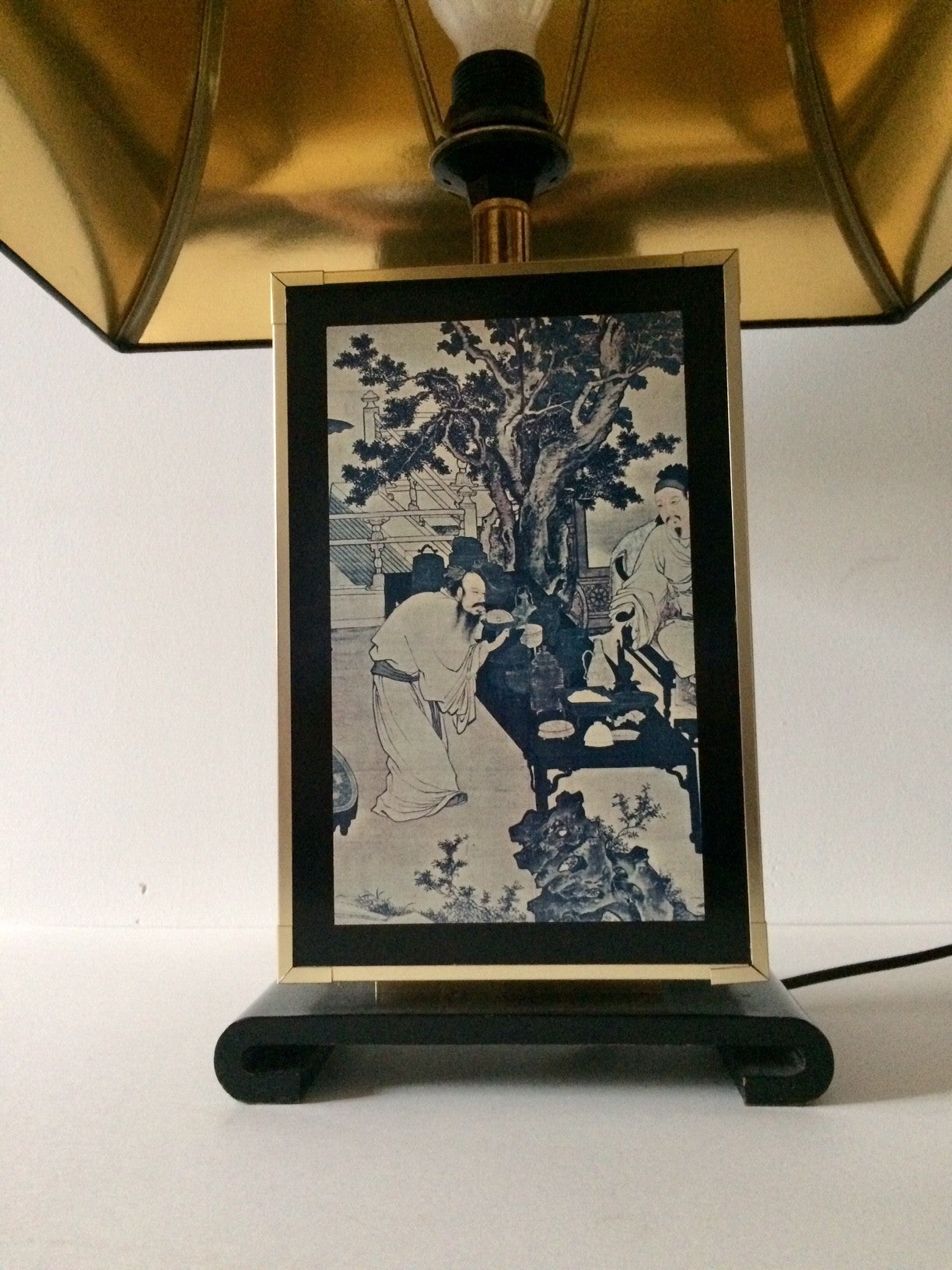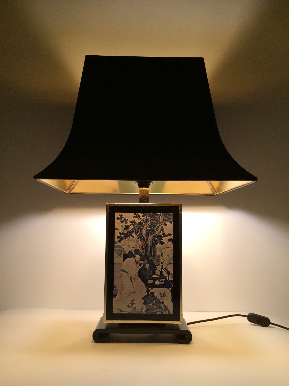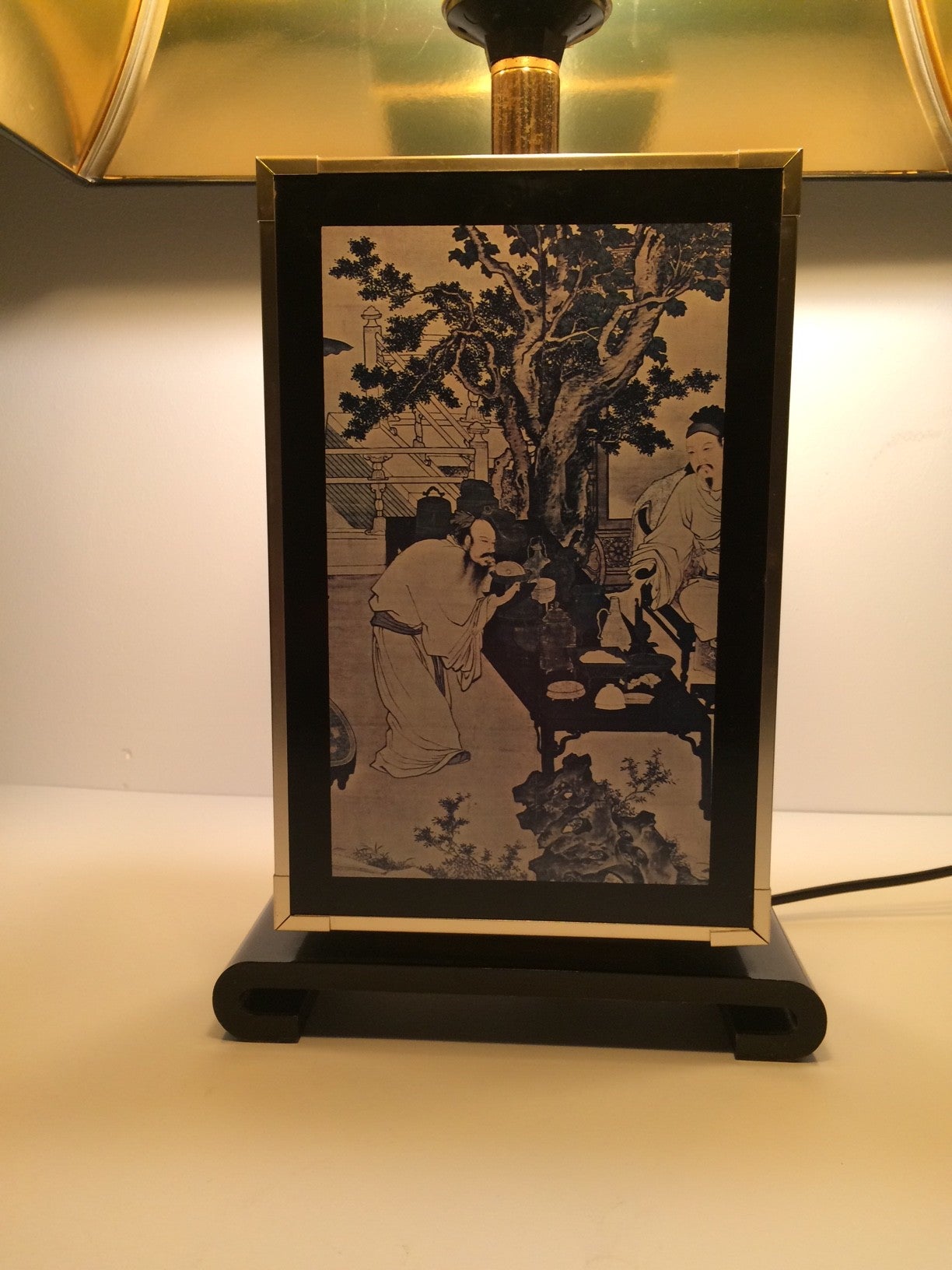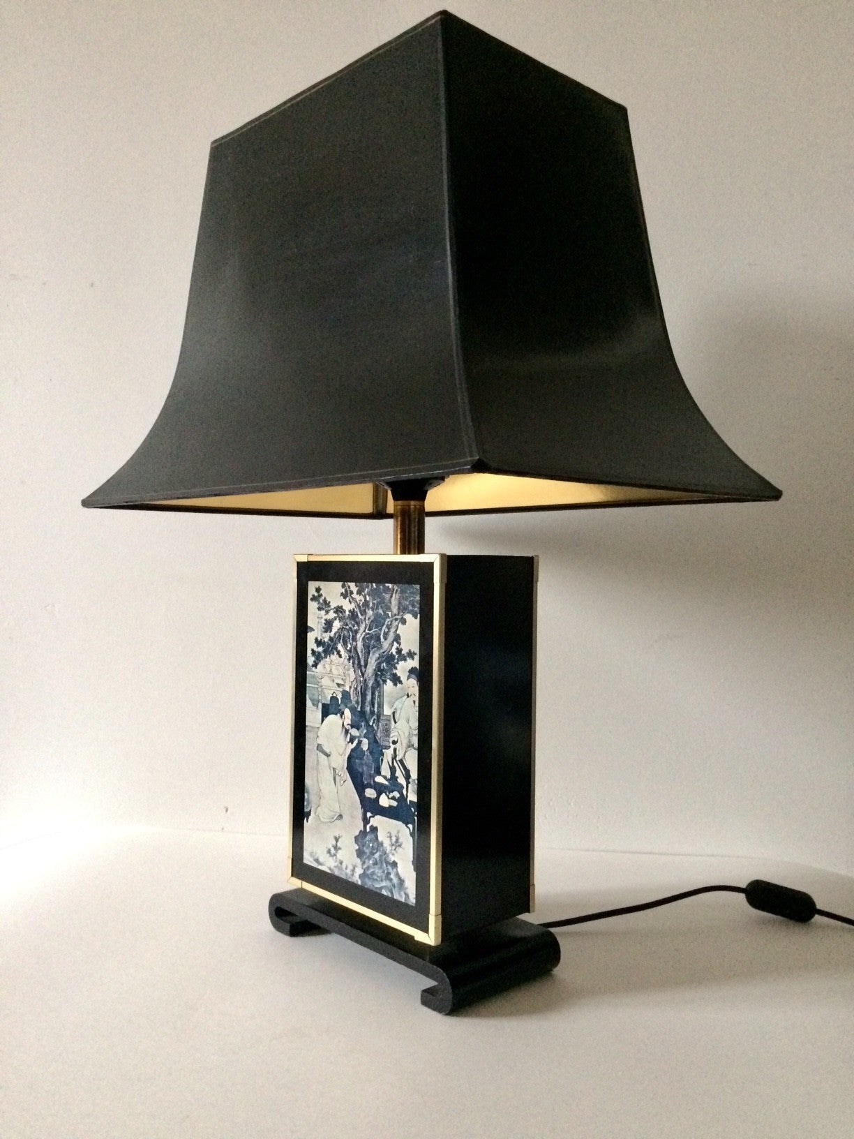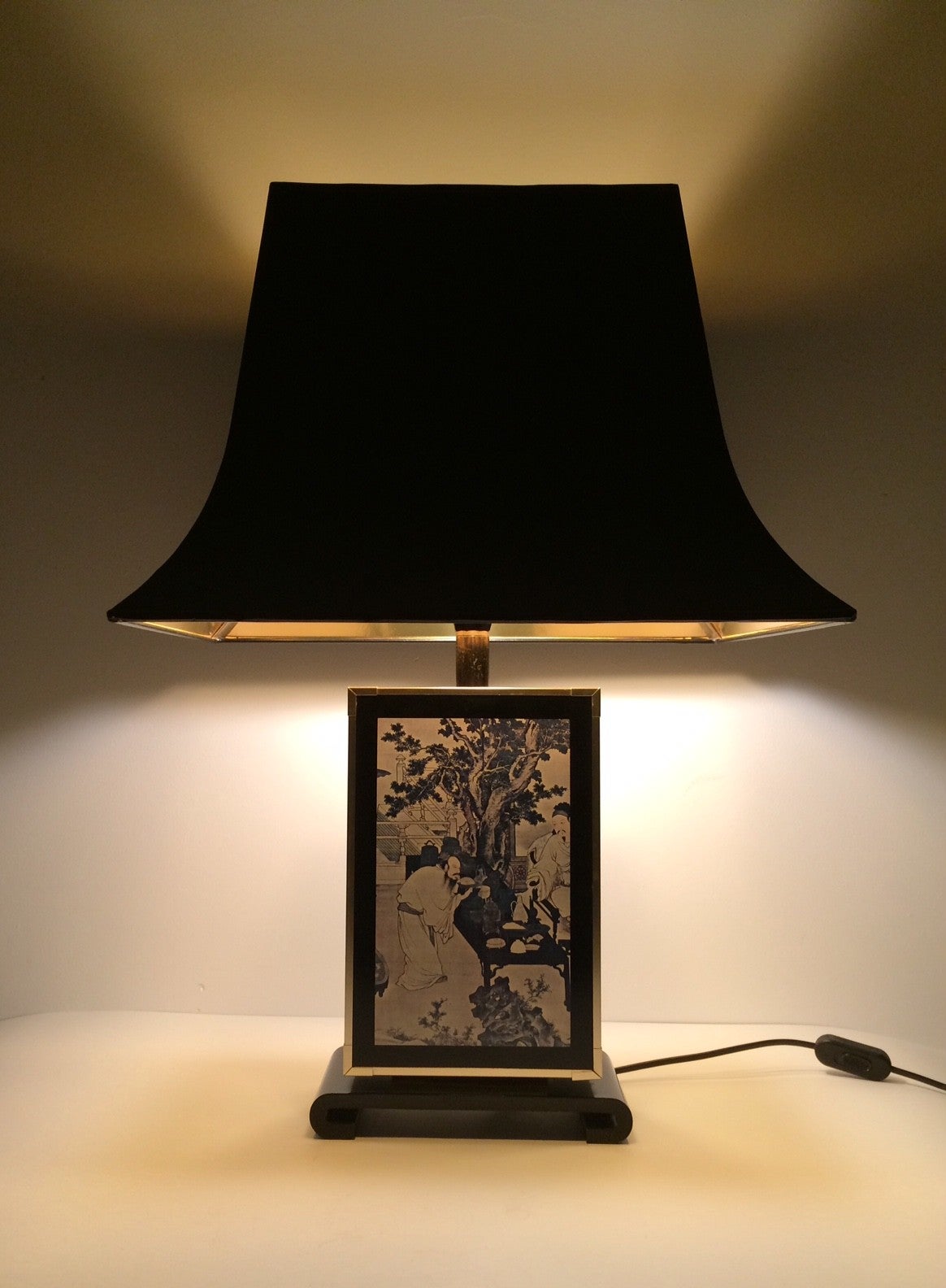 Vintage Midcentury Modern Design 'Tu Chin / Du Jin' large Table Lamp with Pagode style black & gold lampshade by Maison Le Dauphin, France, 1970's. Has "Enjoying Antiques" painting from the Ming Dynasty print on the front. In very good condition. 64cm x 45cm x 33cm.