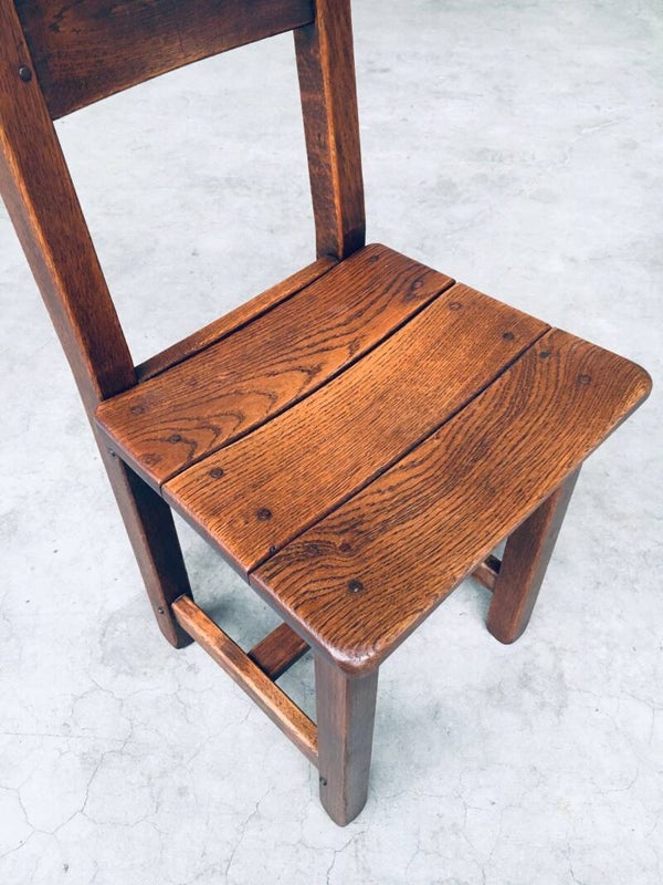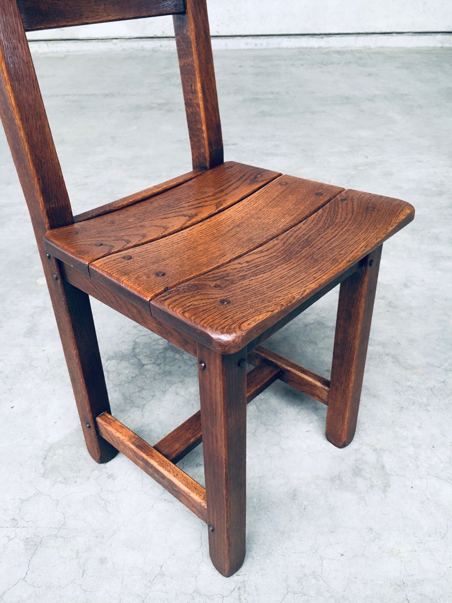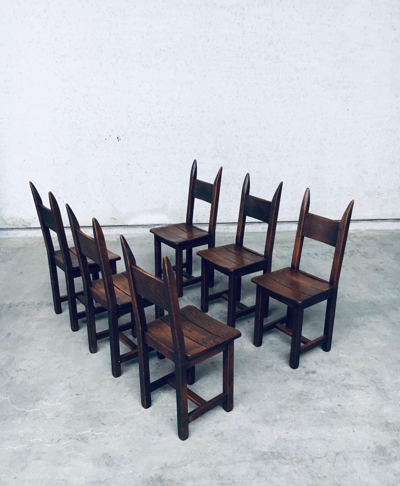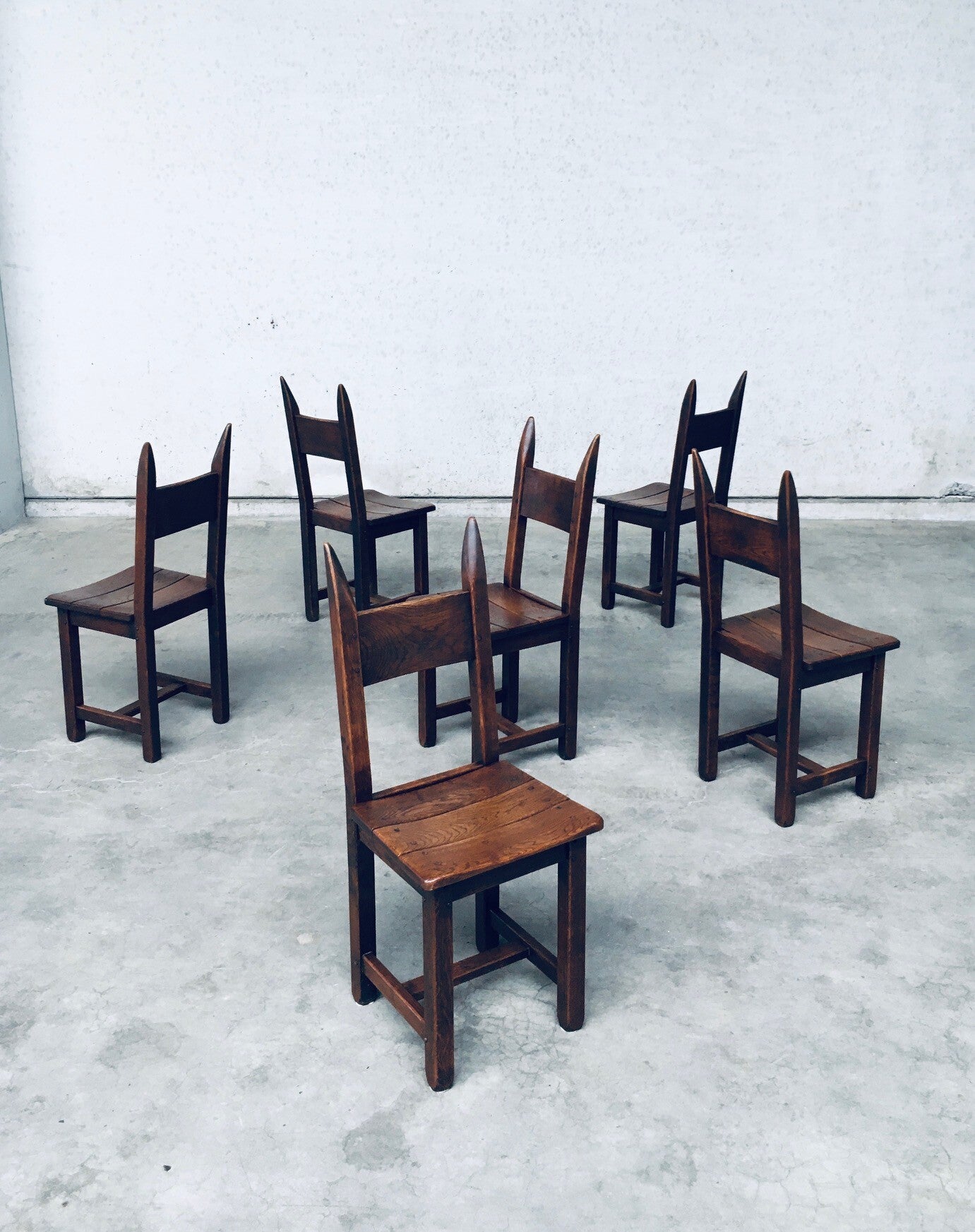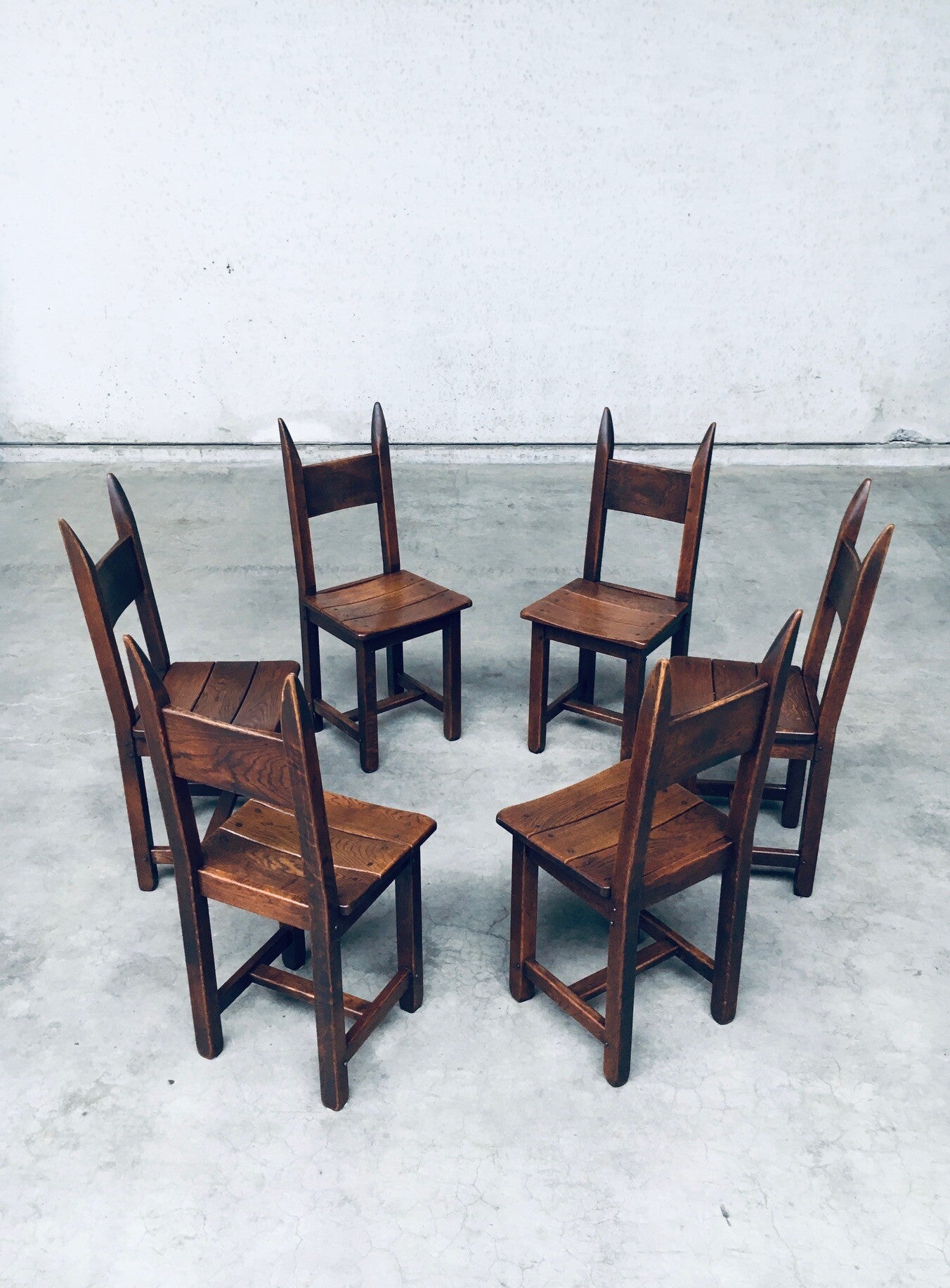 Vintage Brutalist Design Style Oak Dining Chair set of 6. Made in France, 1960's period. Solid oak constructed chairs with very nice dark patina. These are all in very good, all original condition. Each chair measures 95,5cm x 40cm x 40cm.