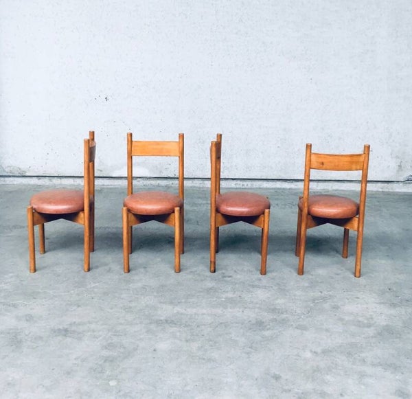Vintage Midcentury Modern Design Dining Chair set of 4 in the Style of Charlotte Perriand 'Meribel' Model chairs. Made in France, 1960's period. Beech constructed chairs with a faux leather cushion for seat. The chairs have round legs with an X frame to hold the cushion seat and a slender back rest. All chairs come in very good condition. Each chair measures 89cm x 40cm x 42cm.