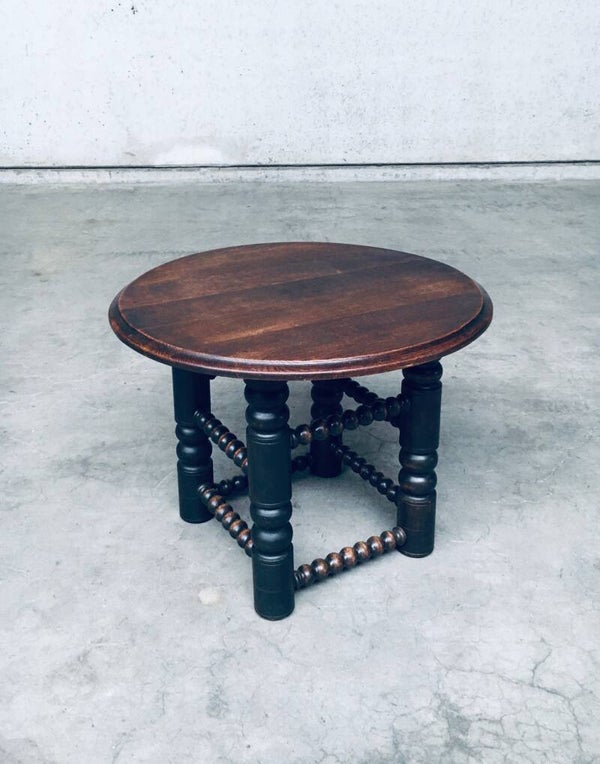 Vintage French Modernist Design Side Table in the Style of Charles Dudouyt. Made in France, 1930's period. Dark stained elm wood constructed small round side table. 4 turned legs with bobbin turned cross spindles. Well executed and designed small side table. This comes in good all original condition. Measures 51cm x 64,5cm x 64,5cm.