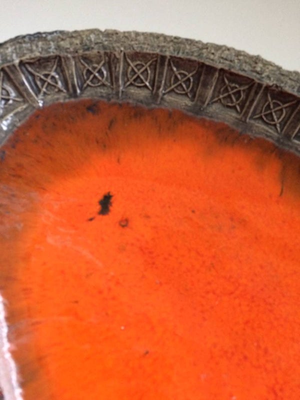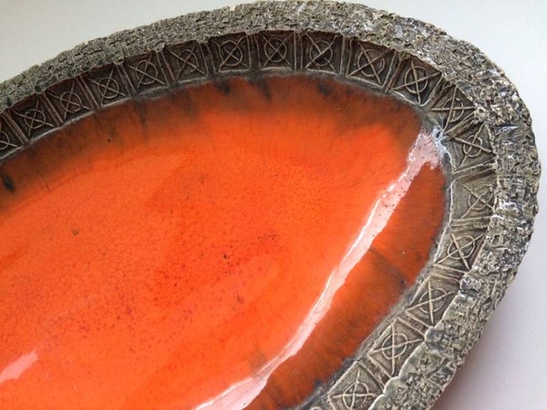 Vintage Midcentury Modern Design Perignem Art Pottery Studio large ceramic orange glazed dish with stamp motif at border by Jan Ryheul, Brugge, Belgium, 1960's. In good condition, 3 very small infractions at border. 36cm x 22cm x 4,5cm.