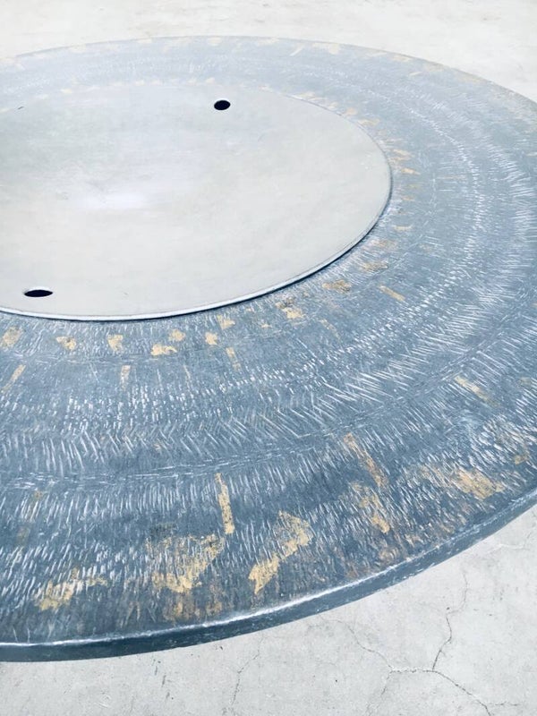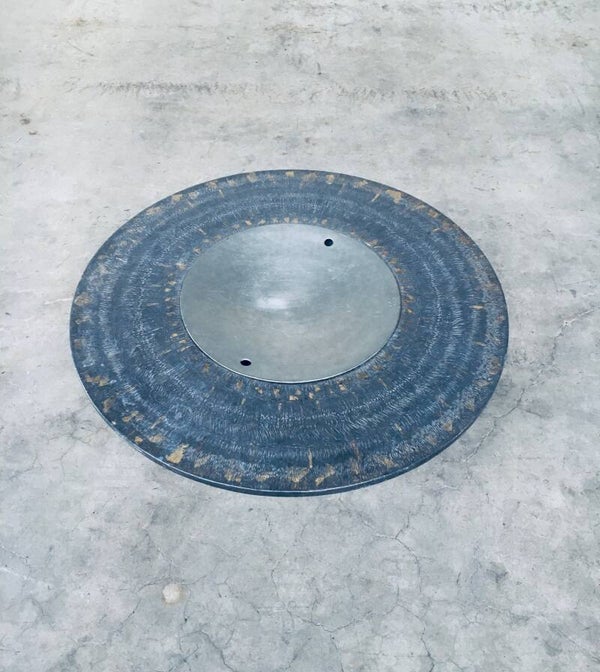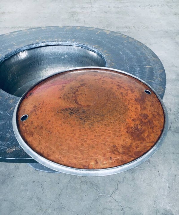 Vintage Handmade Folk Art Bar Coffee Table. Made in India, 1970's period. This round coffee table is made from hammered lead sheets over wood panels. This has an central aluminium round shaped lid where you can put an icebucket in to keep your drinks cool. The lead top is finished with gold markings. This is a rare piece and one of a kind. Comes in very good, all original condition. Measures 43cm x 95cm x 95cm.