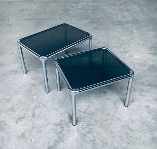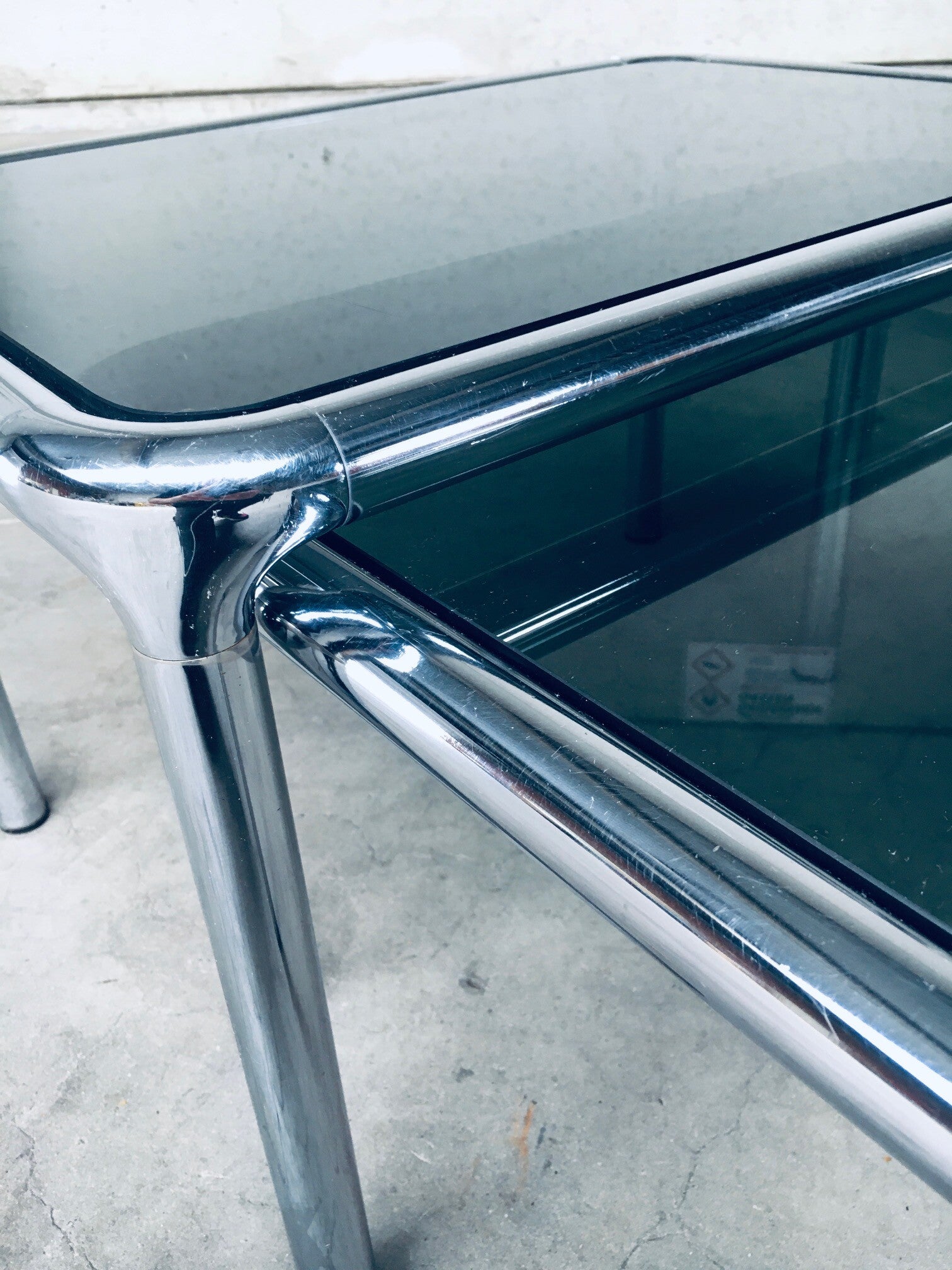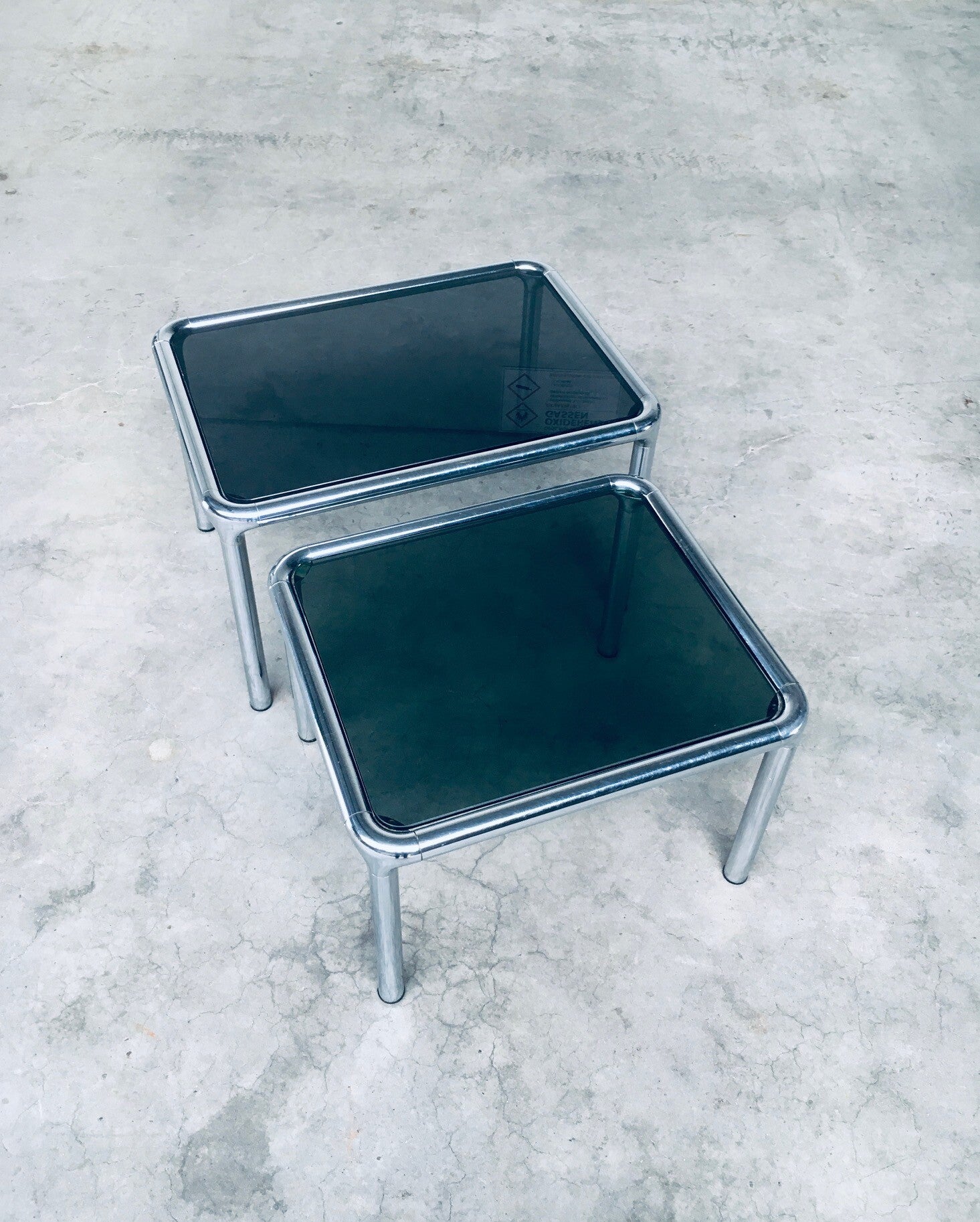 Vintage Midcentury Modern French Design Chrome Steel & Smoked Glass Nesting Table set of 2. Designed by Etienne Fermigier. Made in France, 1970's period. This is a very nice and good designed set. Both tables are in very good condition with minor signs of their age and use. The larger table measures 45,5cm x 72cm x 52cm. The smaller table measures 40cm x 60cm x 52cm.