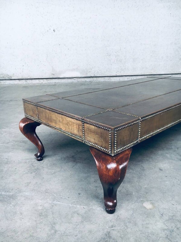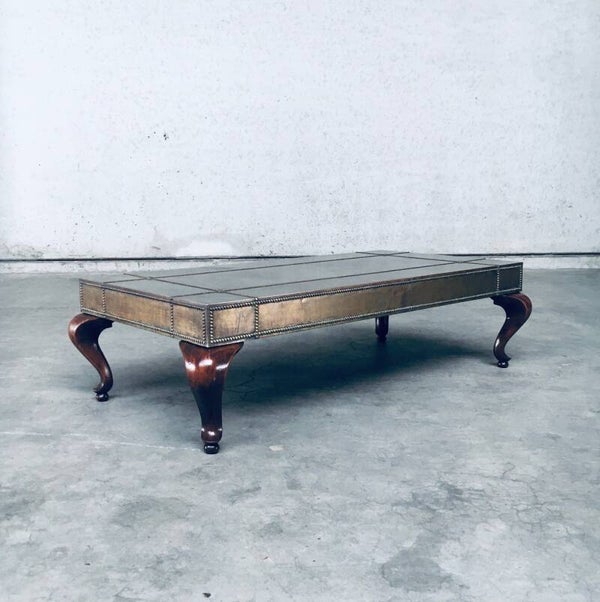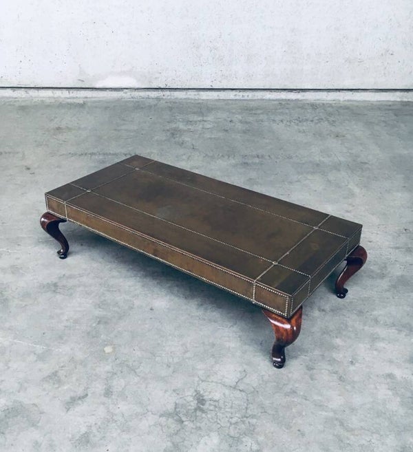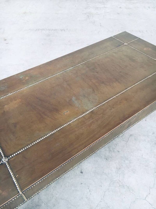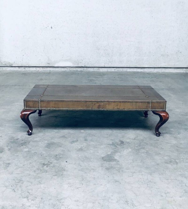 Vintage Eclectic Design Brass Coffee table. Made in France, 1950's / 60's period. No maker marks. Brass sheet covered top with curved solid wooden legs. The brass sheets have nice brass studs in a rectagular pattern. This has very nice patina with darker stained wooden legs. This comes in very good condition. Measures 38cm x 143cm x 76cm.