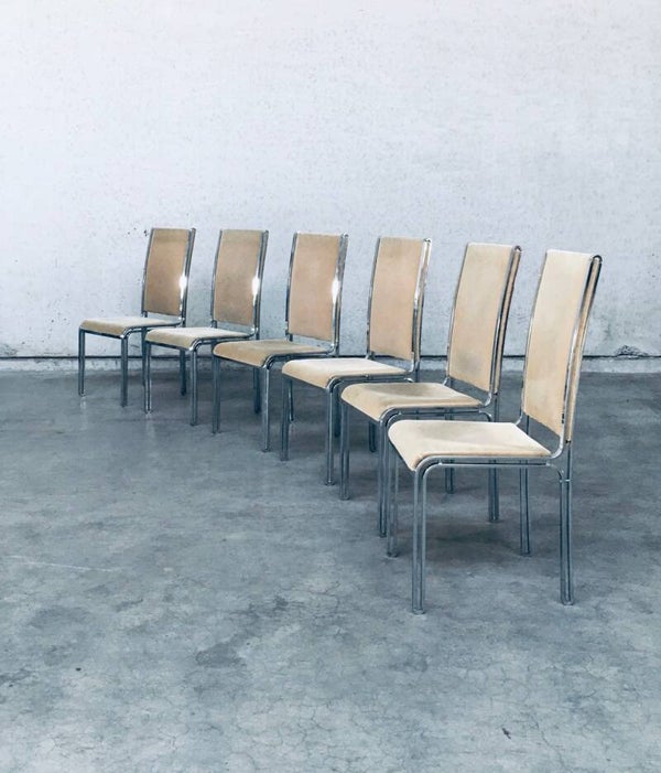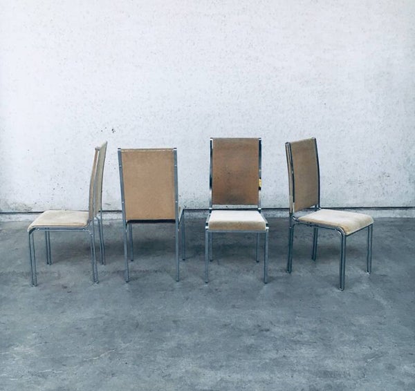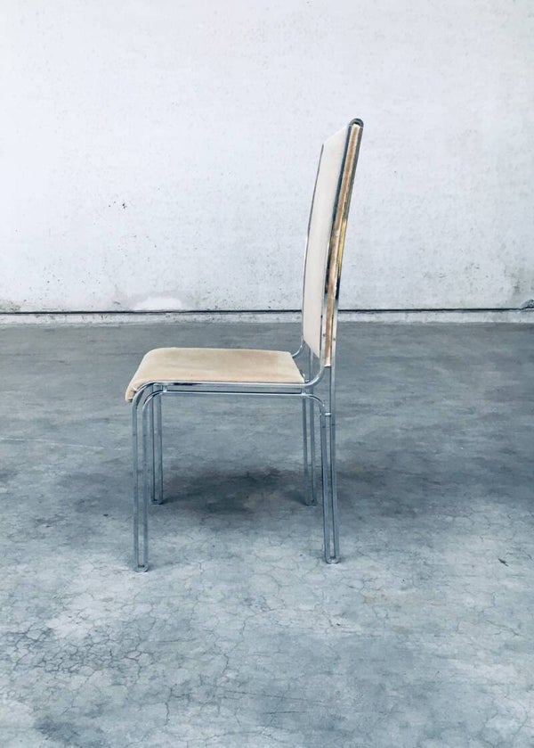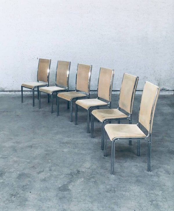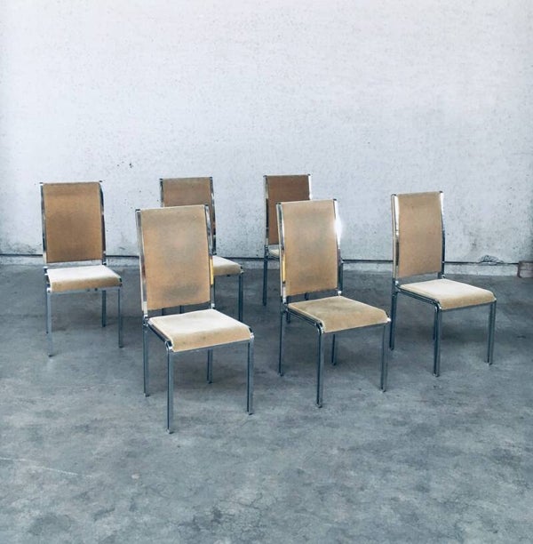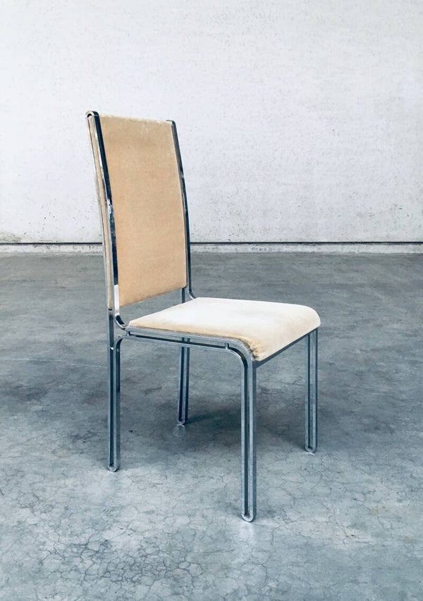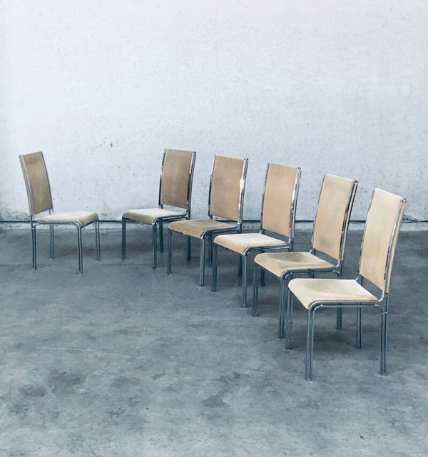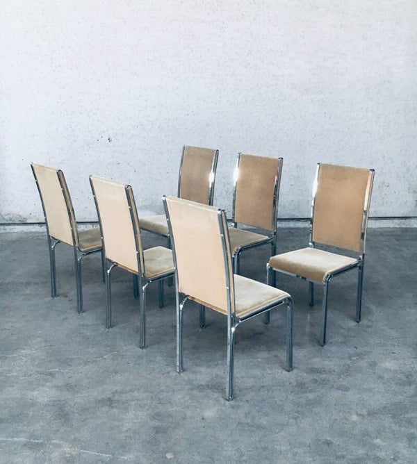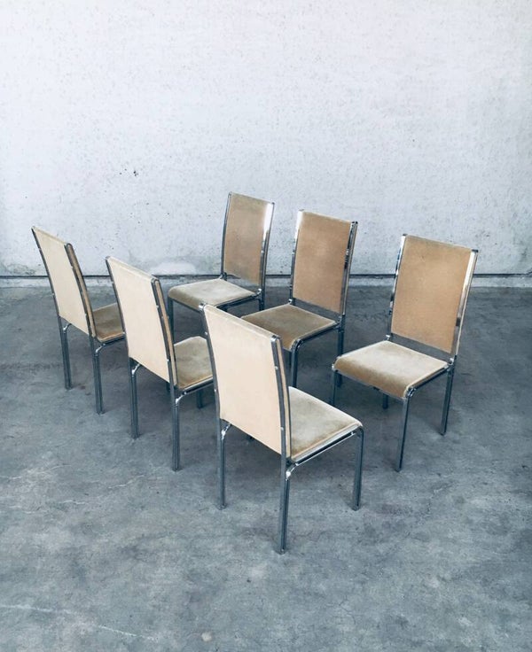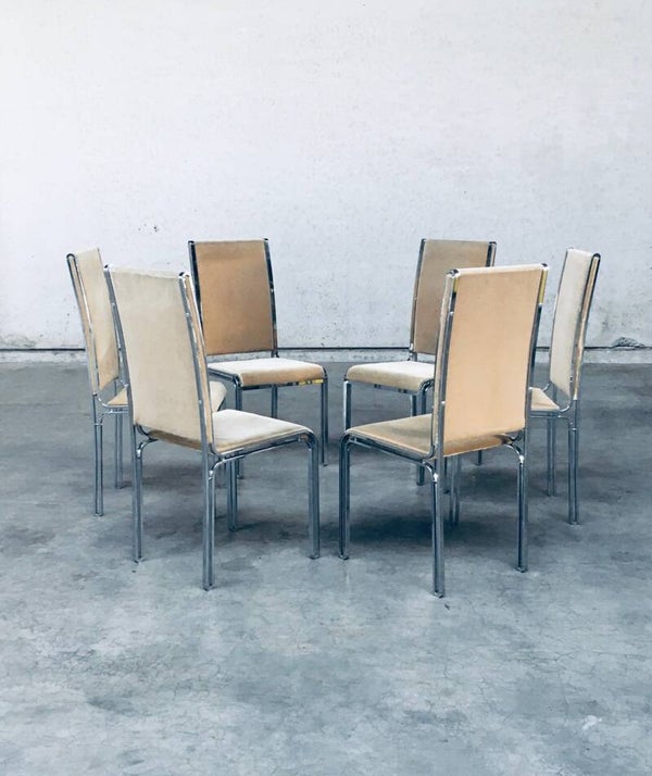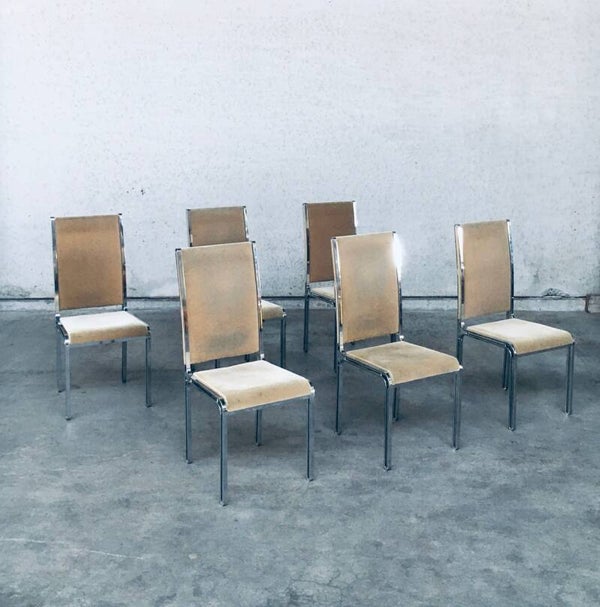 Vintage Midcentury Hollywood Regency Style Design Dining Chair set by Romeo Rega. Made in Italy, 1970's period. Design in the manner of Willy Rizzo. Set of 6 chairs with chromed metal base and olive green beige velvet seat and back covers. The base has an open structure design which gives these chairs a more airy feel. They are all in very good condition with minor small stains and some wear on the chrome metal parts. Normal wear for their age and use. Each chair measures 104cm x 46cm x 51cm.