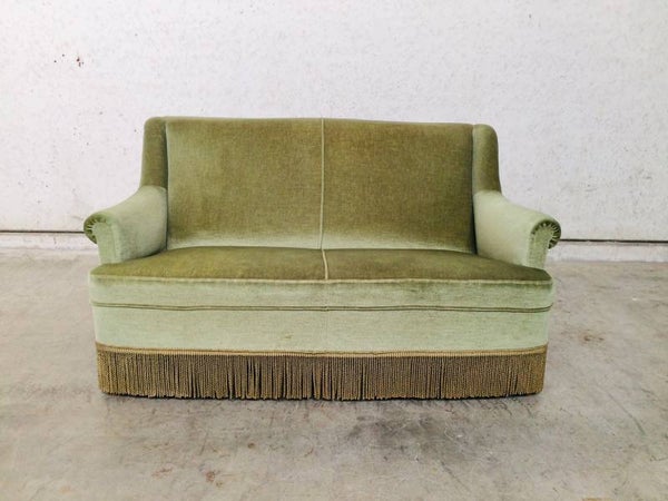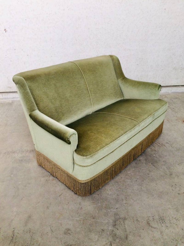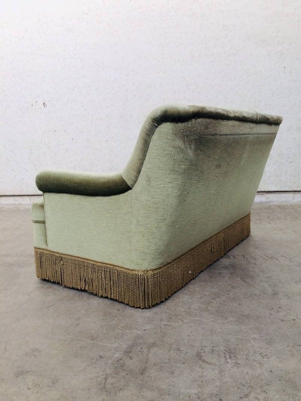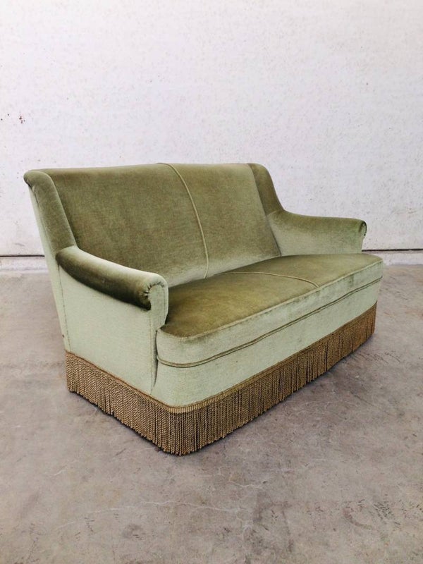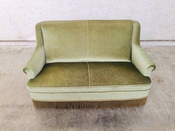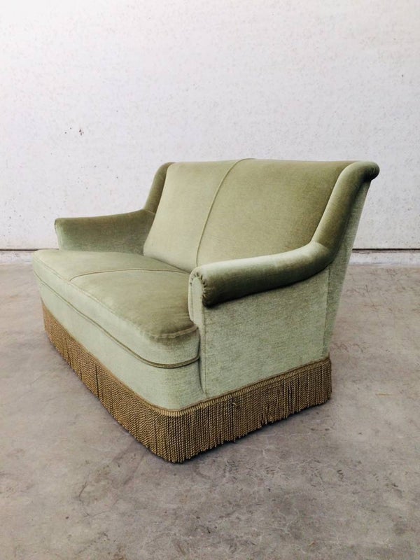 Vintage Midcentury Modern Design Velvet green 2 seat Sofa with fringe from the 1960's. In very good original condition.
