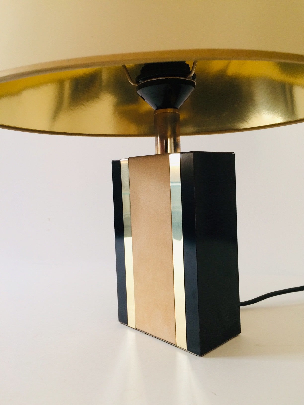 Vintage Midcentury Modern Design Hollywood Regency Style mini Table lamp with brass, suede leather and laquer finish. Made by Maison Le Dauphin, France, 1970's. In very good condition, complete with gold interior lampshade. 43cm x 35cm x 35cm.