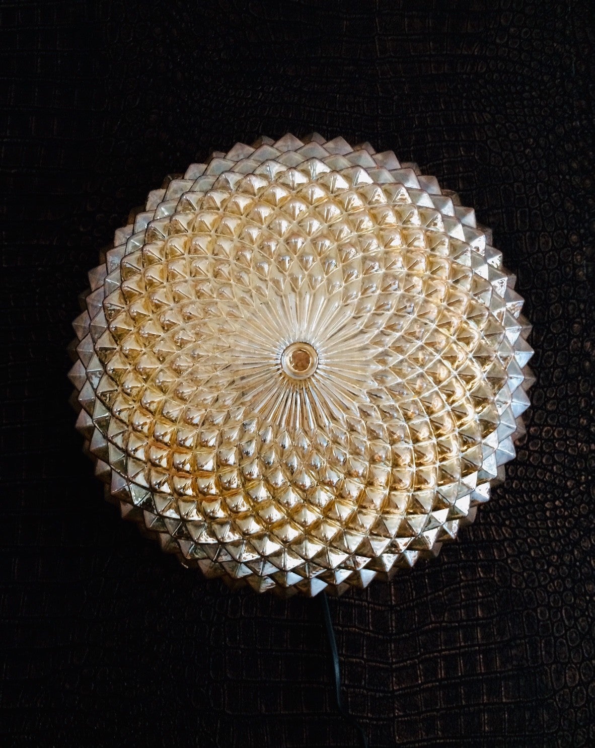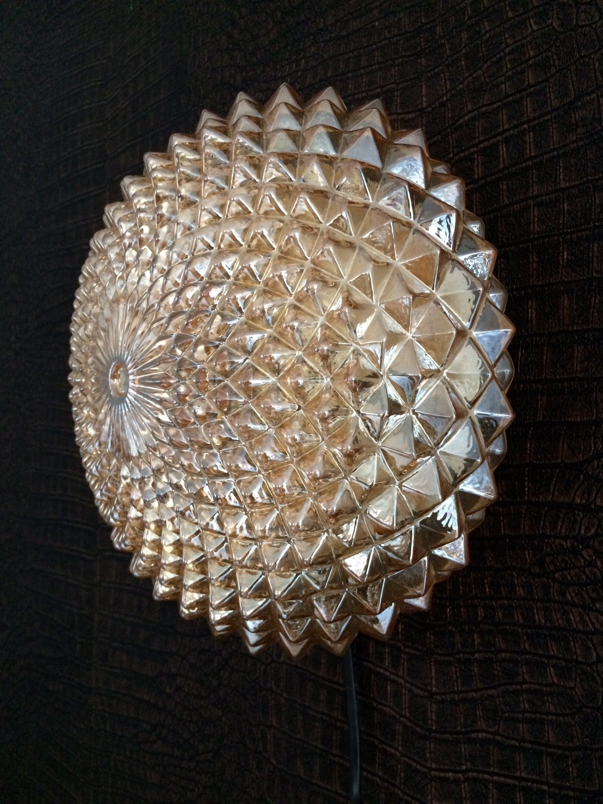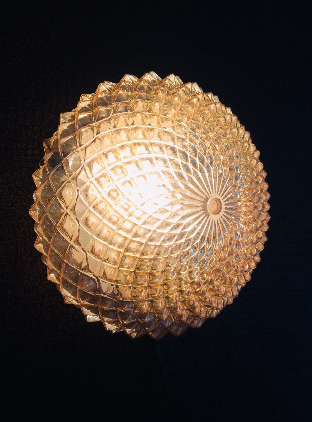Vintage Midcentury Modern Design gold glass sconce wall or ceiling lamp. Made in Germany, 1970's. In very good condition. 24cm x 24cm x 11cm.