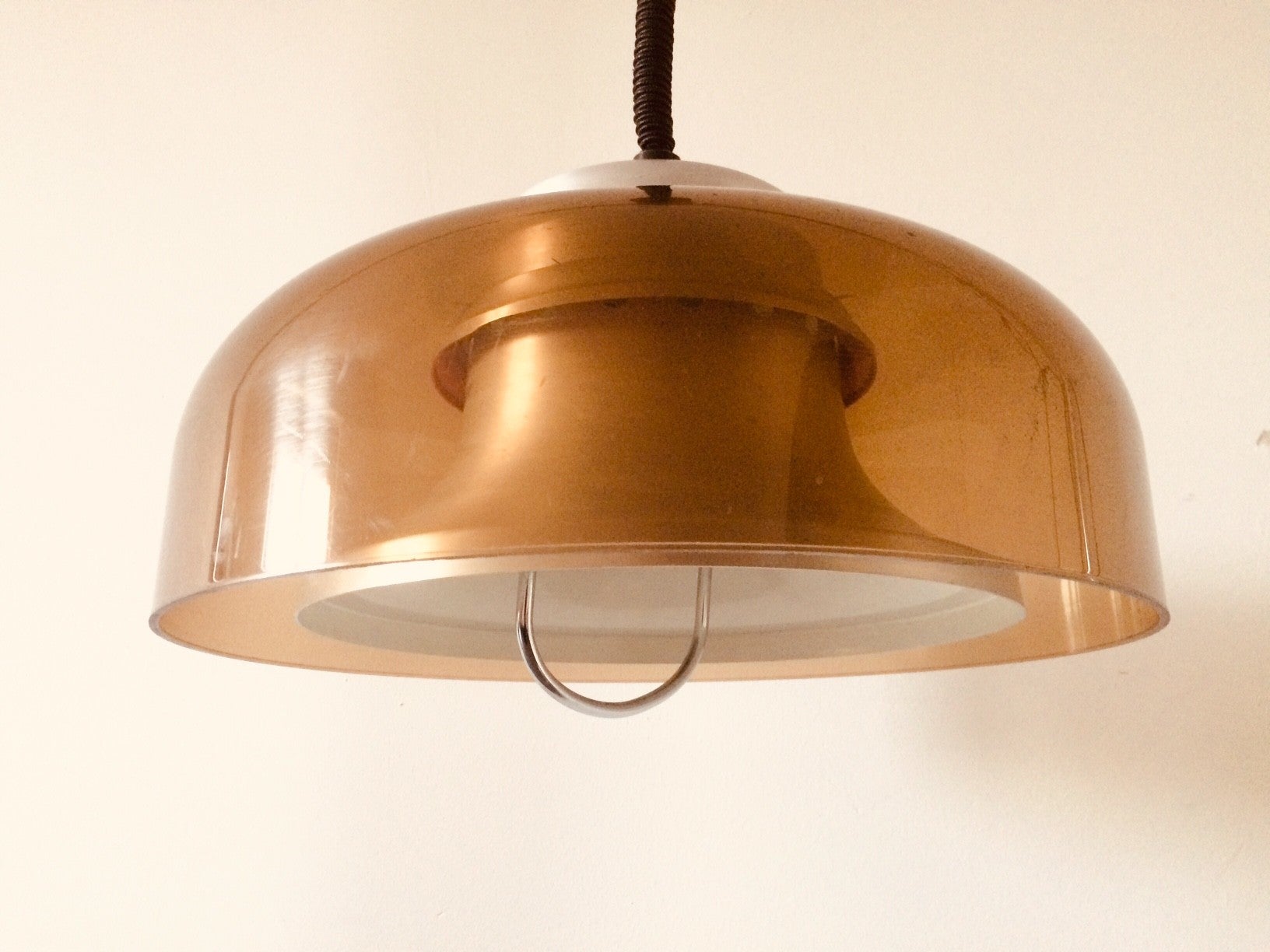 Vintage Midcentury Modern Dutch Design hight adjustable Pendant UFO hanging lamp, 1970's. Brown plastic shade with metal inner. In good condition. Shows wear. 40cm x 40cm x 25cm.