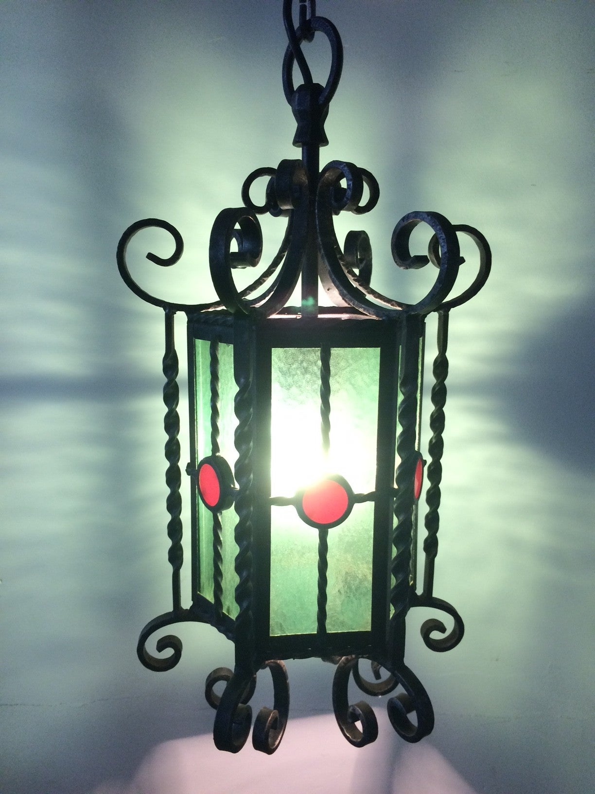 Vintage 1960's Midcentury Gothic Design Brutalist Lantern Pendant Hanging Lamp for the Landing from the 1960's. Cool wrought iron with green and red glass. In very good condition. Total height with chain; 105cm. Lantern measures: 53cm x 27cm x 27cm.