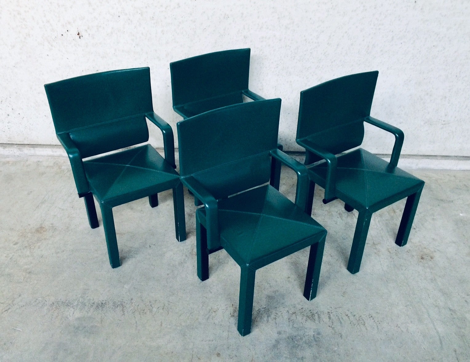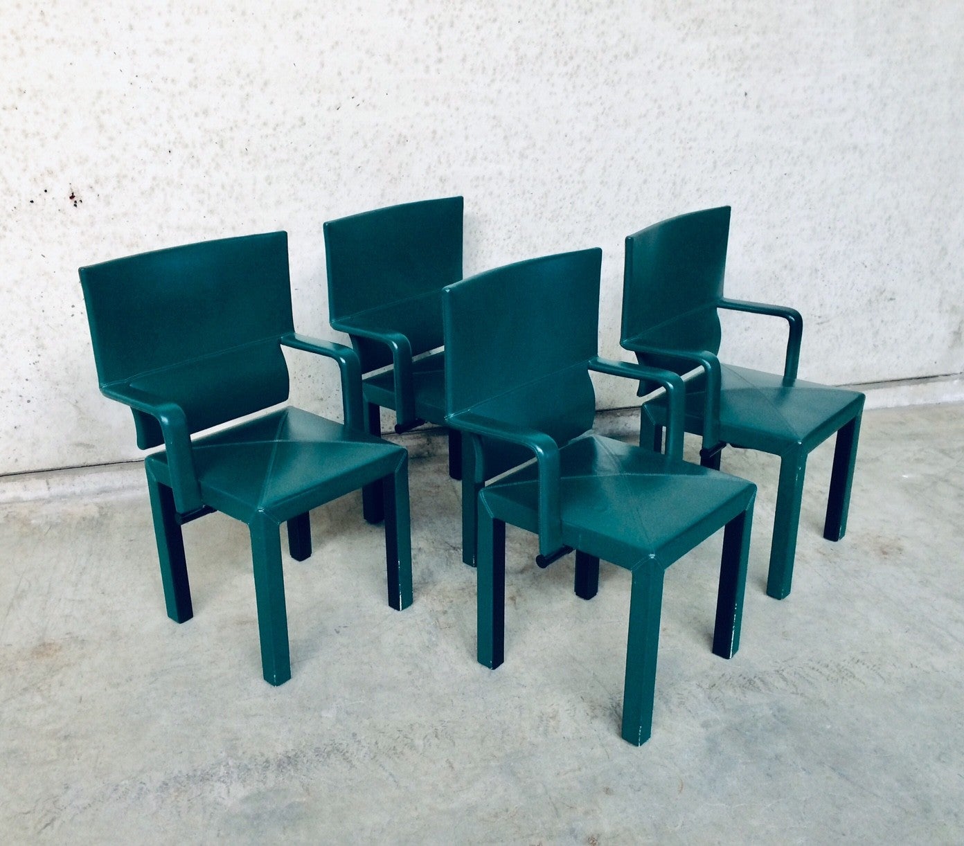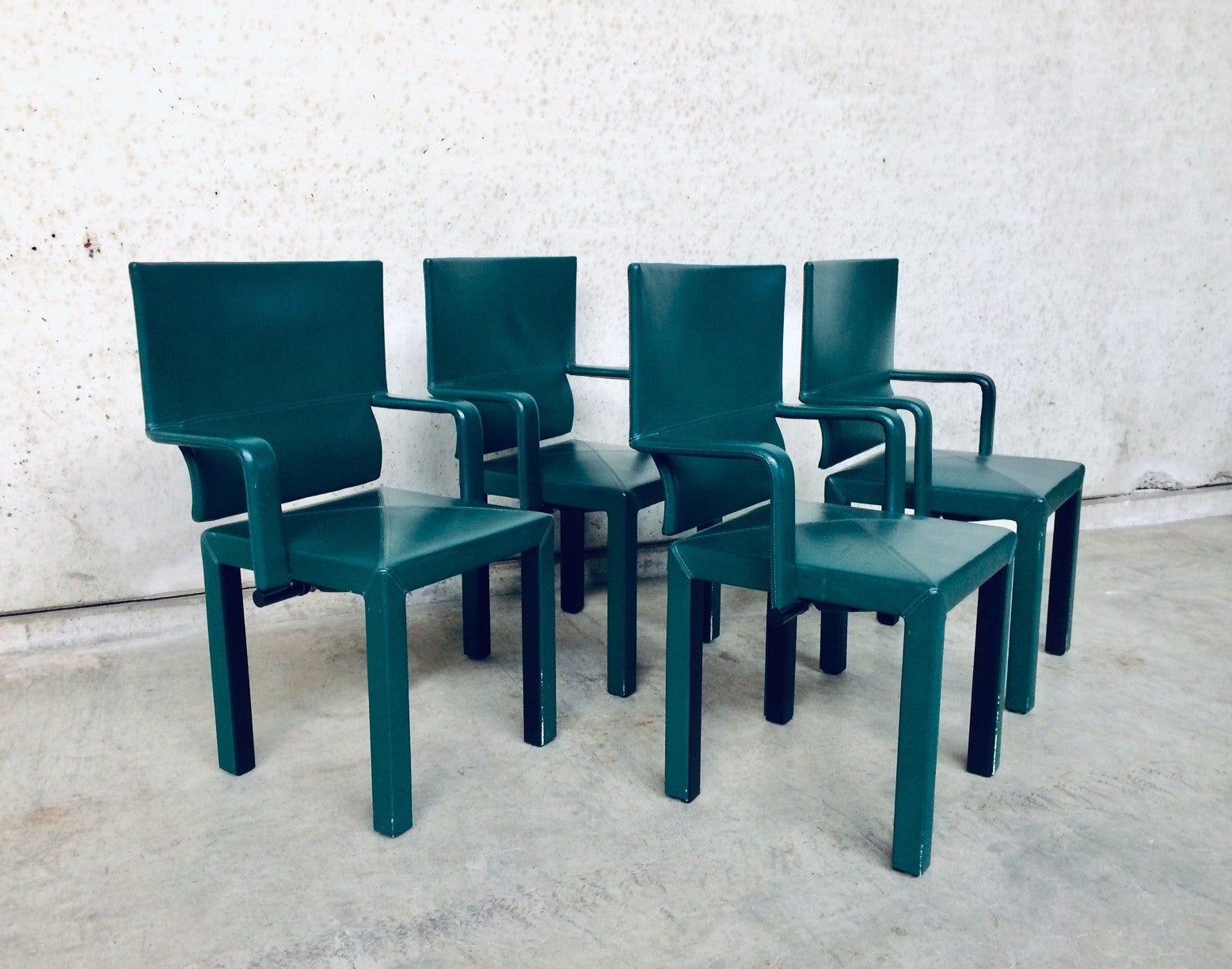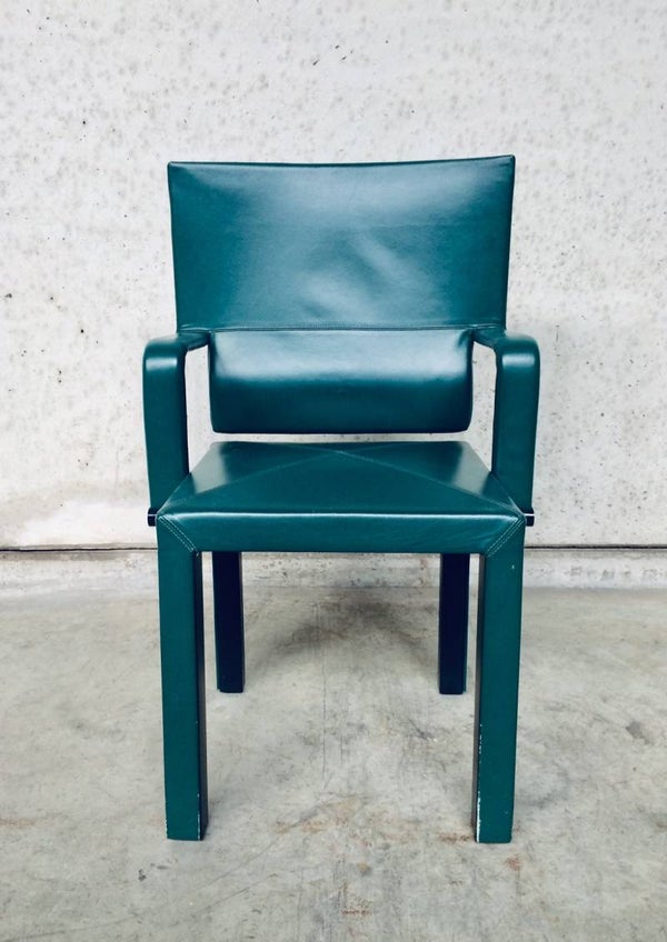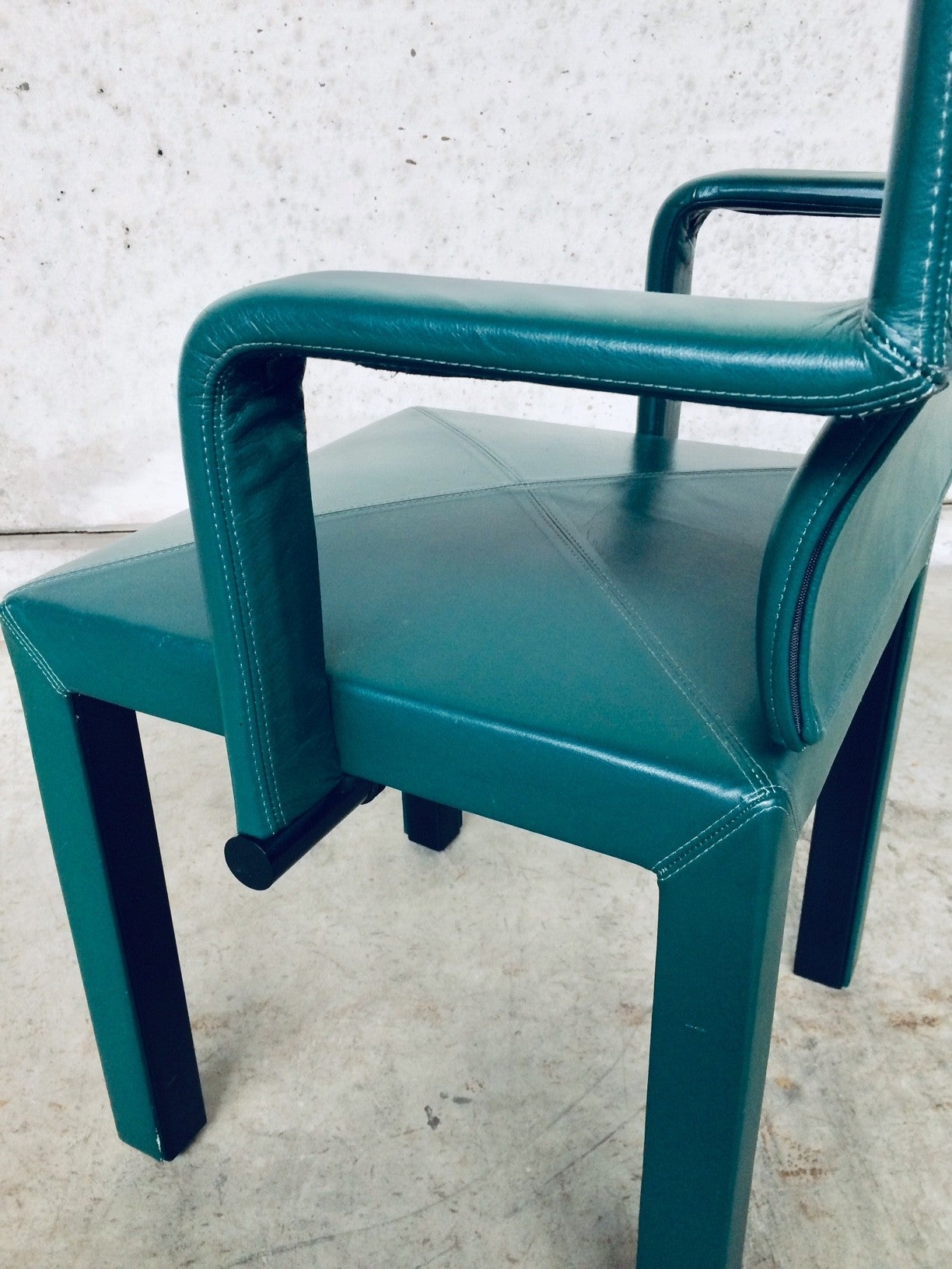 Vintage Postmodern Design B&B Italia Arcadia Arcona dining chair set of 4 arm chairs, designed by Paolo Piva, 1980's, Italy. Petrol green color leather. In very good condition, with normal wear for their age. Rare color set. Marked on the bottom.