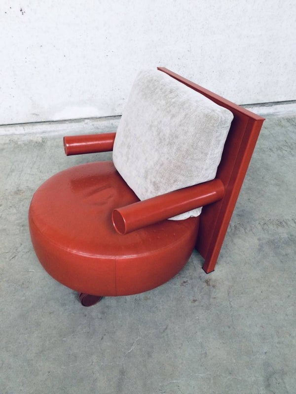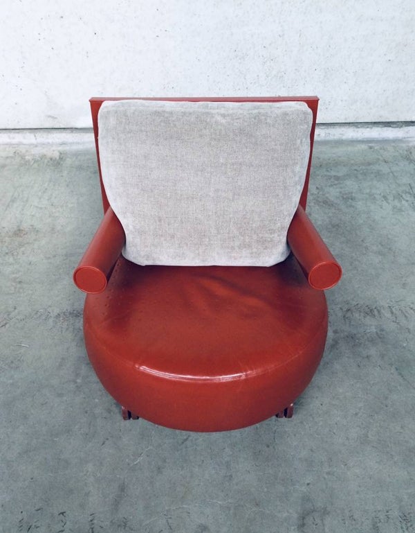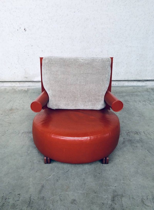 Vintage Postmodern Design B&B Italia Baisity Lounge Chair, round model, by Antonio Citterio, Italy, 1980's. Thick redish leather covered chair with dot pressed motif on seat, logo stamped on arm. Complete with original cushion. In very good condition.