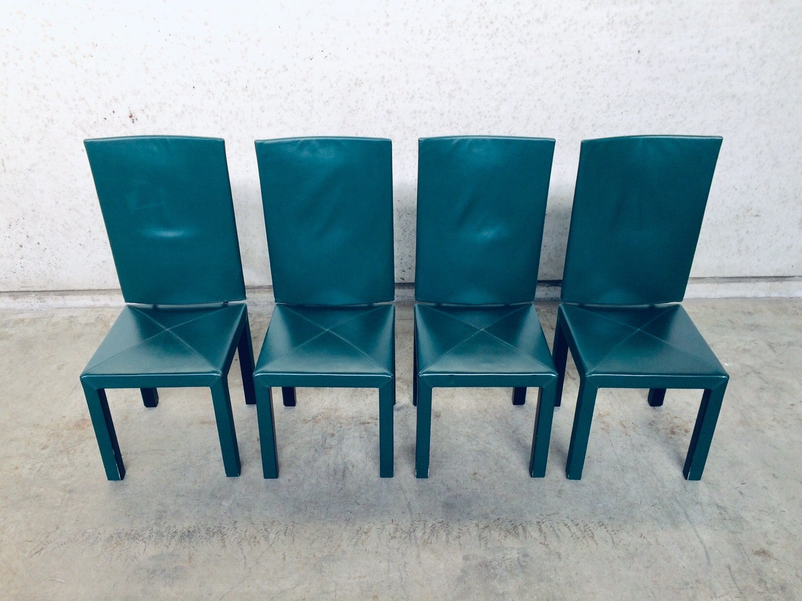 Vintage Postmodern Design B&B Italia Arcadia Arcara high back dining chair set of 4 by Paolo Piva, 1980's Italy. Petrol green color leather. In very good condition, with normal wear for their age. Rare color set. Marked on the bottom.