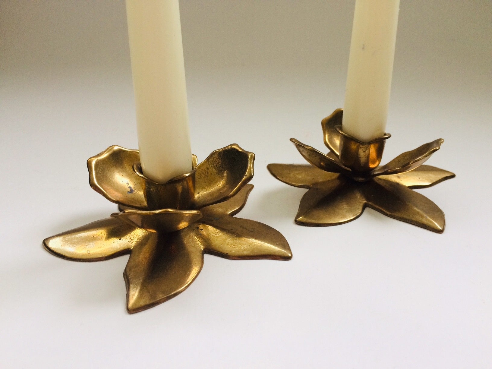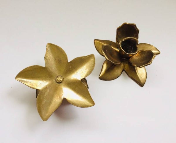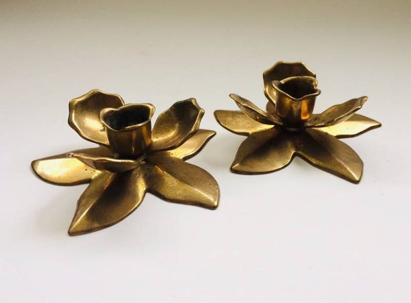 Vintage 1960's Midcentury Modern Design brass Flower candle stick holder set of 2. In very good condition. Each measures: 12cm x 12cm x 4cm.
