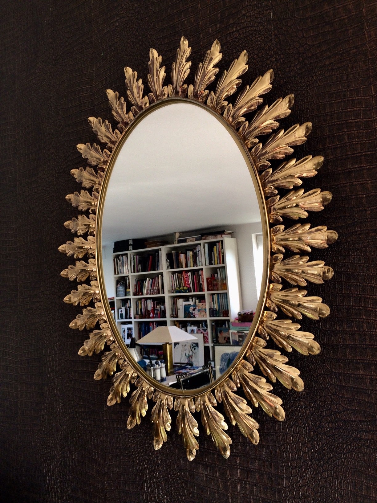 Vintage Midcentury Modern Design Oval Sunburst Brass Leaf Mirror by Deknudt, Belgium, 1950's. In very good condition. 71cm x 56cm.