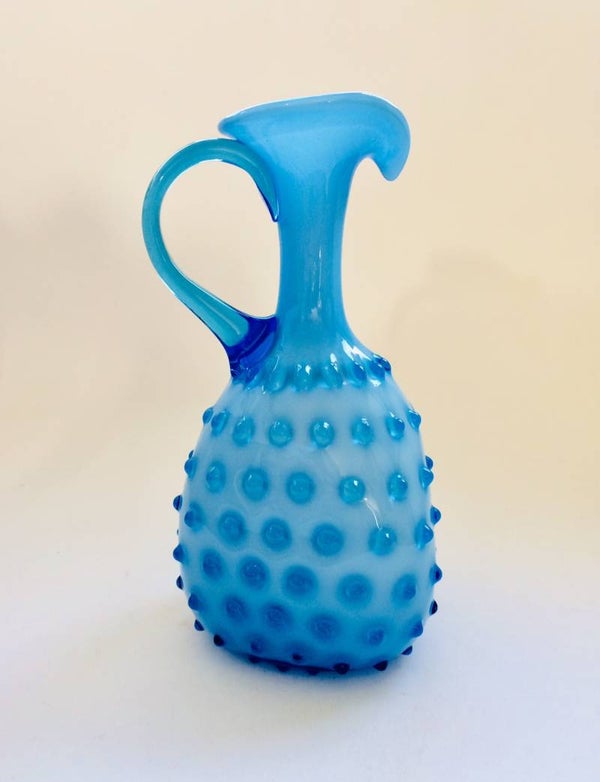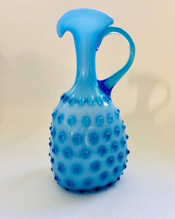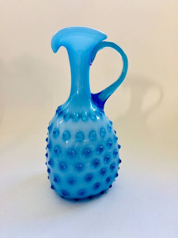 Vintage Midcentury Modern Italian Design Blue with white inner Glass Pitcher Vase by Empoli, Italy 1950's. In perfect condition. 29cm x 14cm x 15cm.