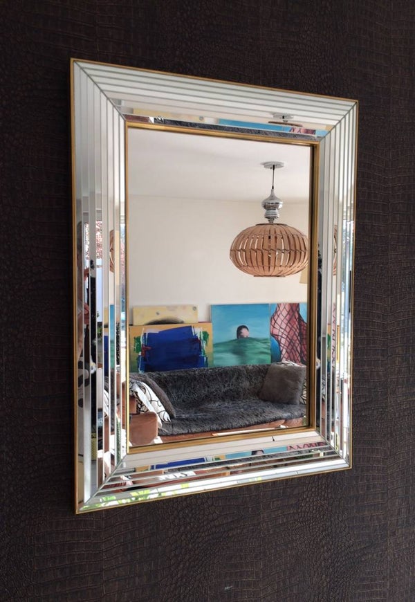 Hollywood Regency Style Large Brass Mirror w Mirrored Edge by Deknudt 1970's