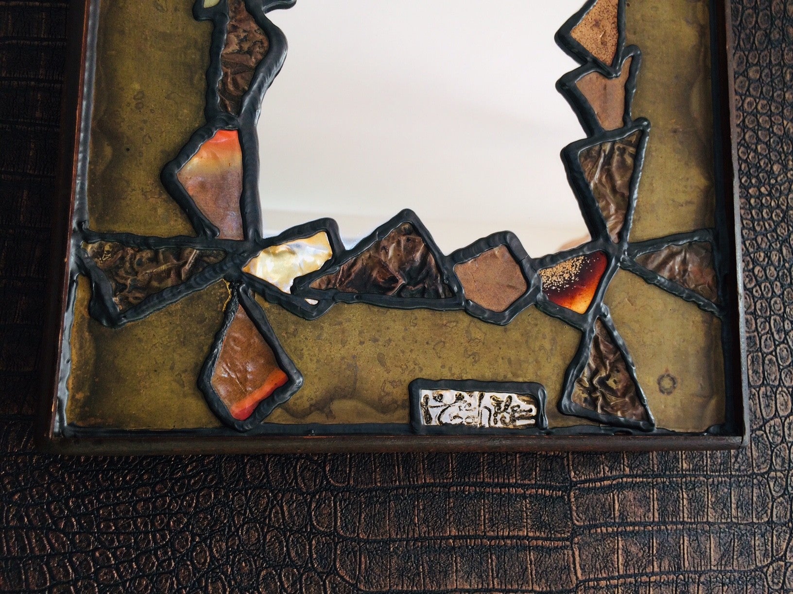 Vintage Midcentury Modern Brutalist Design metal, copper & brass patchwork Art mirror, 1960's France. Signed by artist. Inspired by the work of Paul Evans and Line Vautrin. The mirror is a patchwork of different types of metal and are held together with lead strips like stained glass. 53cm x 26cm x 3cm.