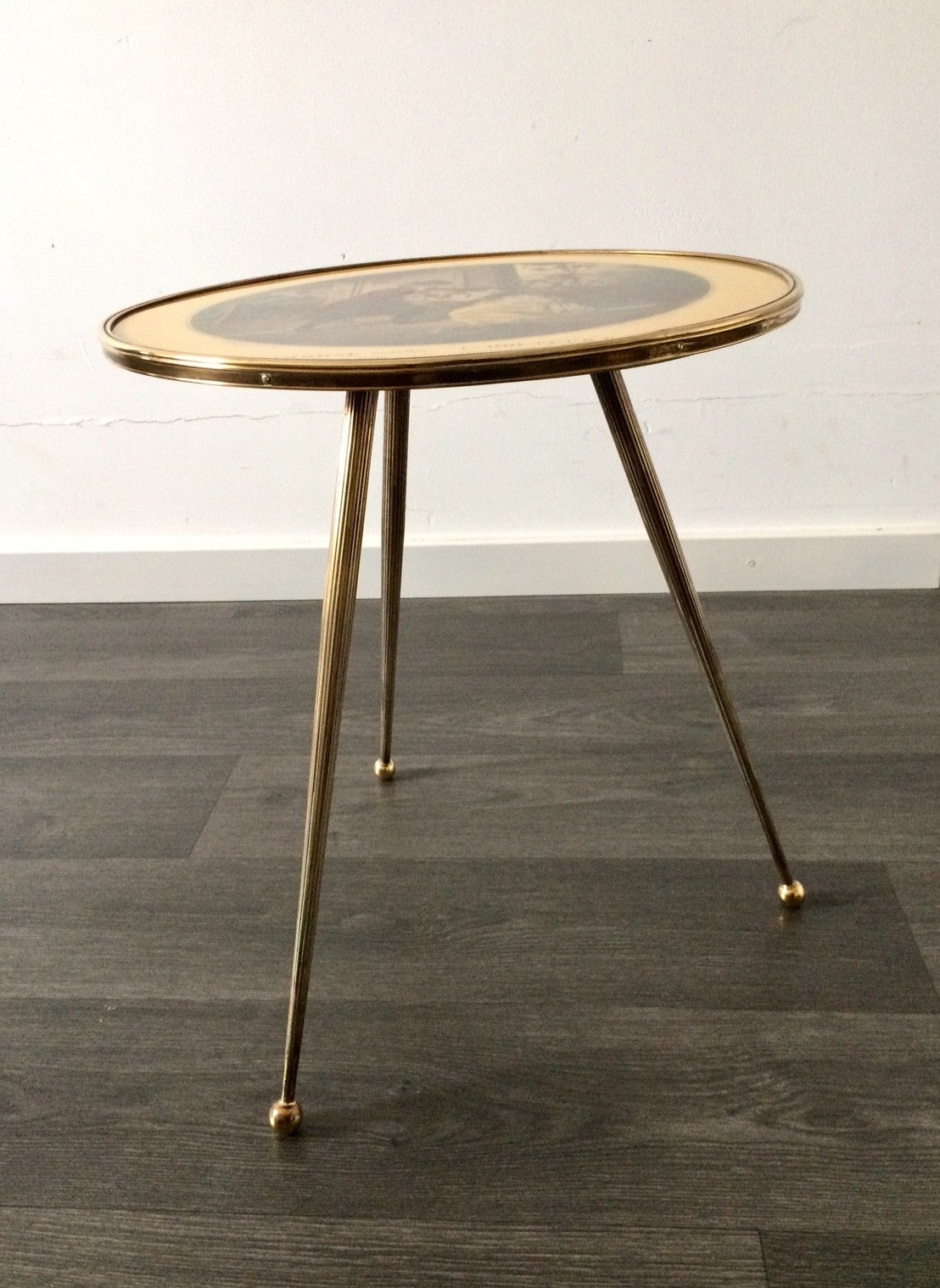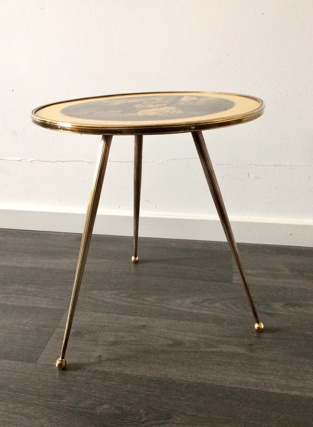 Italian Design Brass Tripod Side Table w printed top 1950's