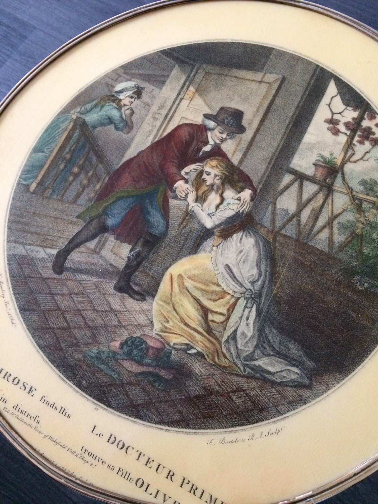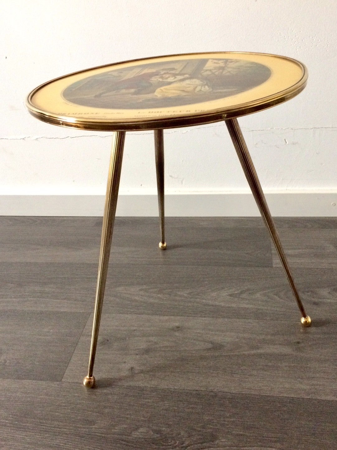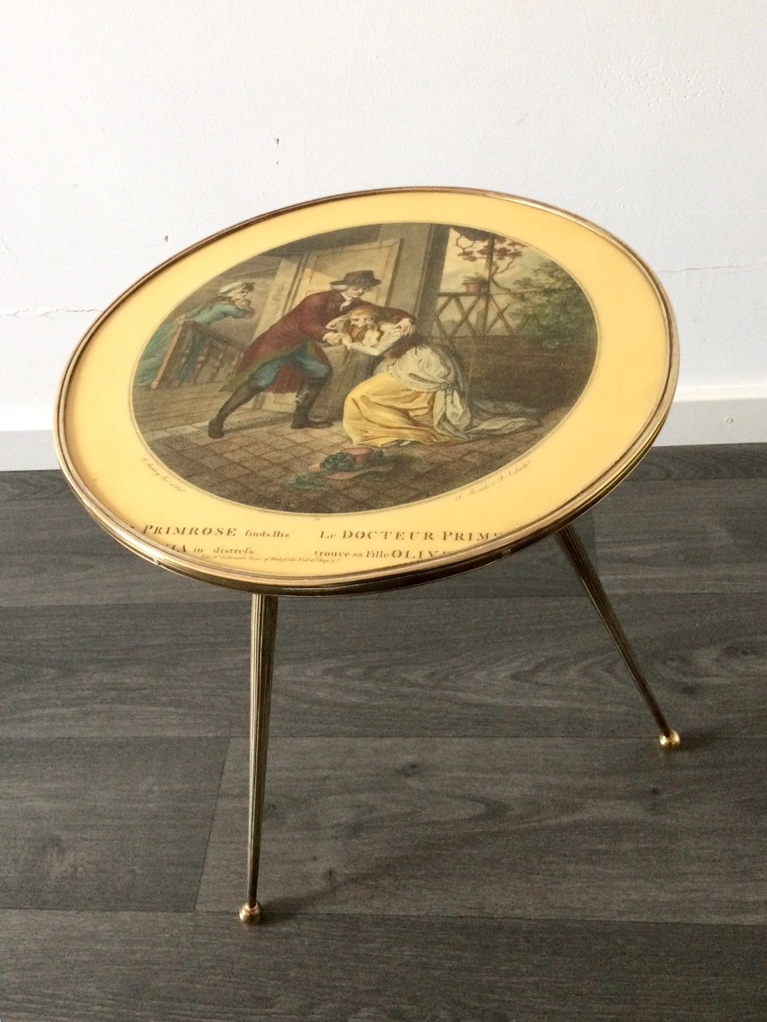 Vintage Midcentury Modern Design brass tripod side table with 19th century novel cover laquered print. In the style of Fornasseti. Made in Italy, 1950's. In good condition. 40,5cm x 40,5cm x 44,5cm. Legs can be unscrewed for easy transport.