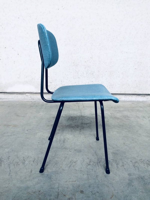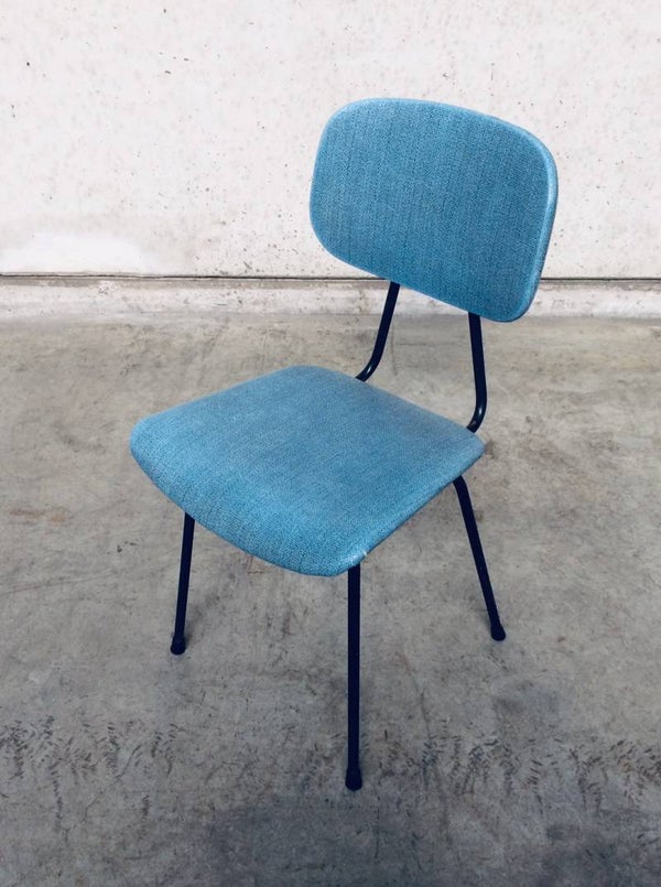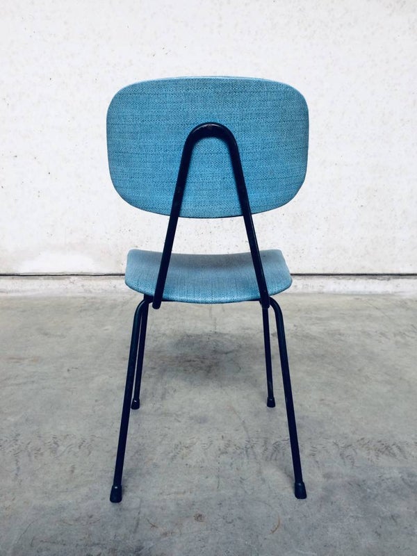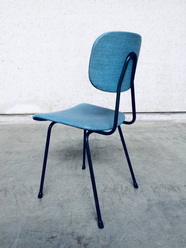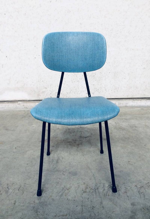Vintage Midcentury Modern Design Kitchen Chair in the style of Pierre Guariche, France 1950's. Black metal frame with blue skai cover. In good condition.